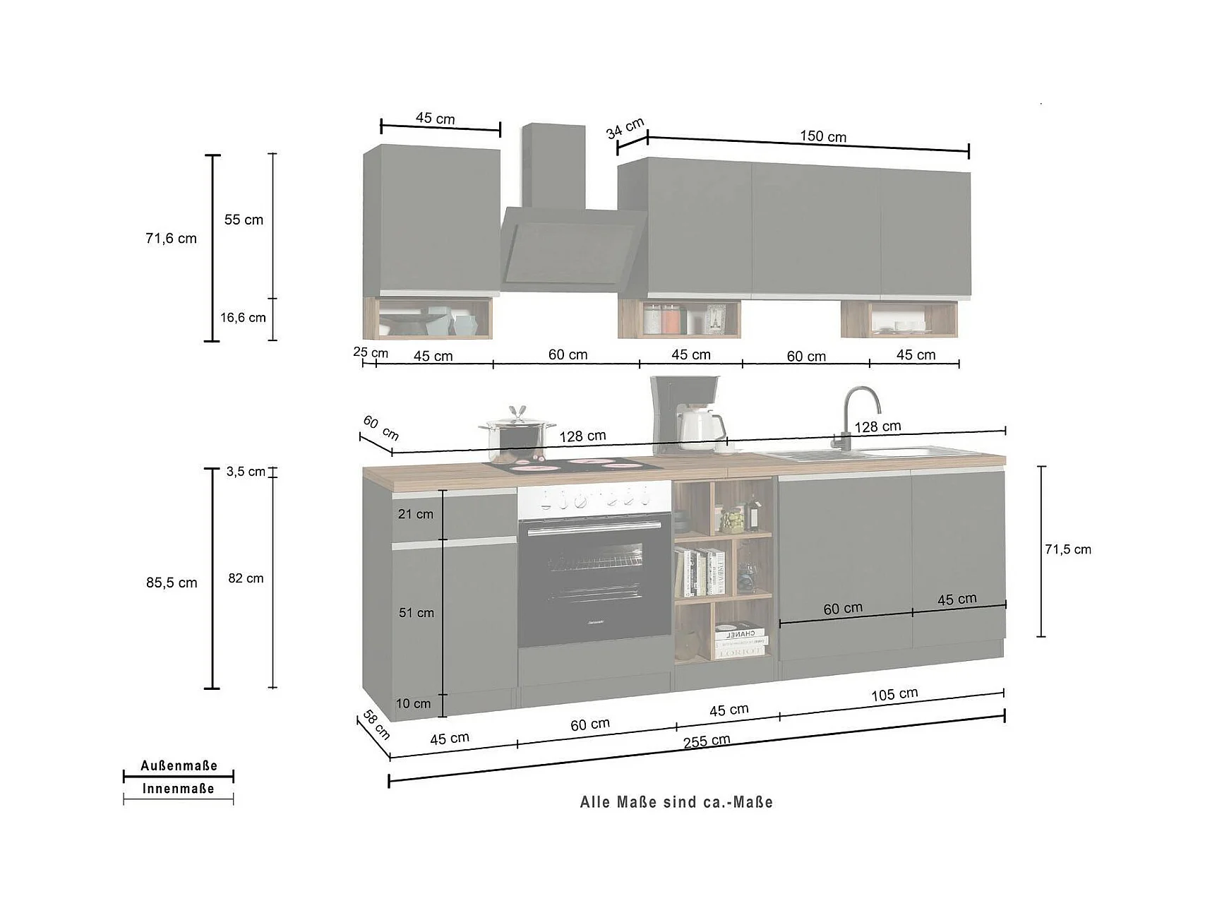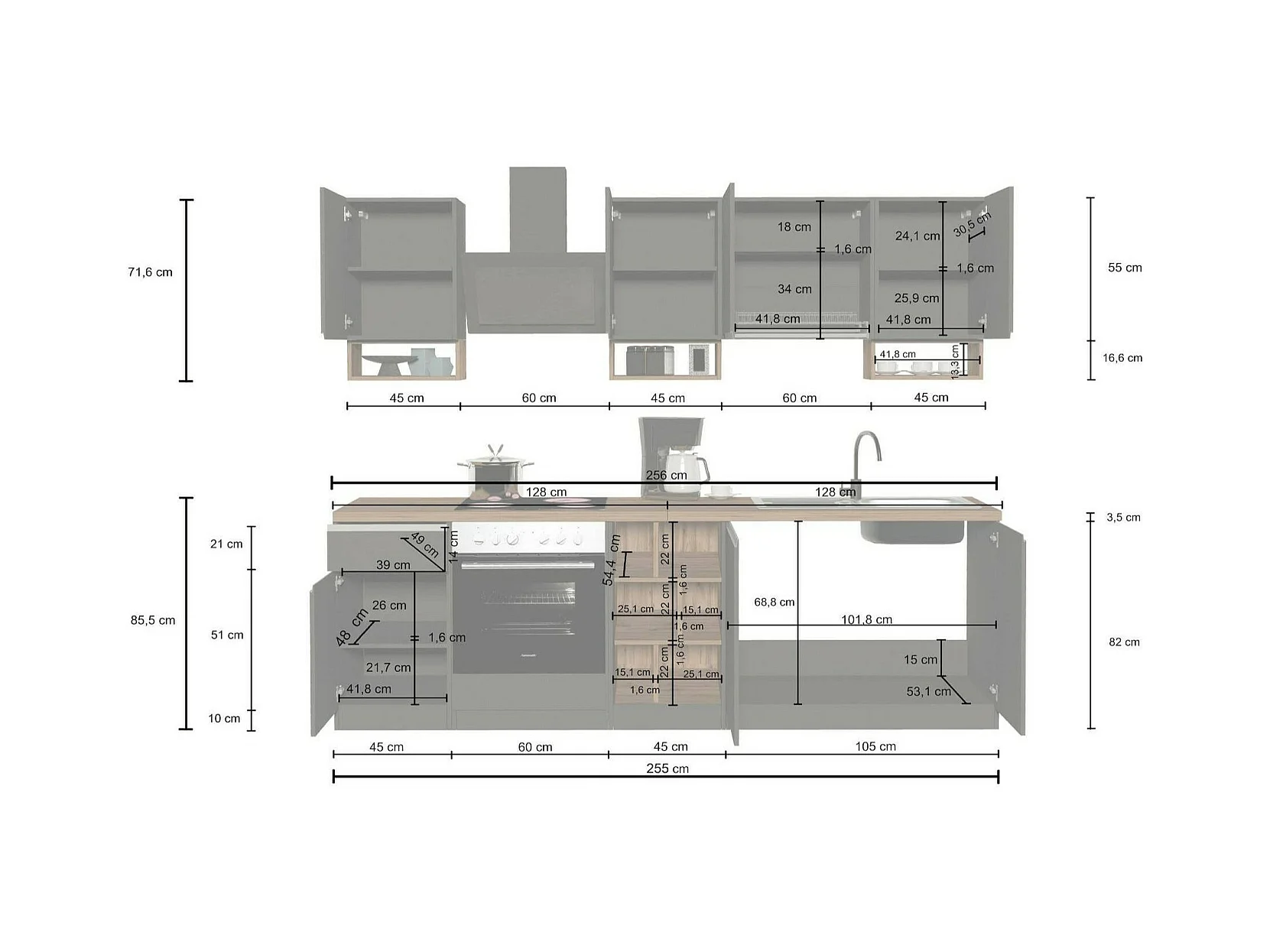 Dmora - Cucina completa Fonti, 255x60h85 cm, Bianco lucido e Ardesia