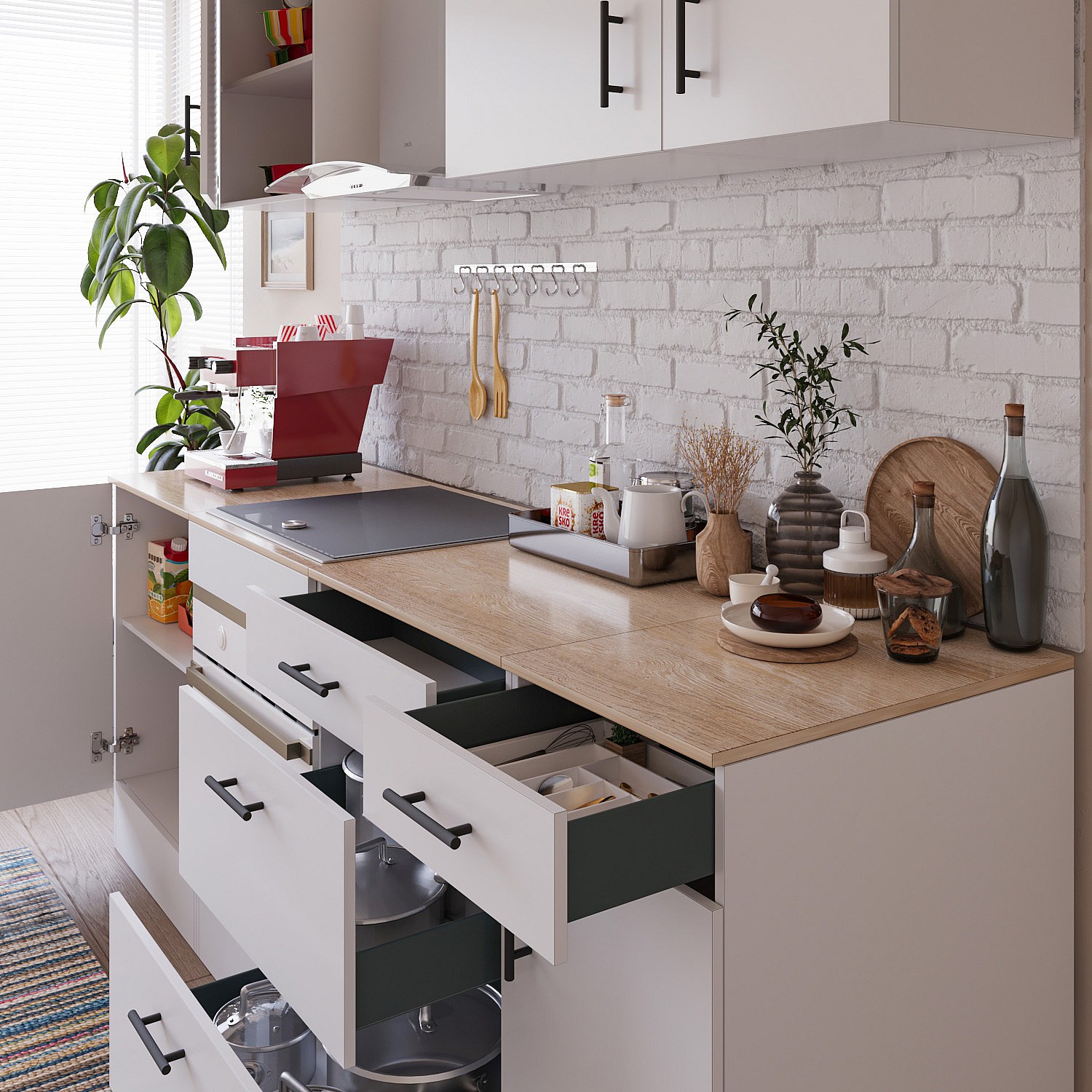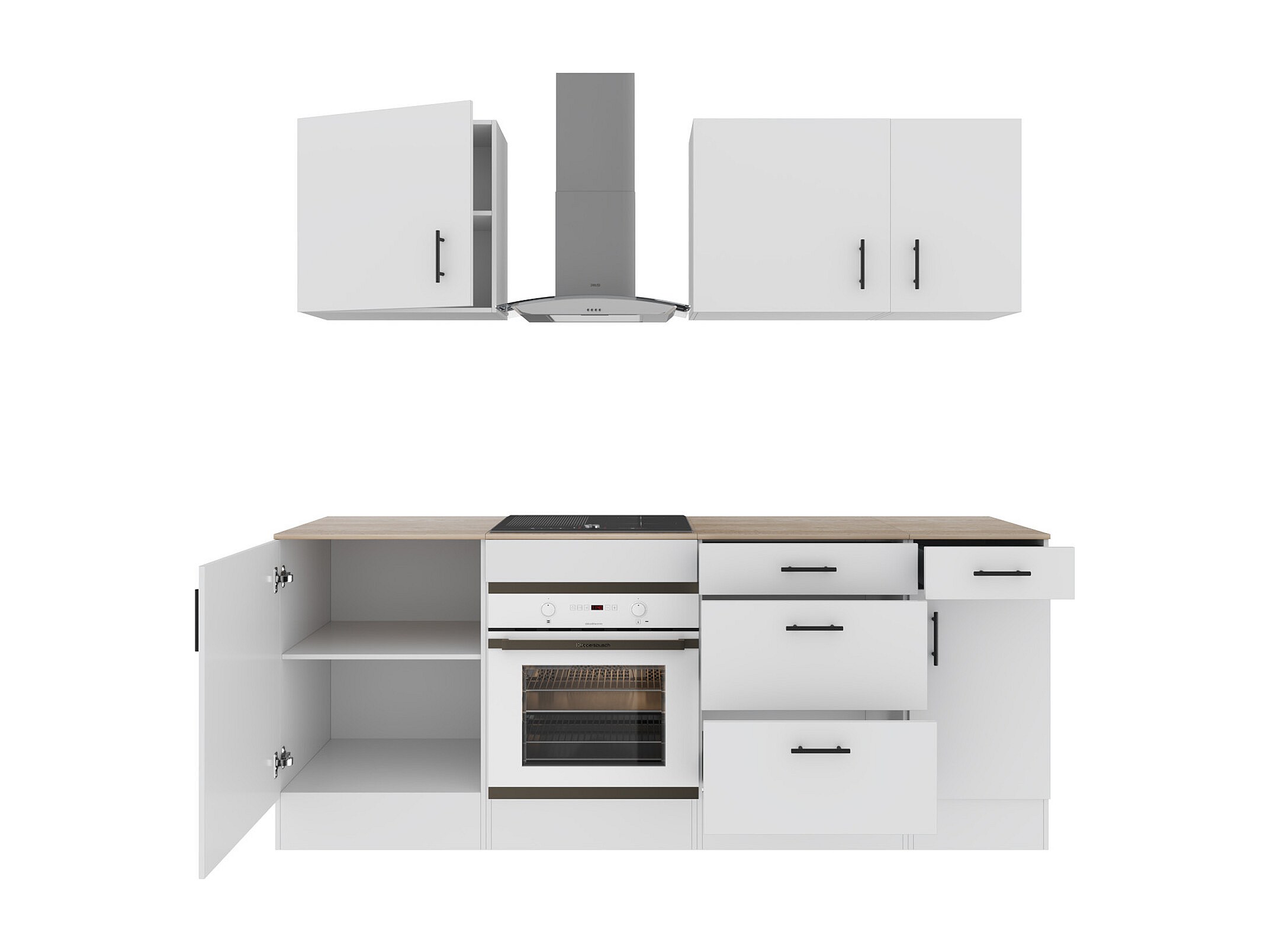 Cucina Componibile Completa Da 220 Cm Moderna Salvaspazio con Cassetti Ammortizzati Piedini Regolabili Moduli Pensili Facile Da Installare Bianco Lucido e Rovere