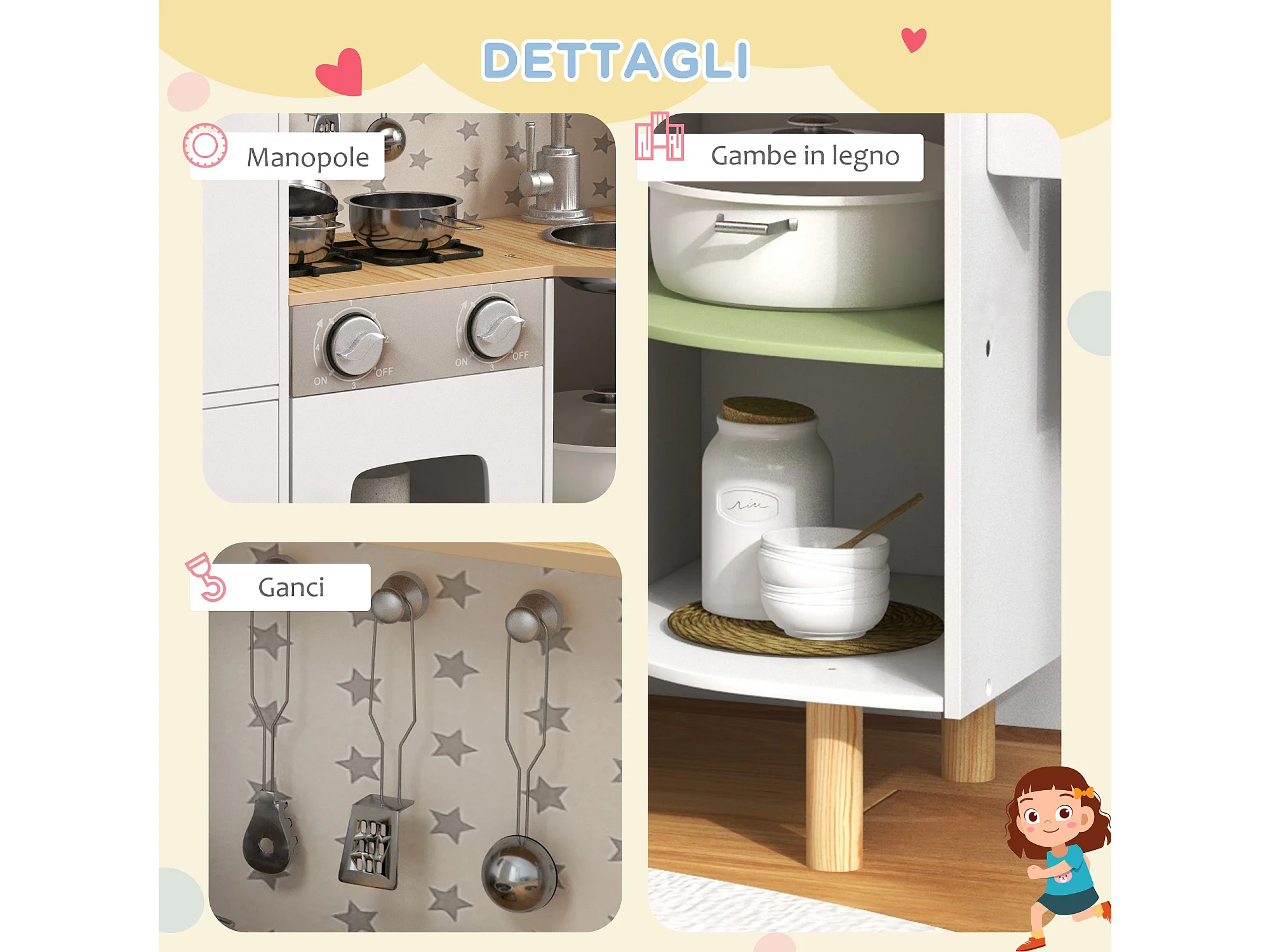 Cucina giocattolo in legno per bambini con utensili in acciaio