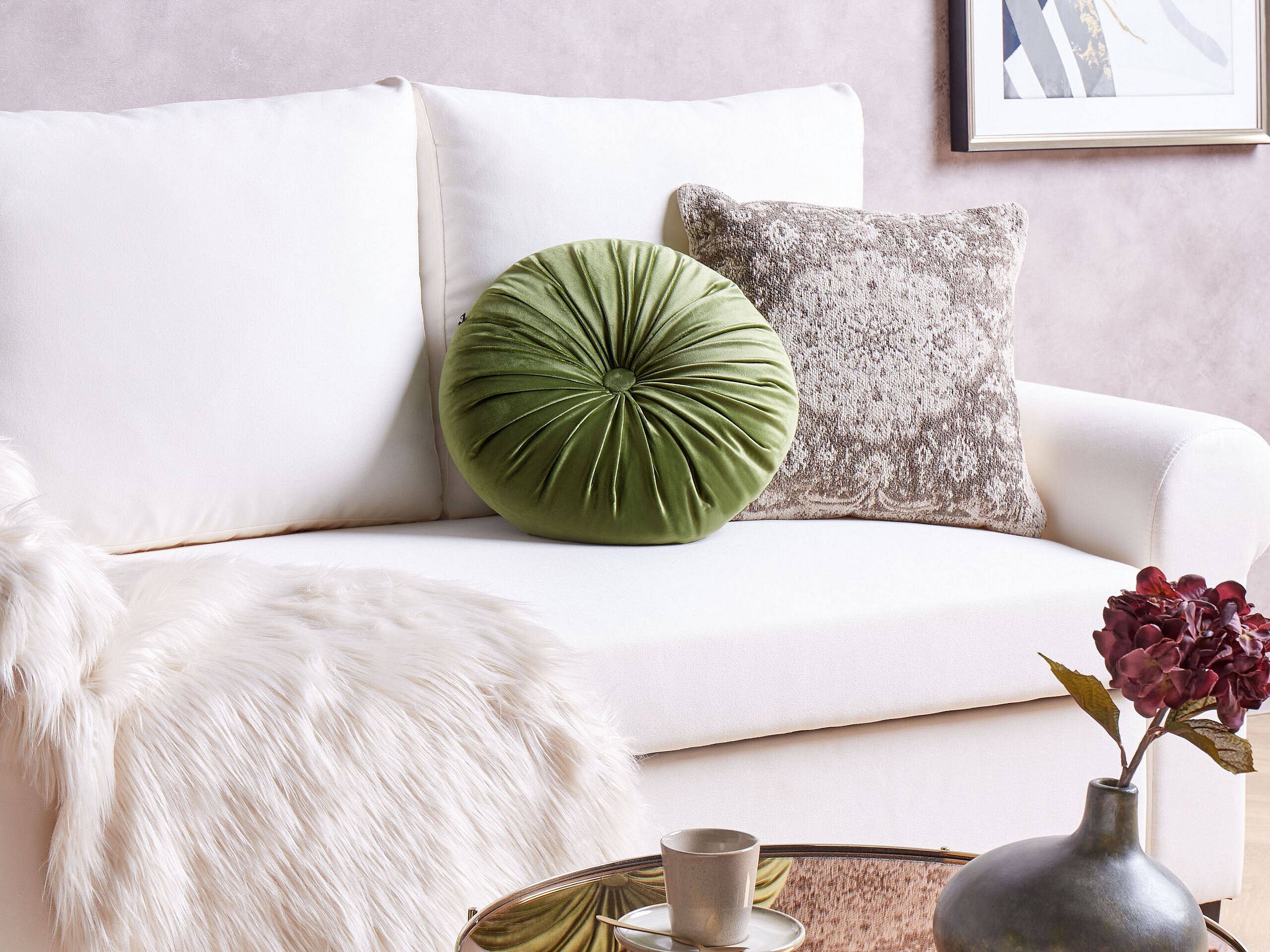Cuscino decorativo rotondo. Migliora il tuo comfort con questo cuscino decorativo. Concediti la sensazione sontuosa del morbido velluto, arricchita da eleganti pieghe che aggiungono un tocco di raffinatezza. L'imbottitura soffice garantisce un'esperienza lussuosa e confortevole, rendendolo un'aggiunta perfetta ai tuoi spazi di relax. Valorizza il tuo arredamento con la forma unica rotonda, che offre sia interesse visivo che un rifugio accogliente per momenti di tranquillità. Trasforma qualsiasi angolo in un rifugio lussuoso con questa bellezza in velluto.