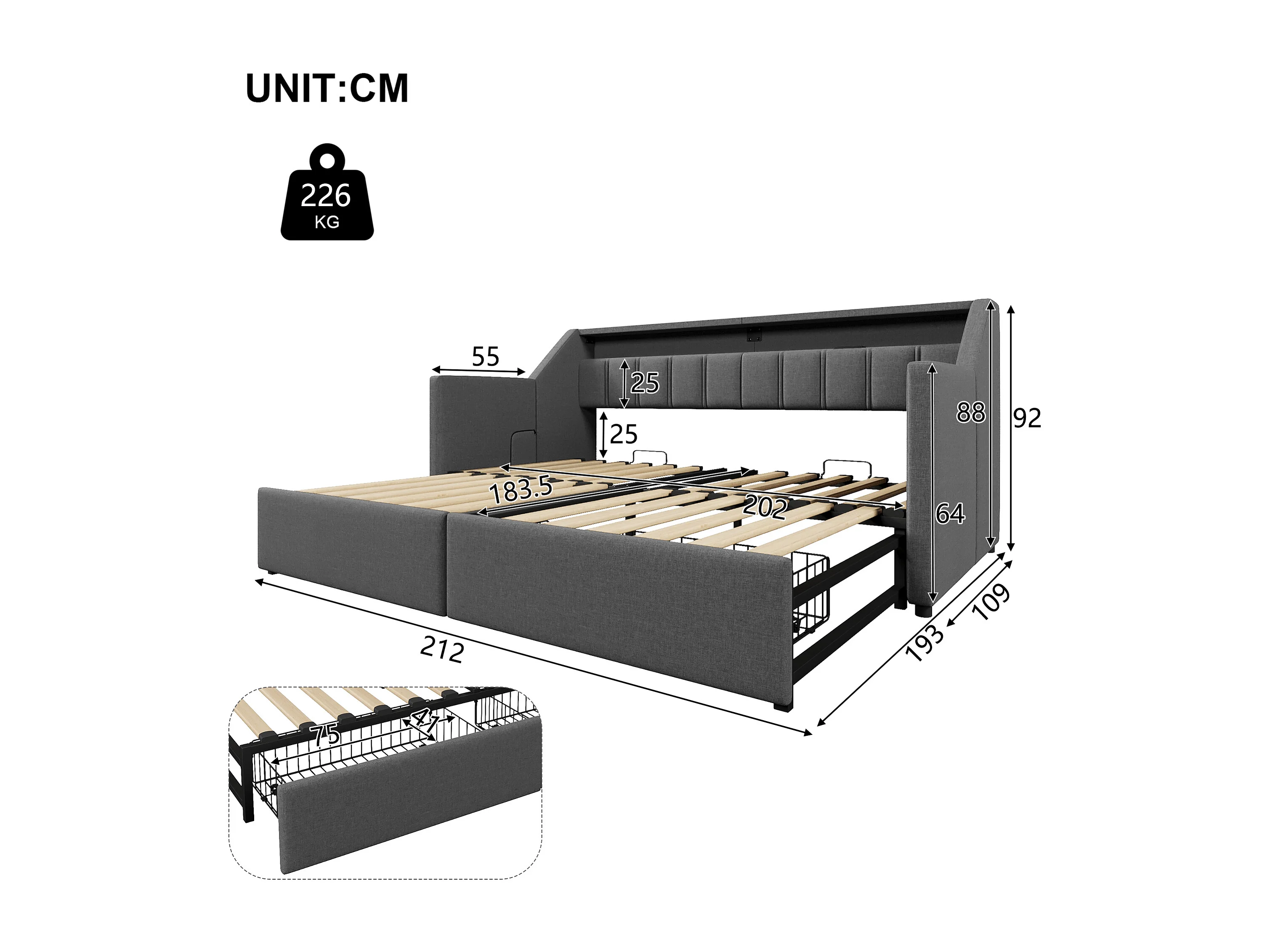 Daybed 90x200 tessuto grigio LED USB Type-C 2 posizioni Rangement Lit estensibile multifunzione