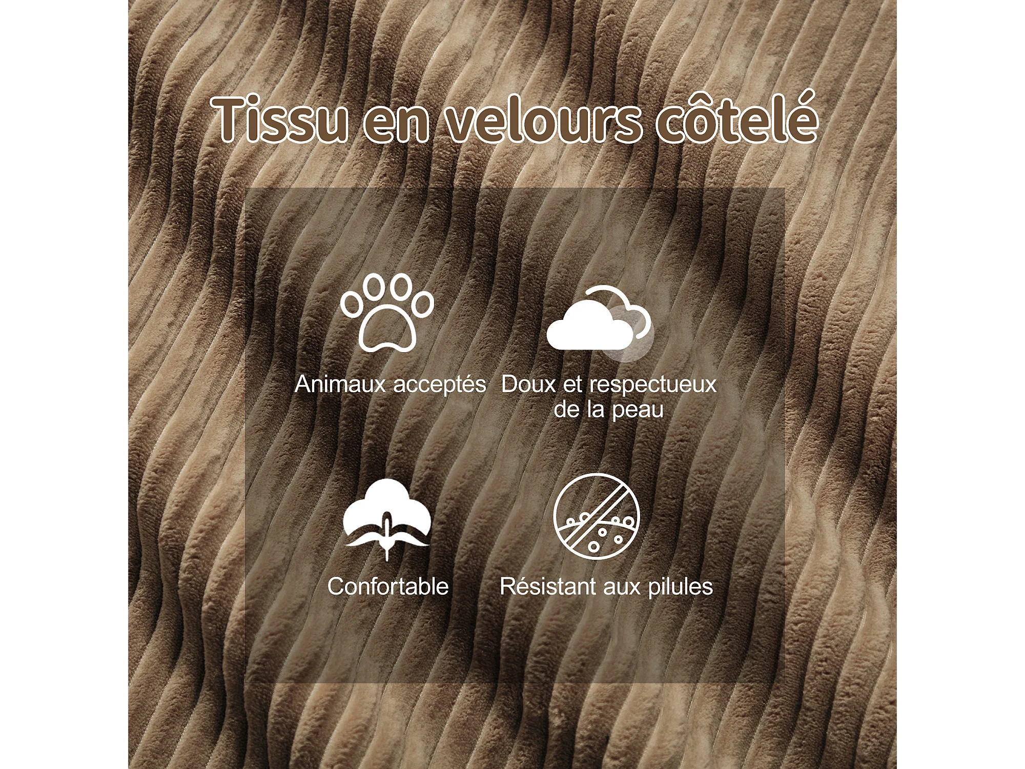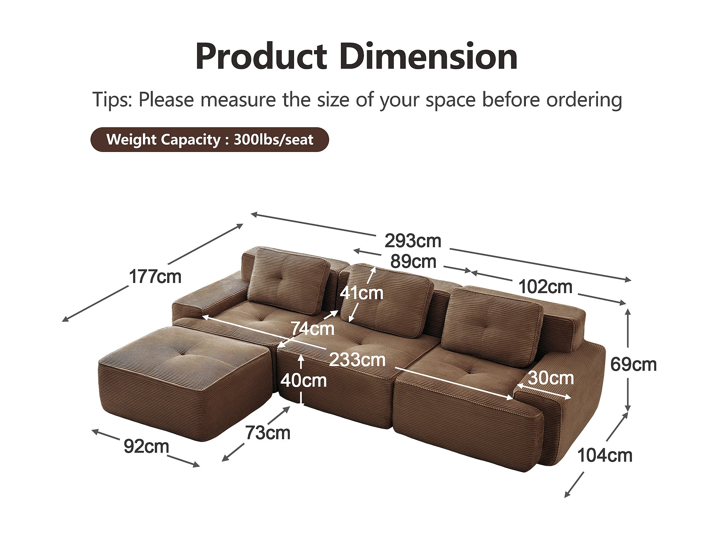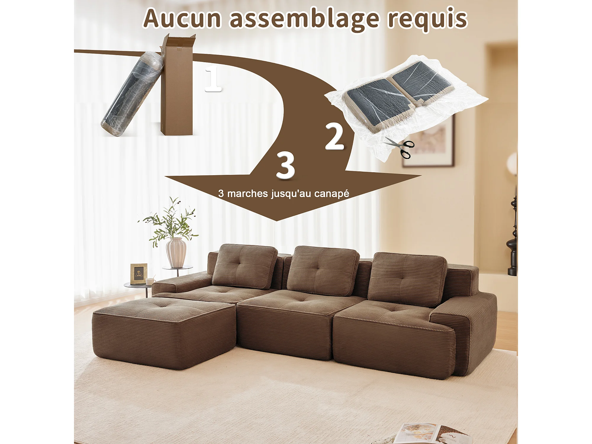 Divano 3 posti Angolare Modulare in Velluto costola, con pouf e 3 cuscini, 293x177x69cm, Marrone