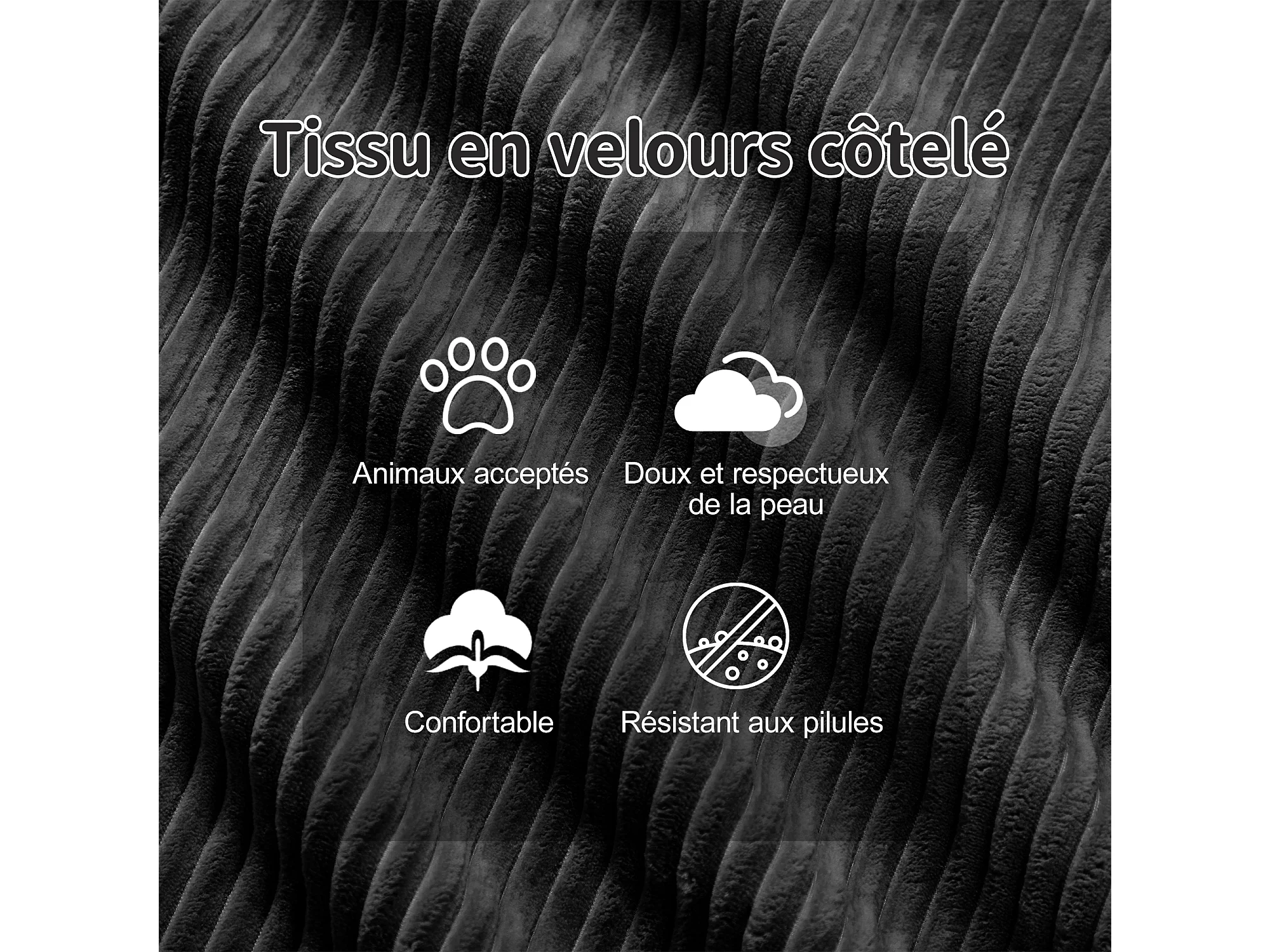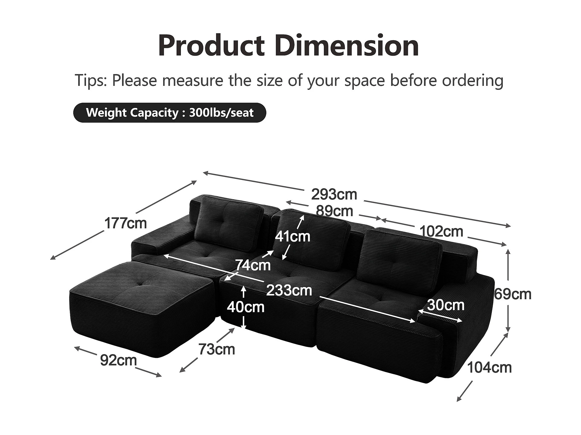 Divano 3 posti Angolare Modulare in Velluto costola, con pouf e 3 cuscini, 293x177x69cm, Nero