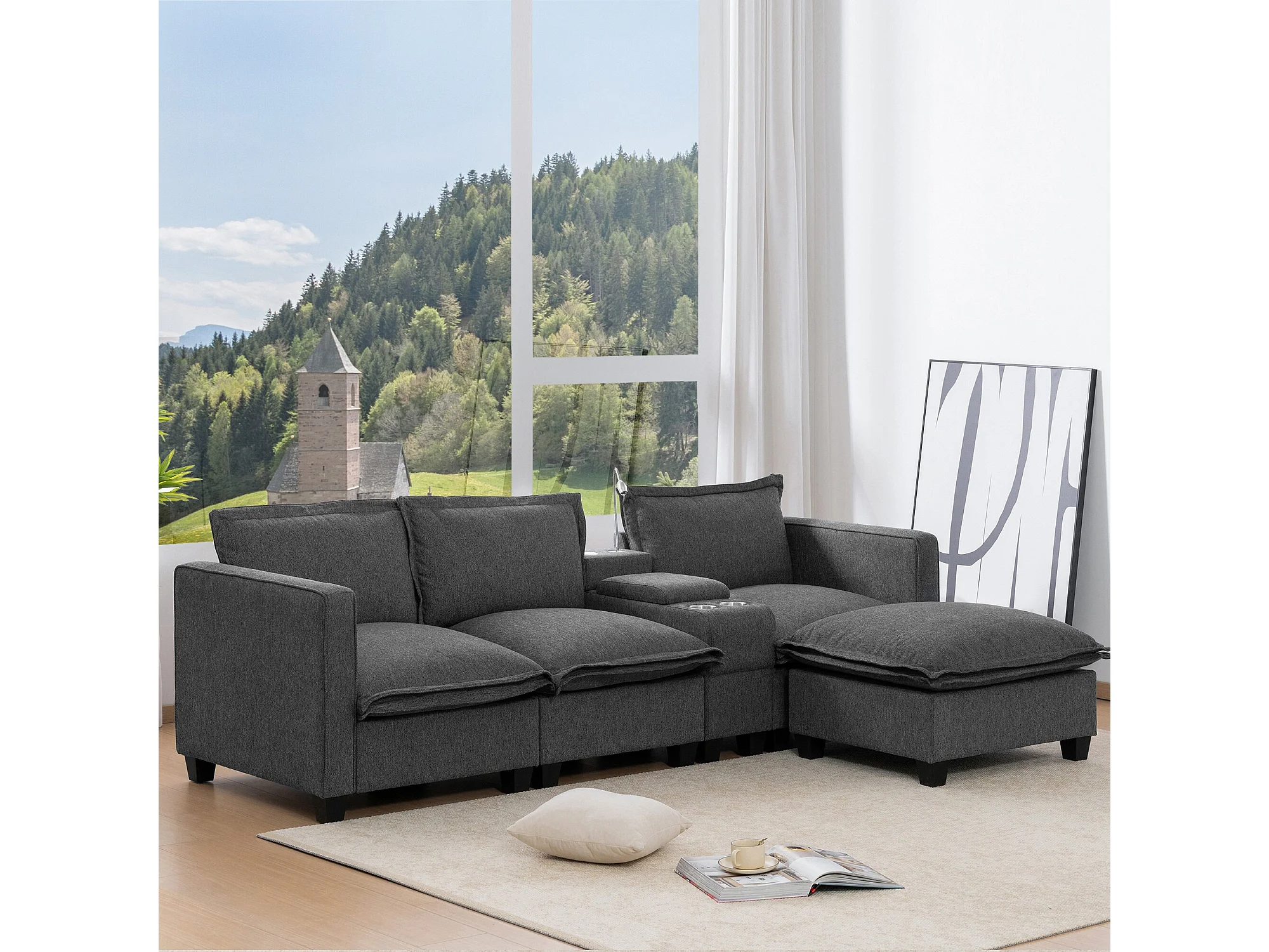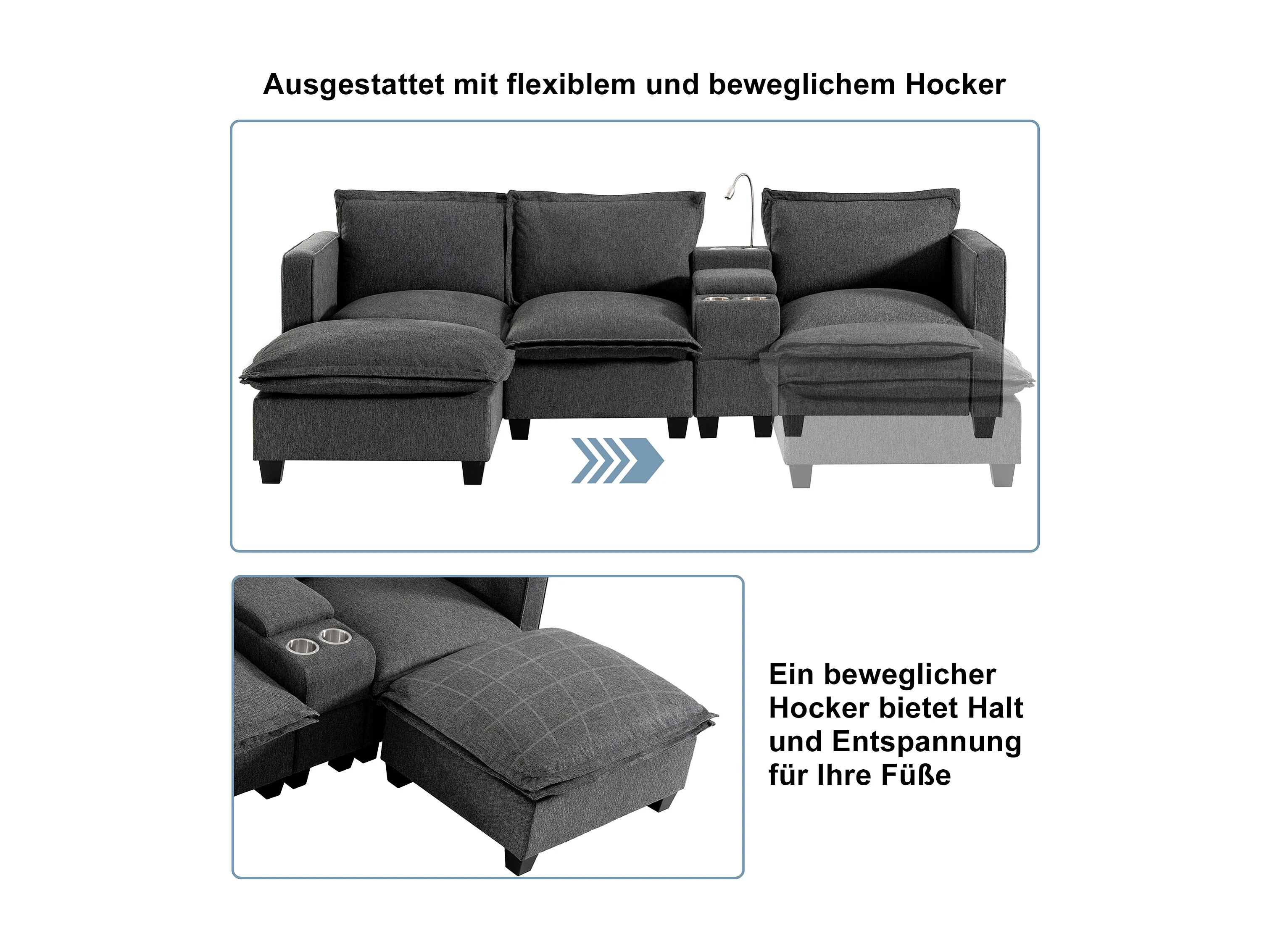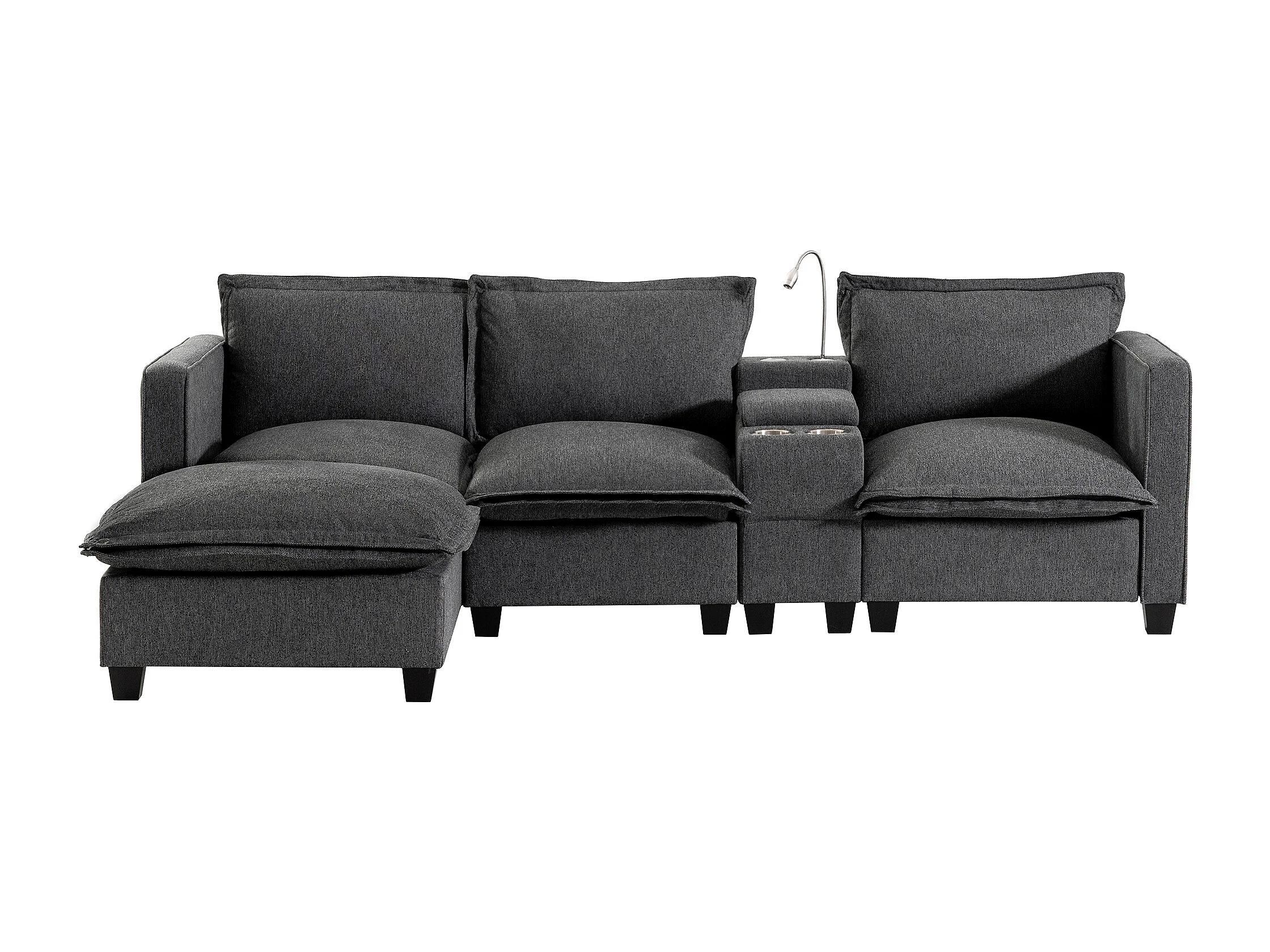 Divano 3 posti in ciniglia con poggiapiedi + porta di ricarica USB + lampada da lettura + portabicchieri - 243 x 154 x 84 cm - Grigio