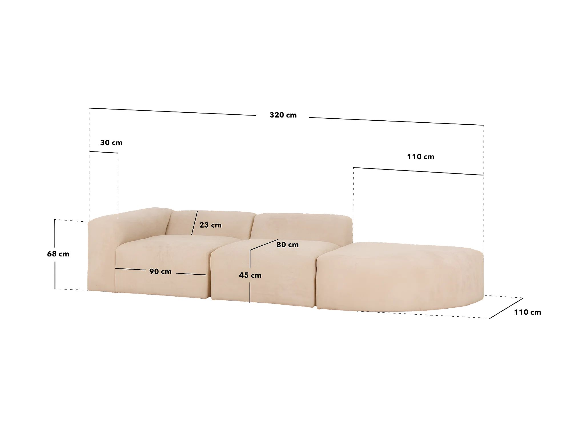 Divano a 3 moduli curva sinistra bouclé colore grigio chiaro 320x110cm