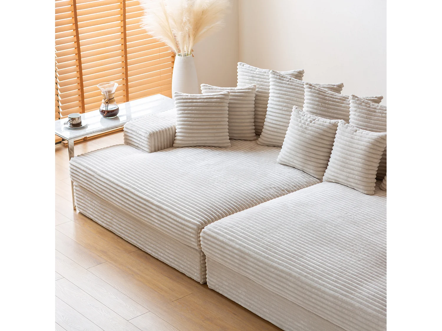Divano a U in ciniglia beige, imbottito con cuscini e 2 cuscini decorativi, adatto per soggiorno e camera da letto