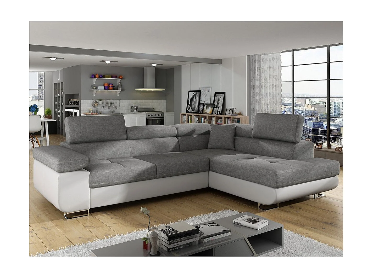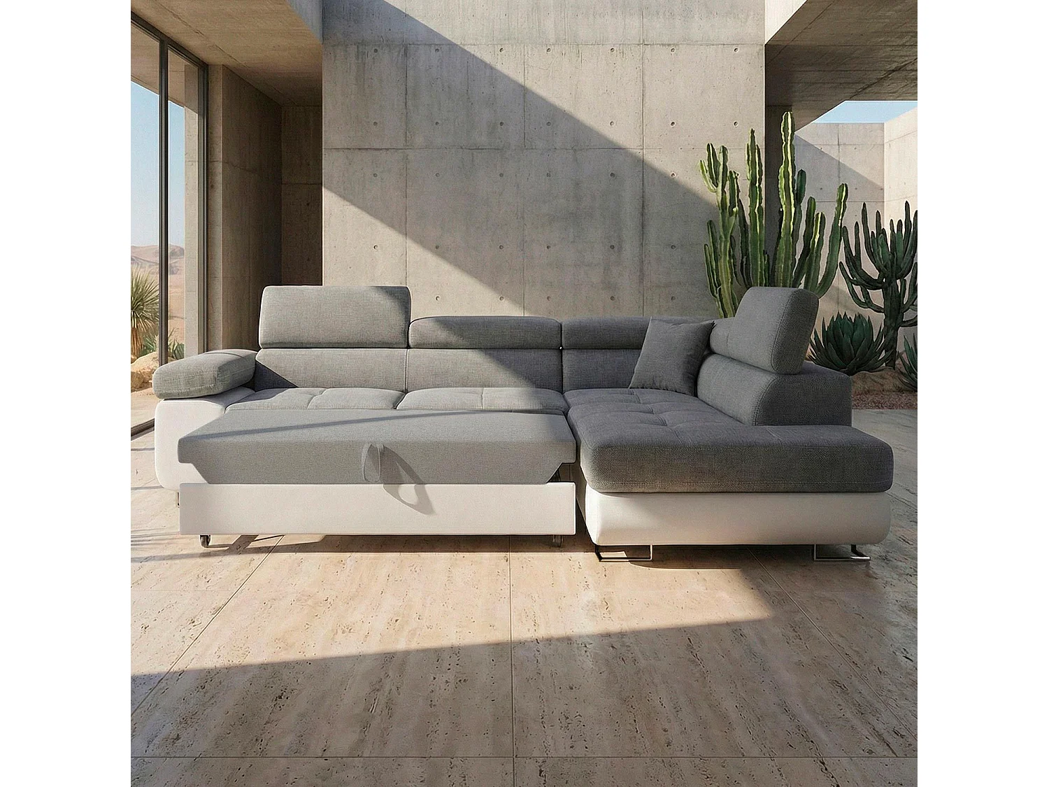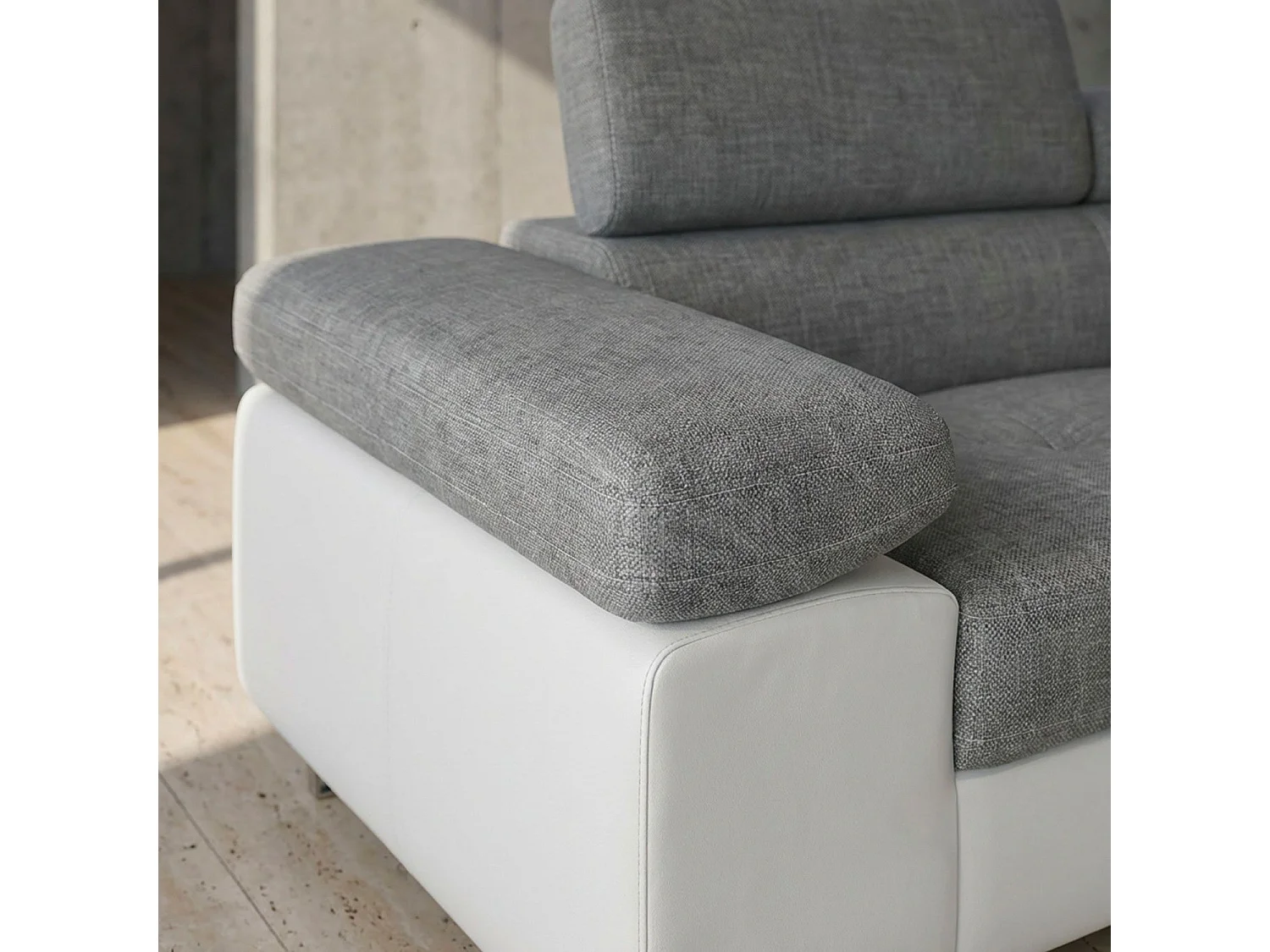 Divano ad angolo destro trasformabile Antoni con poggiatesta alzabili in similpelle bianca e tessuto grigio chiaro