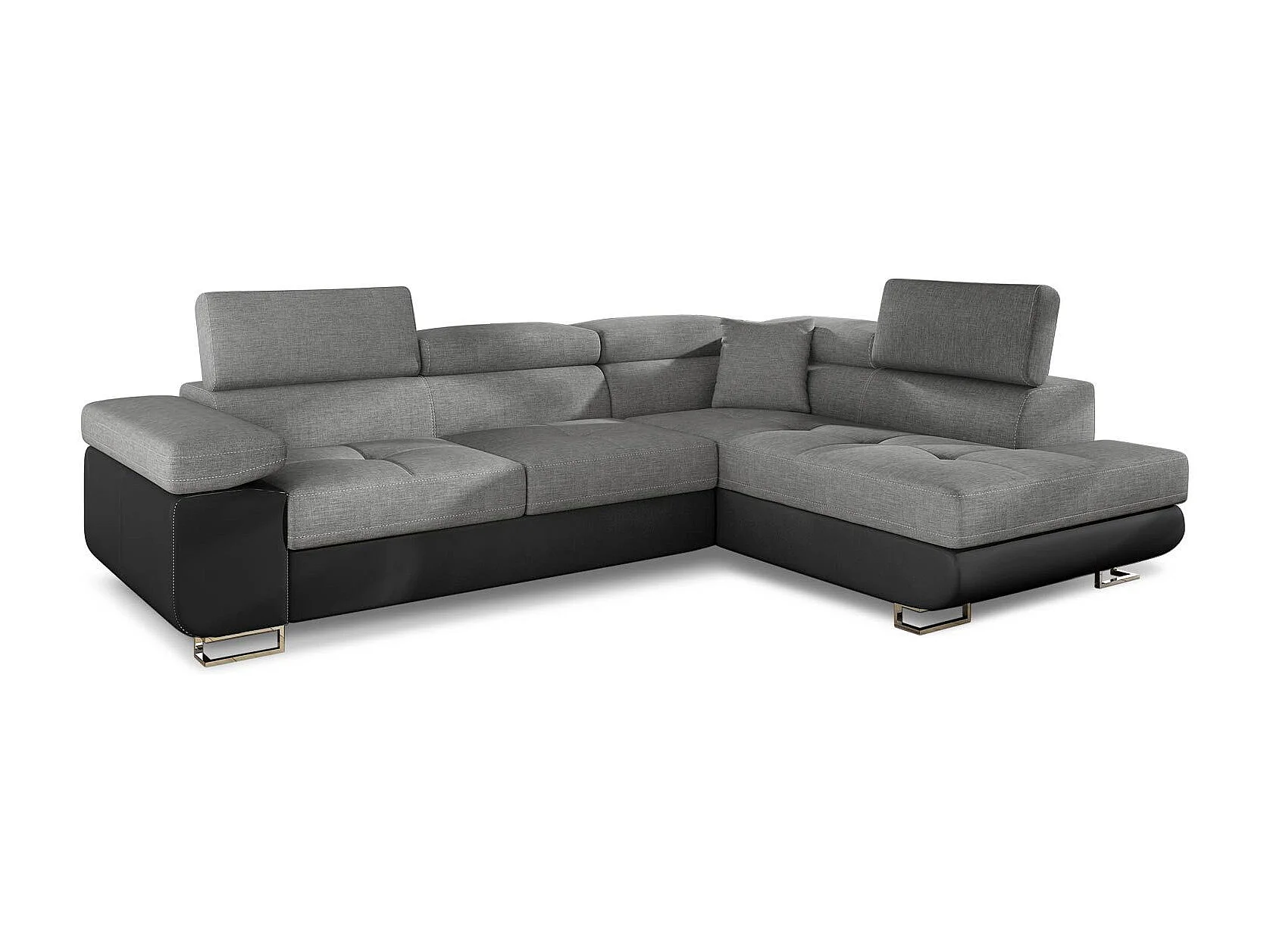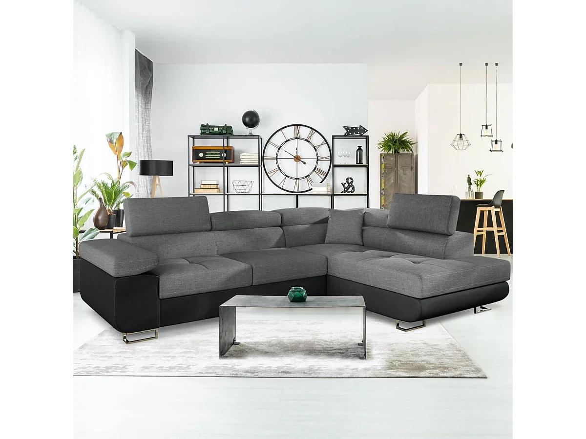 Divano ad angolo trasformabile Antoni con poggiatesta sollevabili in simil pelle nero e tessuto grigio scuro