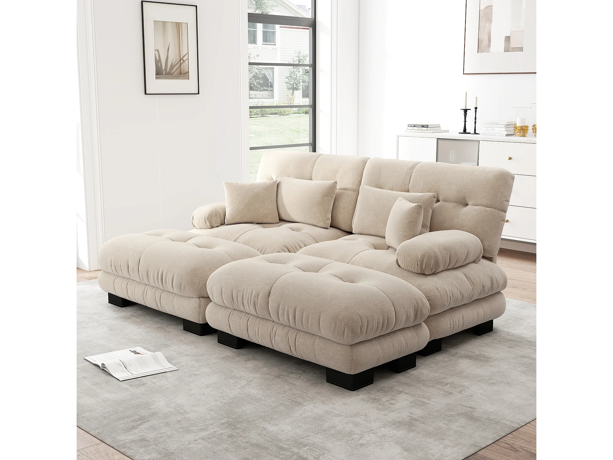 Divano angolare Cloud a 2 posti, con cuscini lombari e decorativi, struttura in legno massello, ciniglia color caffè chiaro (220x145x81 cm)