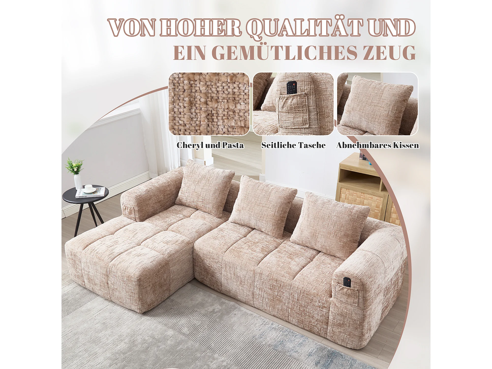 Divano angolare componibile a 3 posti senza montaggio, tessuto in morbida ciniglia, chaise longue, 3 cuscini, tasca laterale, design accogliente, colore kaki