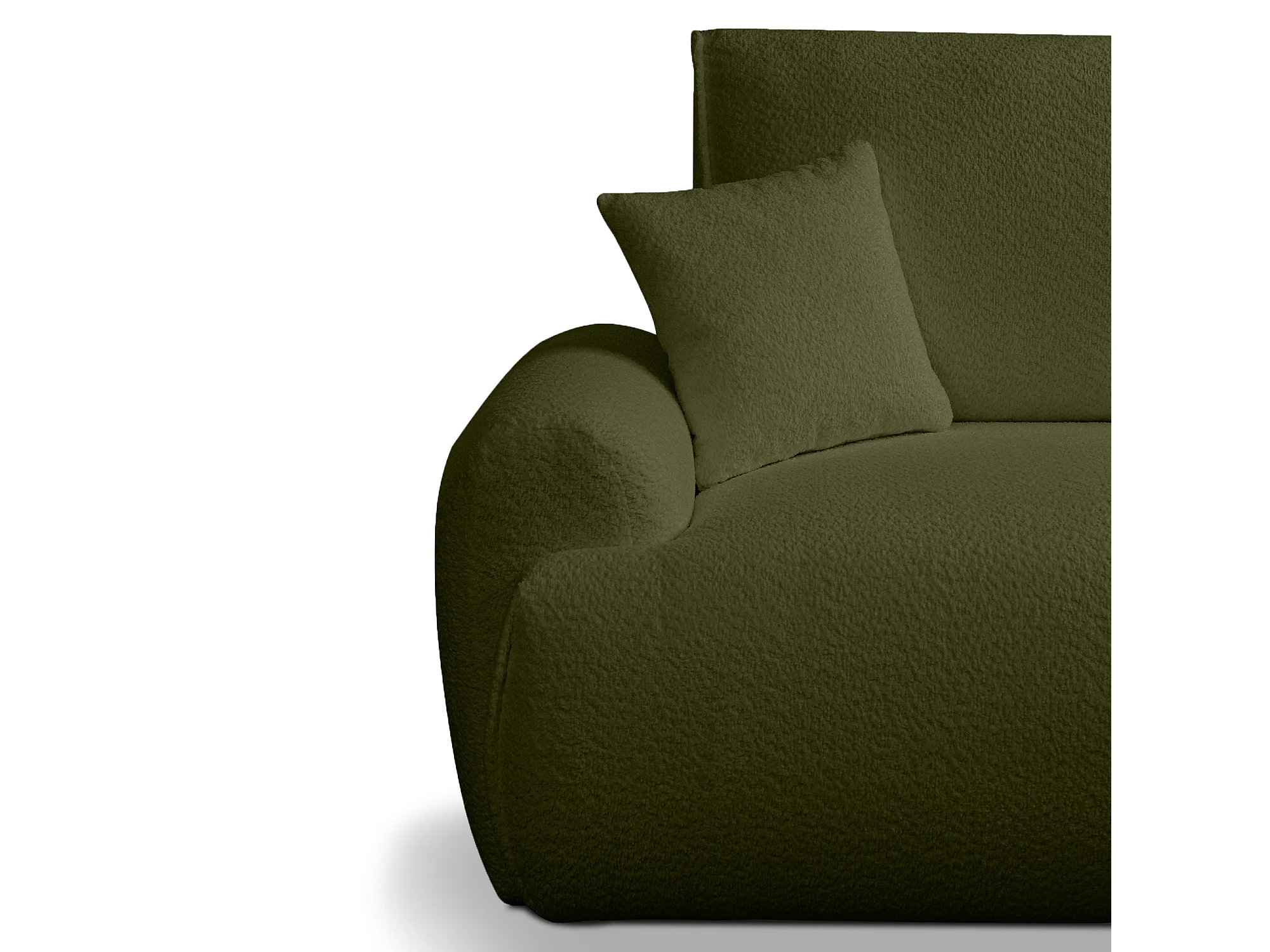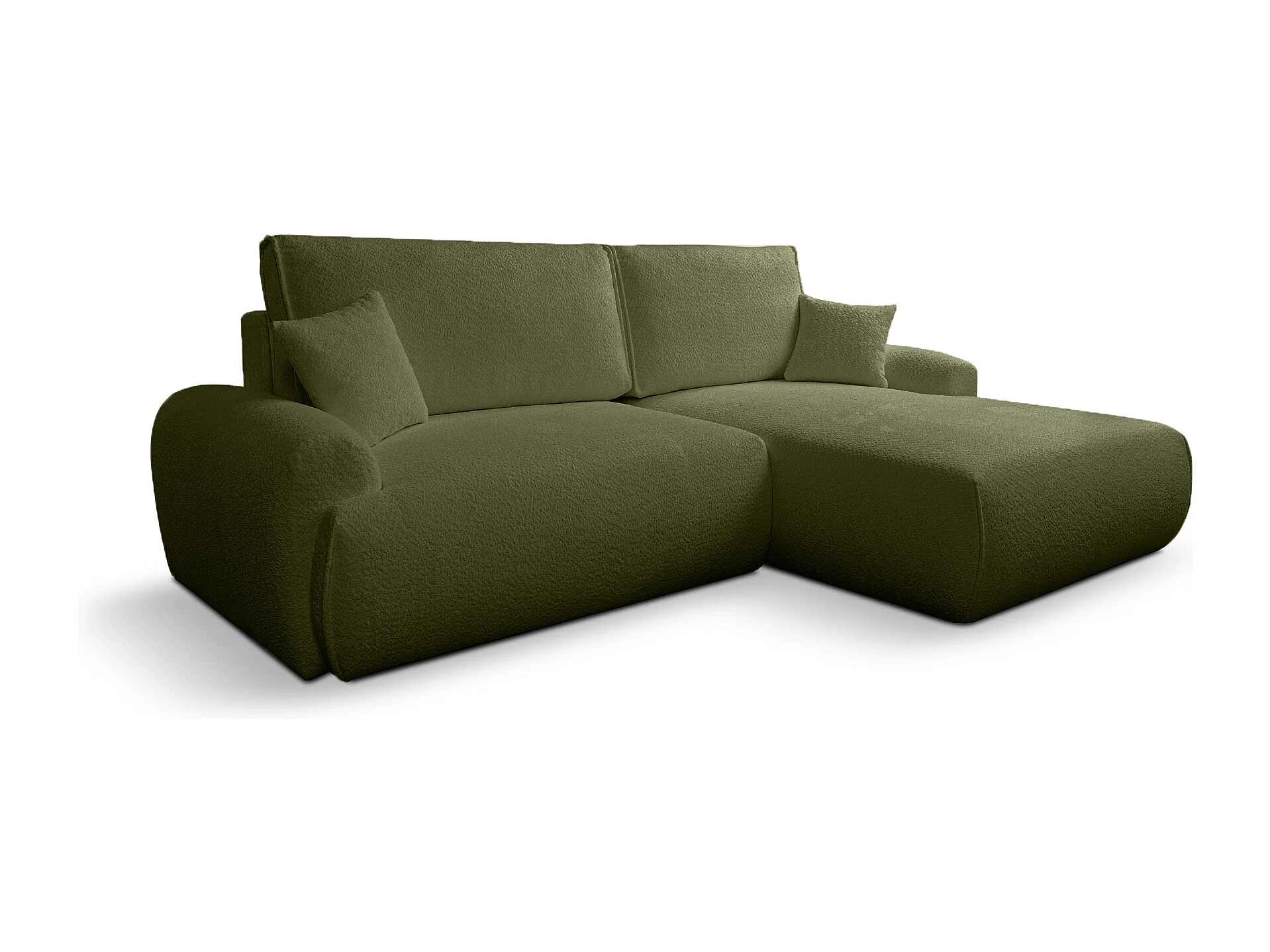 Divano angolare destro Noboo con funzione letto e vano contenitore in bouclé verde scuro – direttamente dal produttore, consegna e installazione gratuite!