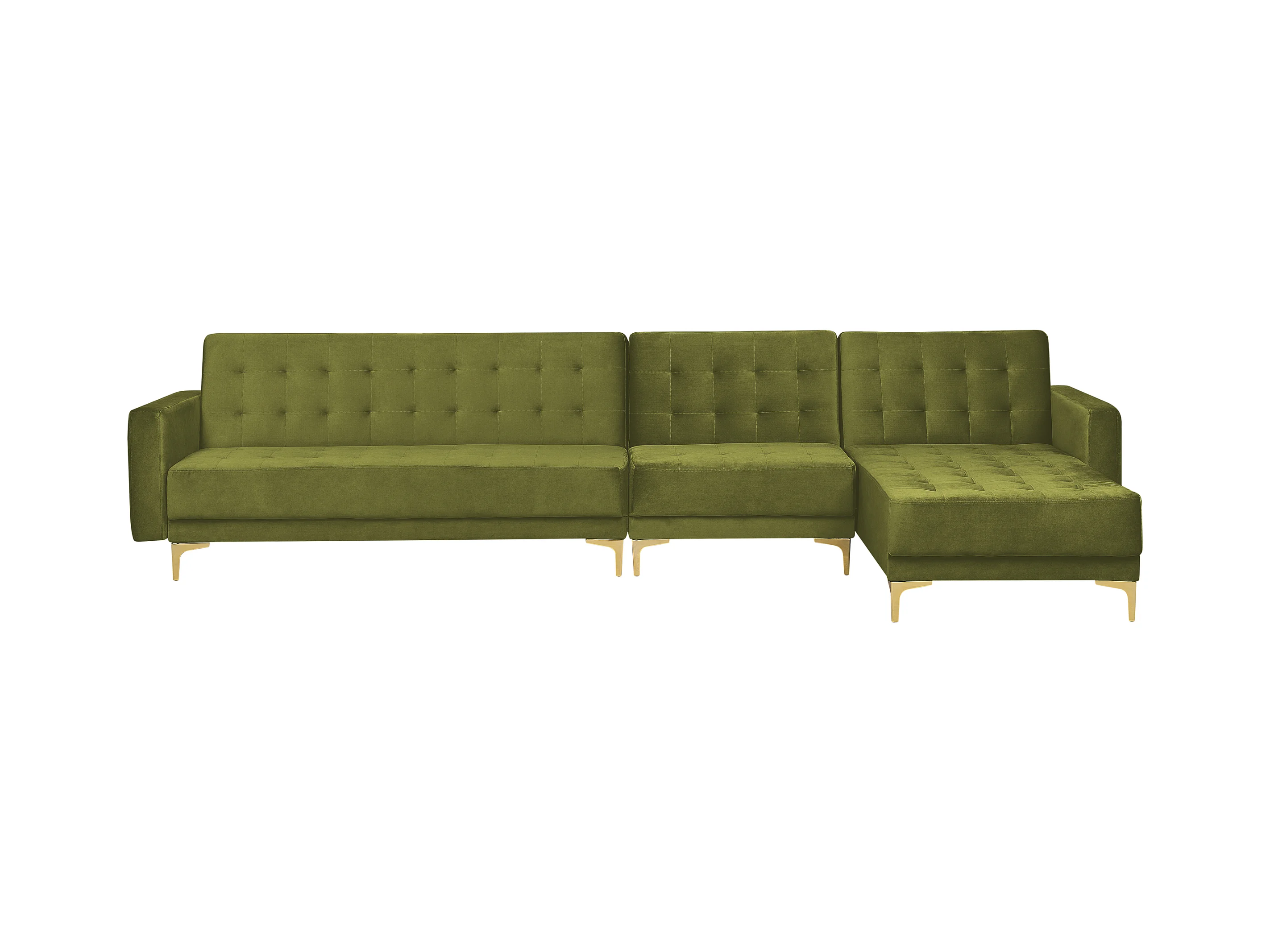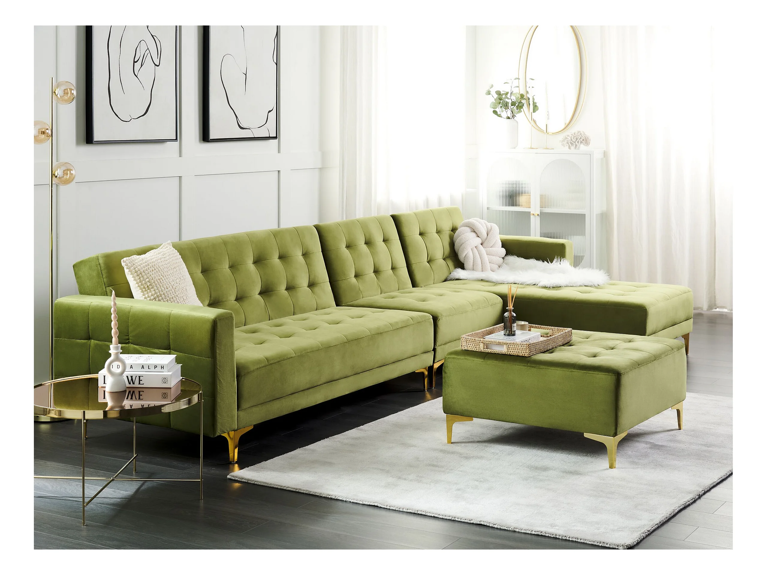 Divano letto modulare con ottomano . Porta la classe e l'eleganza in soggiorno con questo divano letto angolare di altissima qualità. Grazie al suo design unico, si adatta a ogni stile d'arredamento. I piedi in metallo assicurano una stabilità ottimale, mentre lo schienale regolabile consente di convertirlo facilmente in letto. Il versatile pouf porta funzionalità e comodità.