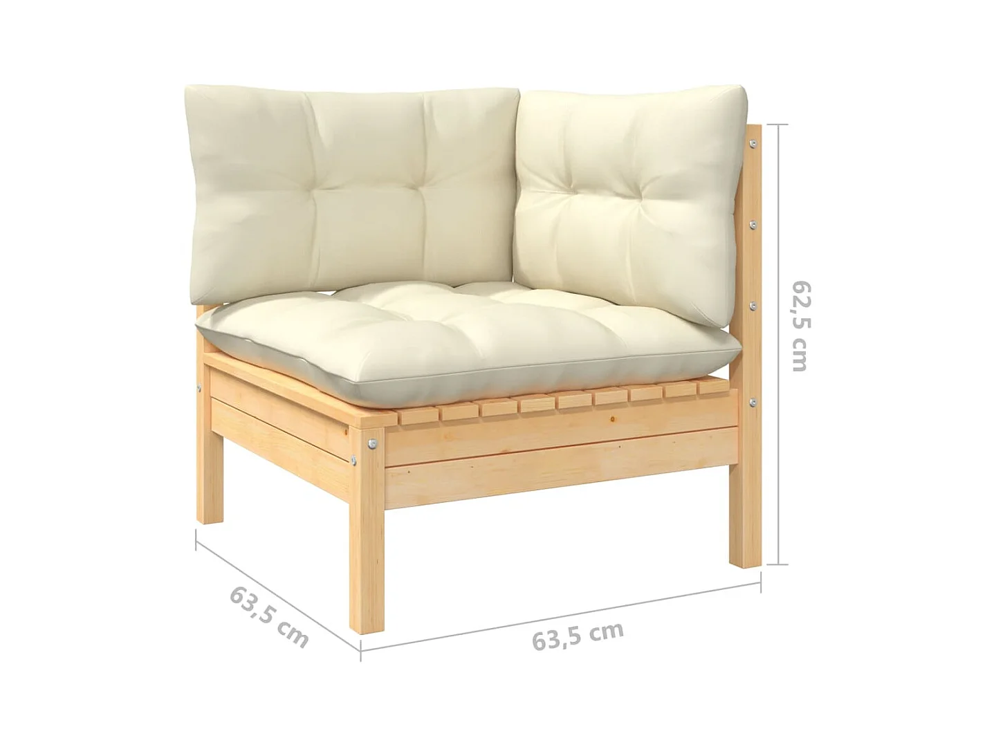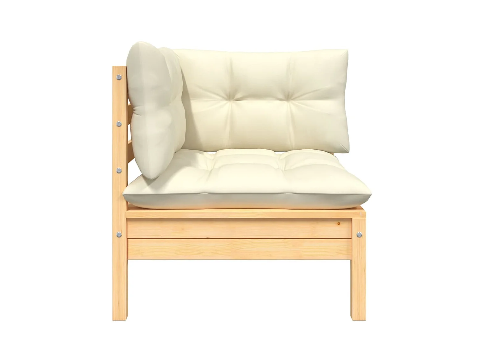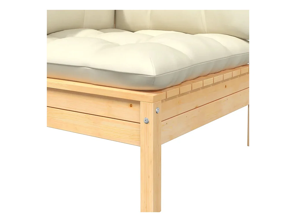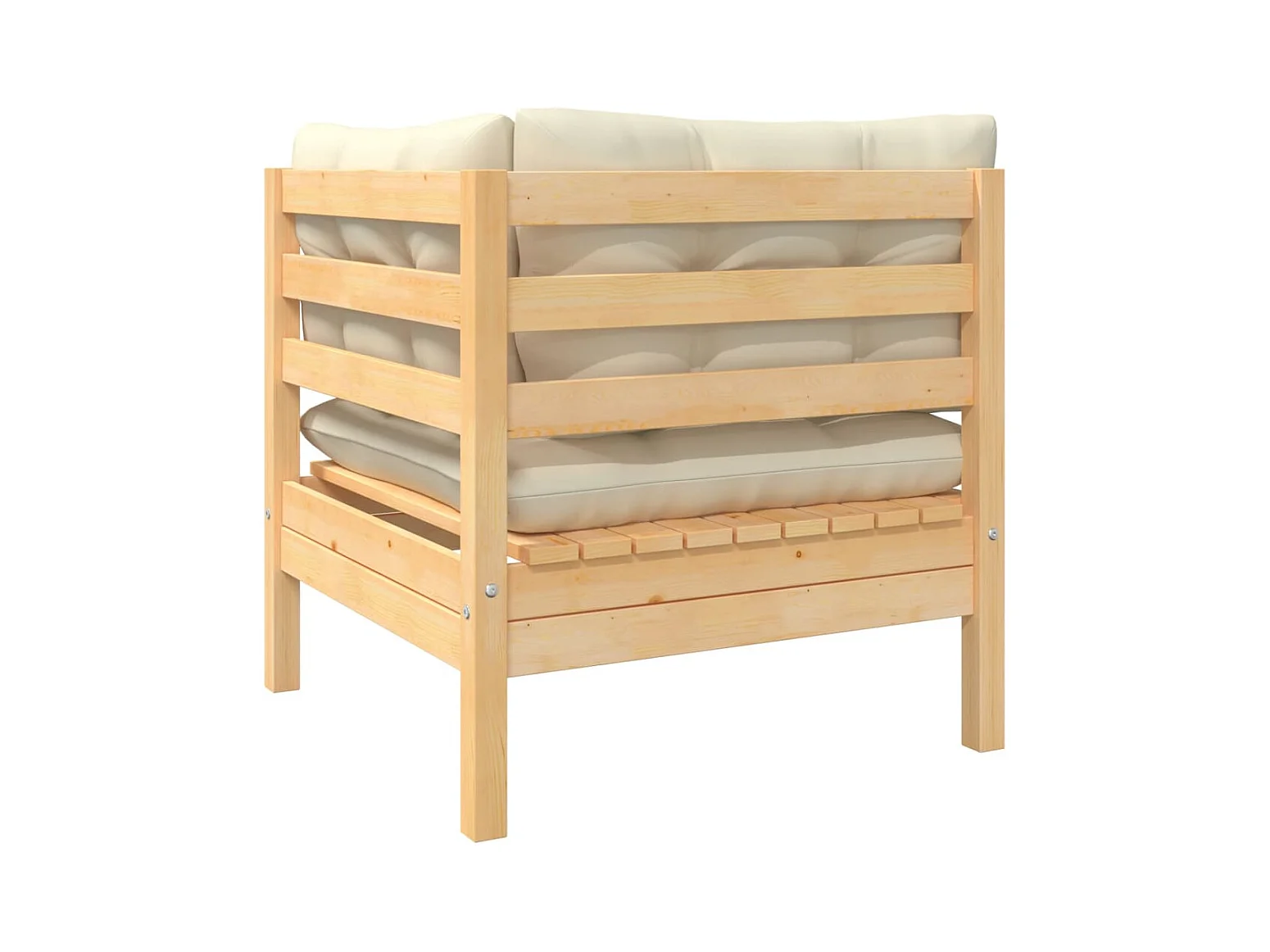 Divano ad angolo da giardino con cuscini color crema. Legno di pino massiccio
