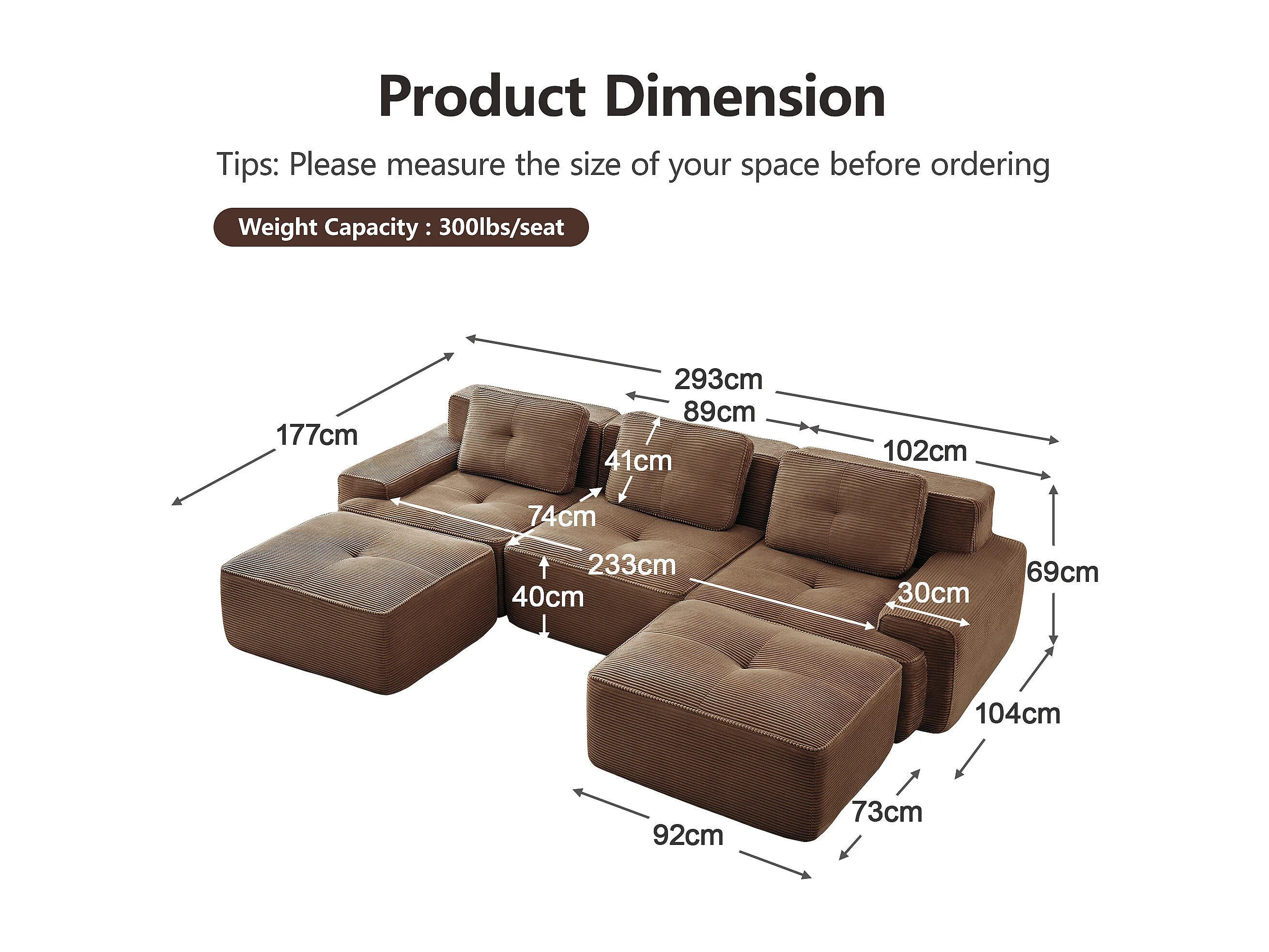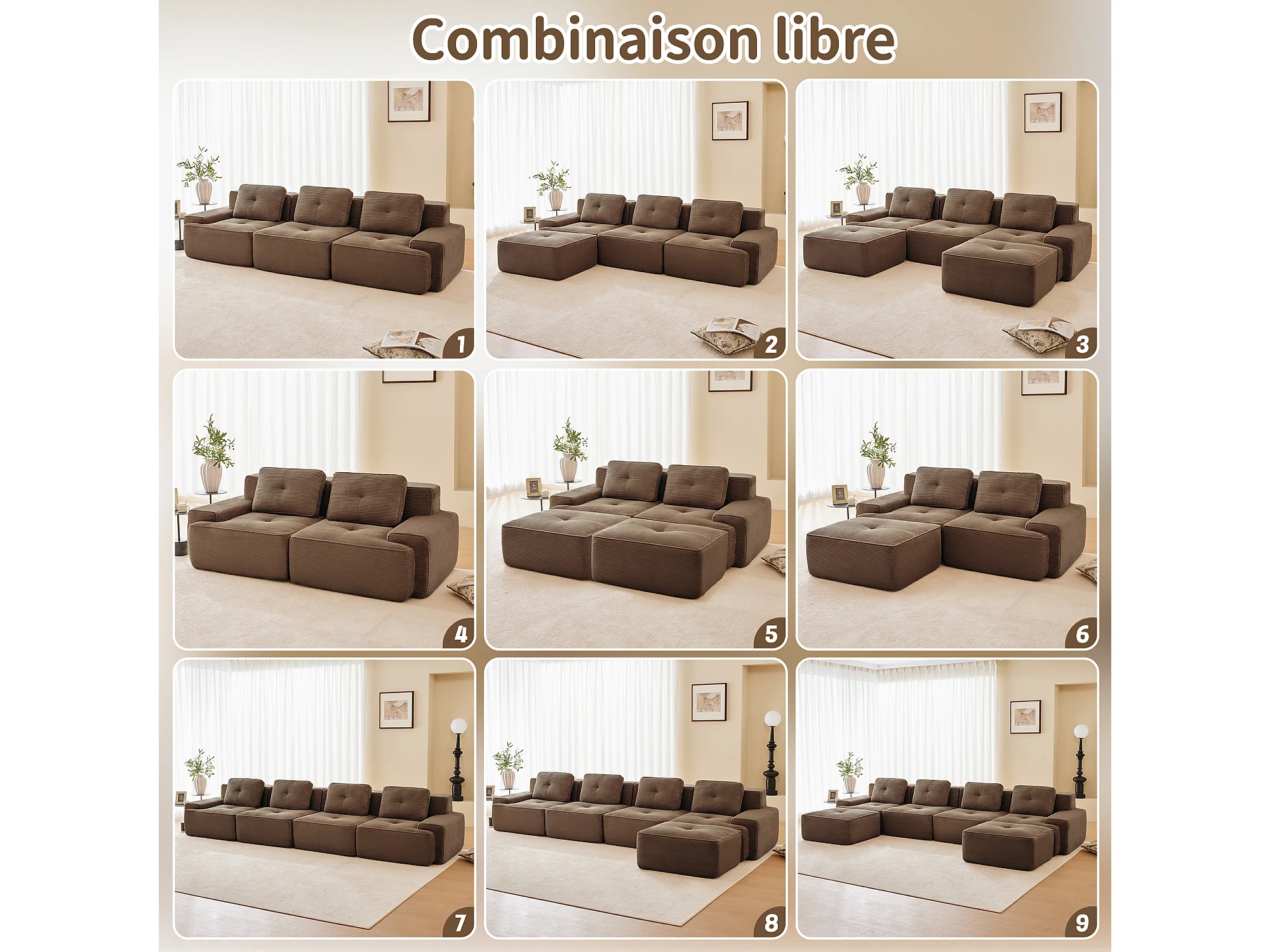Divano Angolare Modulare a Forma di U in Velluto costola, con 2 pouf e 3 cuscini, 293x177x69cm, Marrone