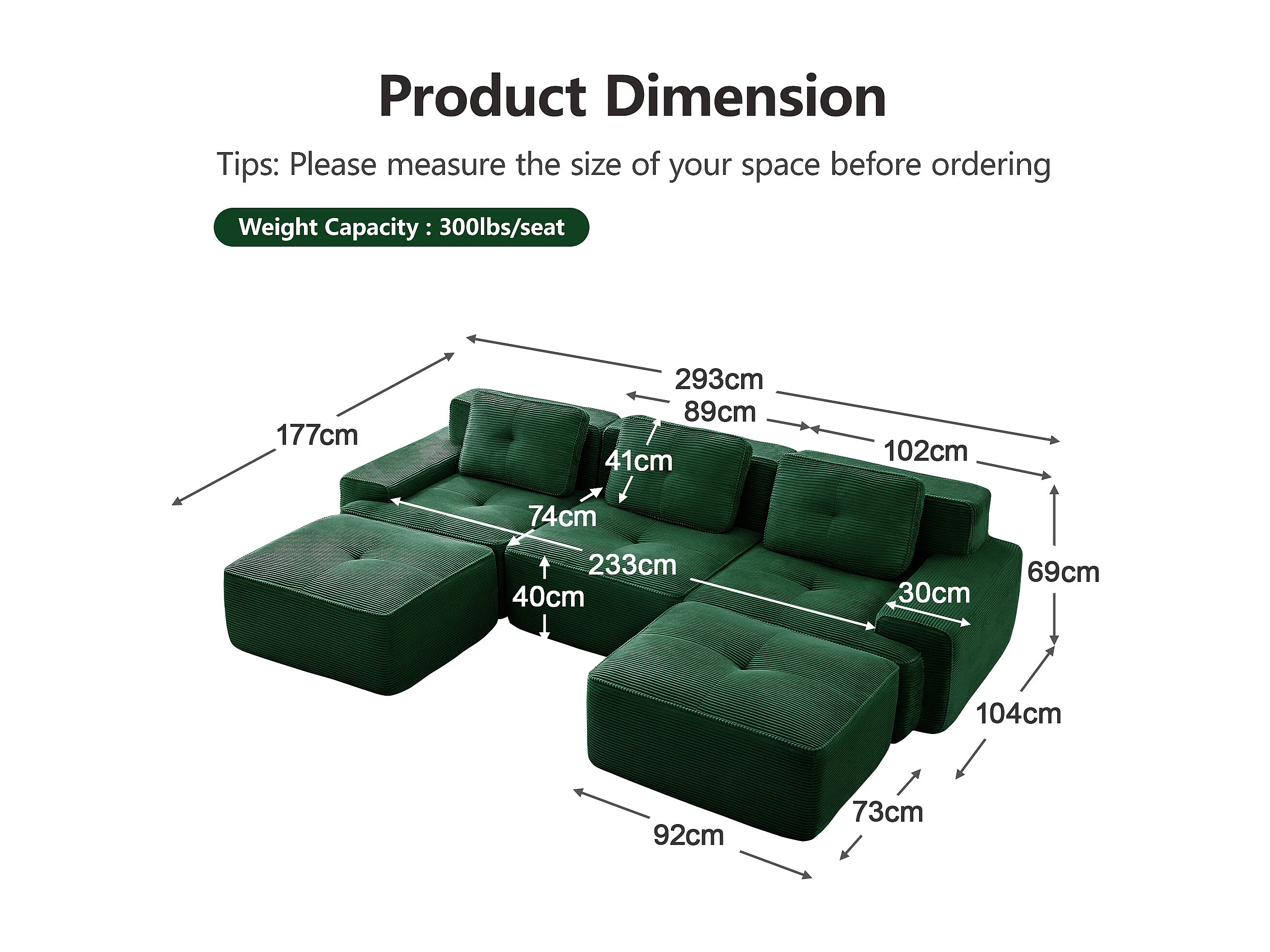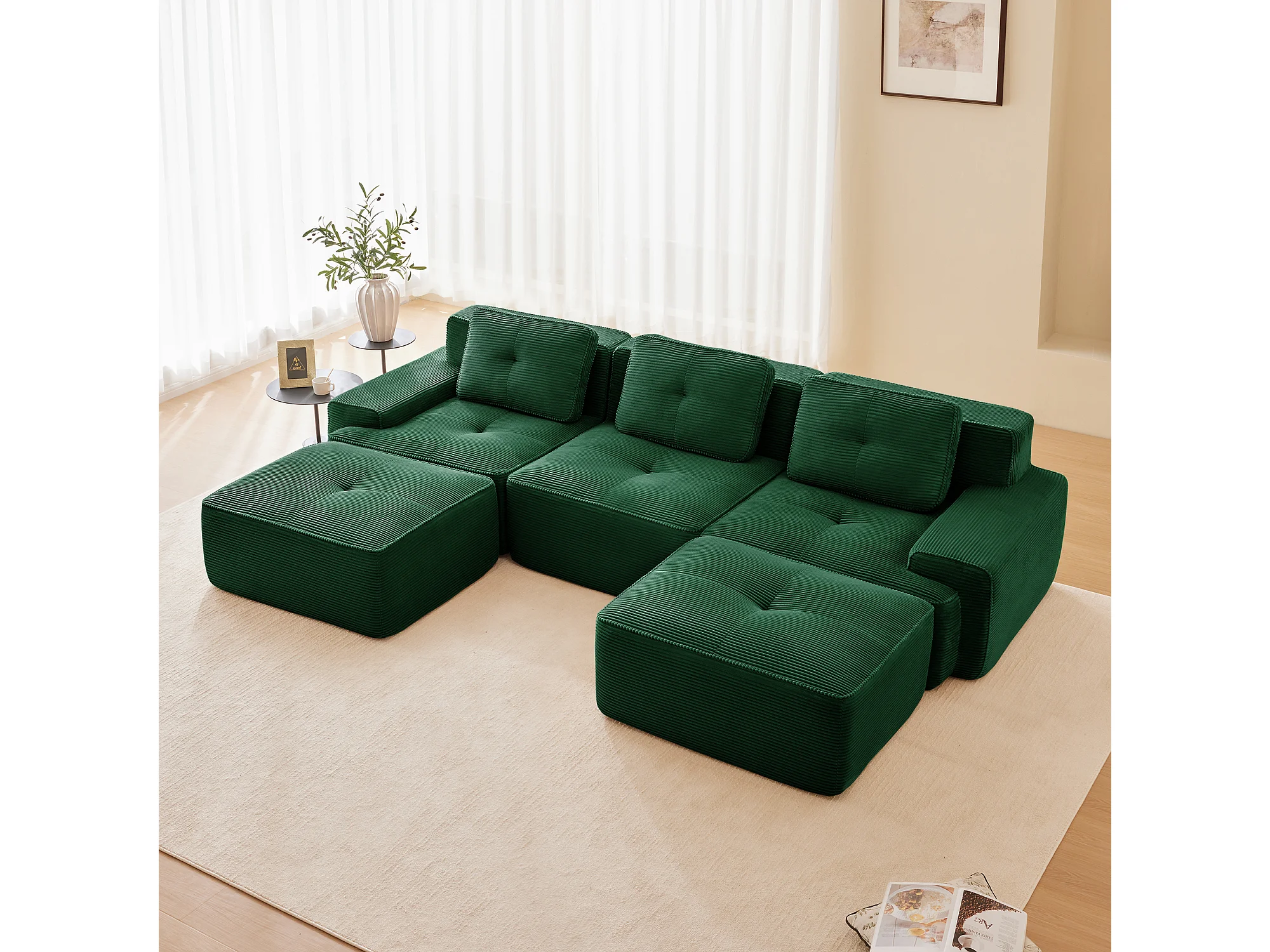 Divano Angolare Modulare a Forma di U in Velluto costola, con 2 pouf e 3 cuscini, 293x177x69cm, Verde