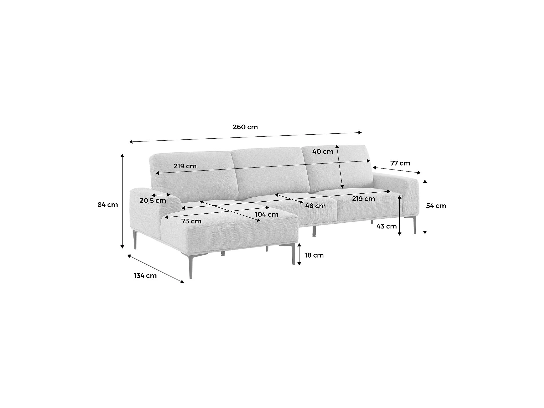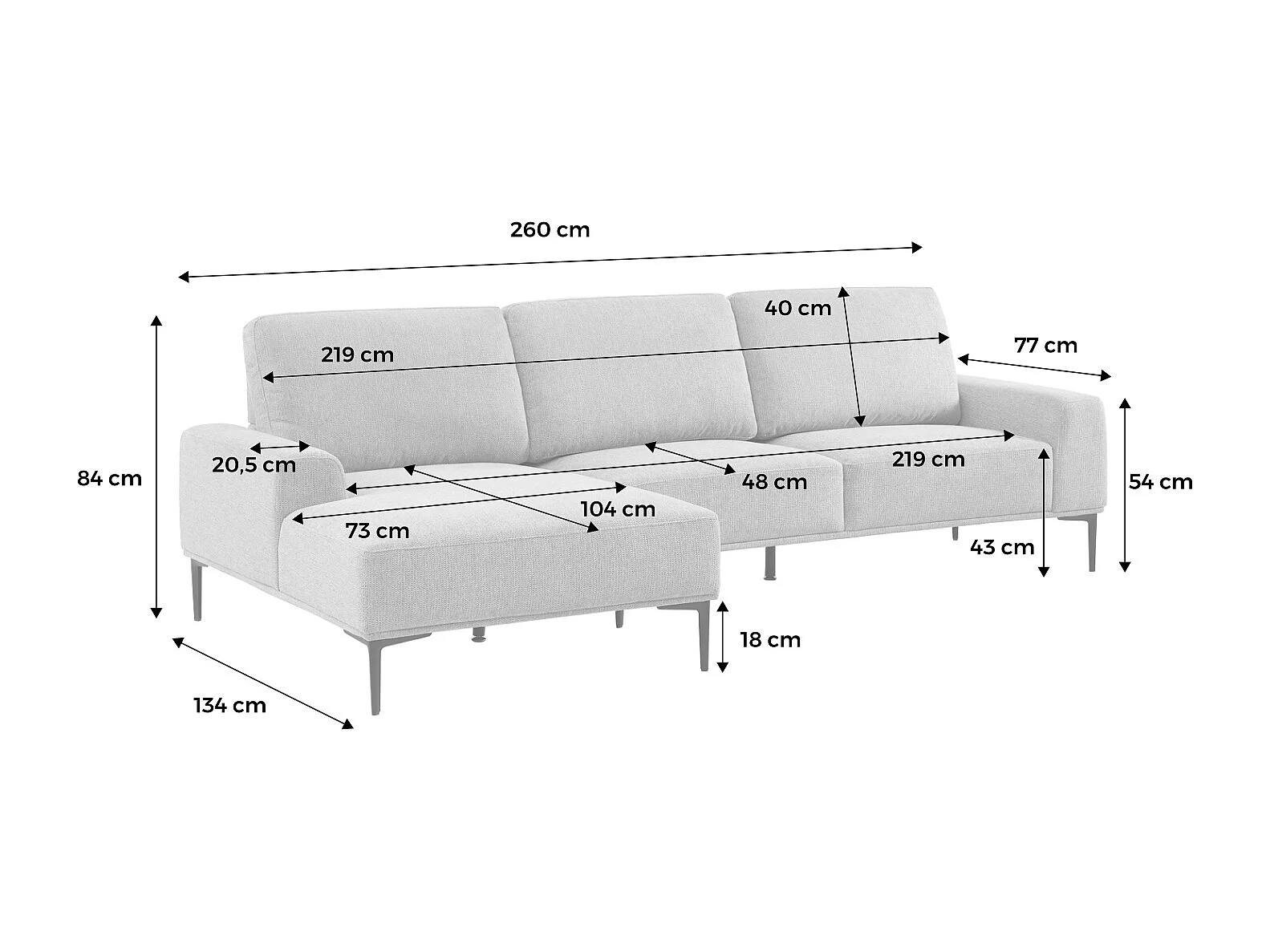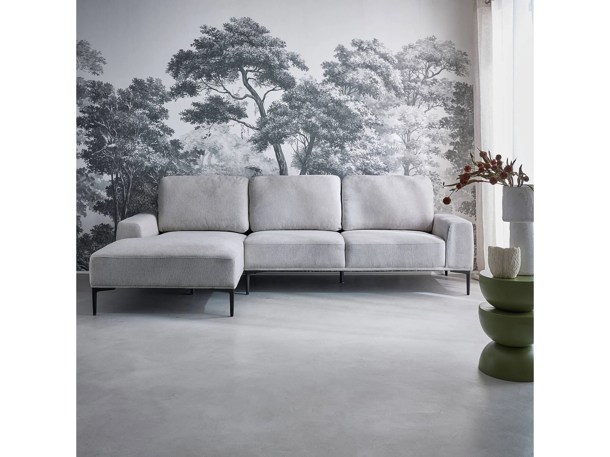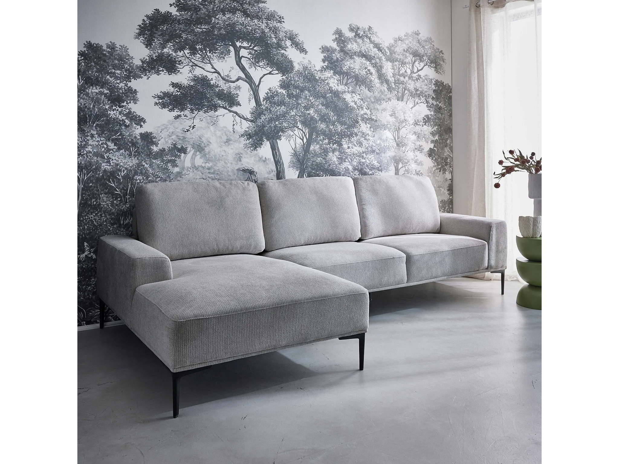 Divano angolare sinistro in tessuto e metallo, 3 posti, grigio chiaro