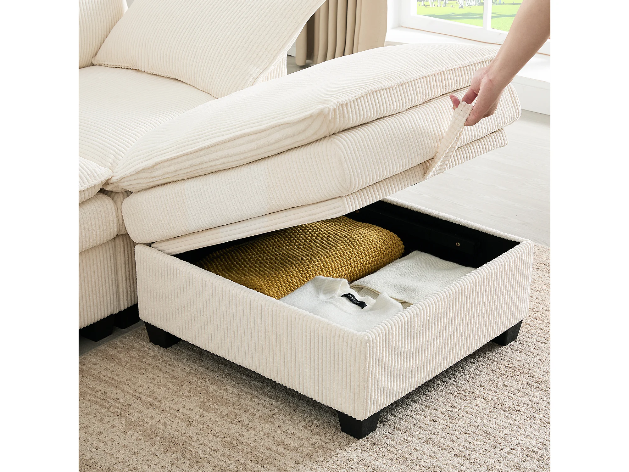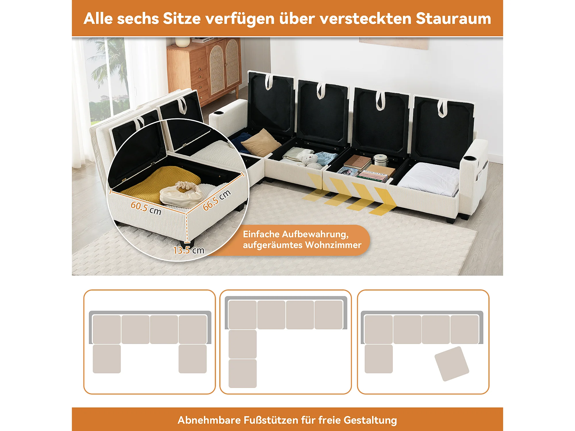 Divano componibile 6 posti con contenitore + poggiapiedi rimovibile + porte USB - 280 x 152 x 83 cm - Velluto - beige