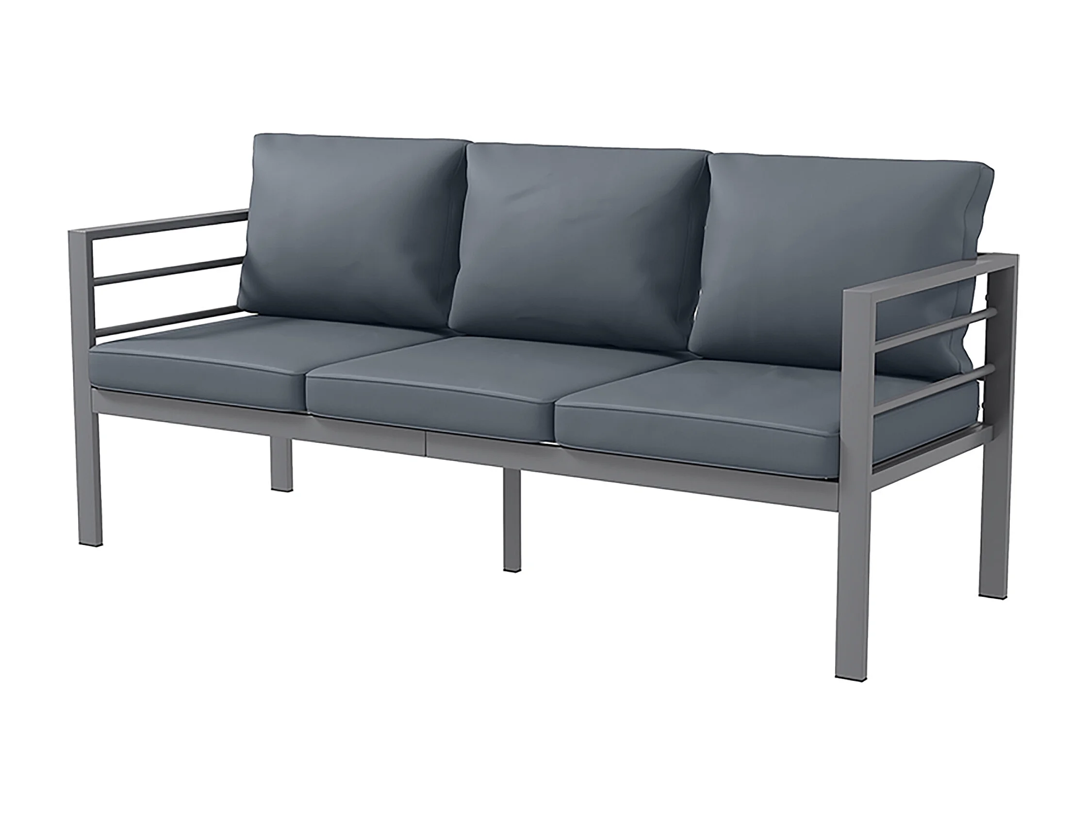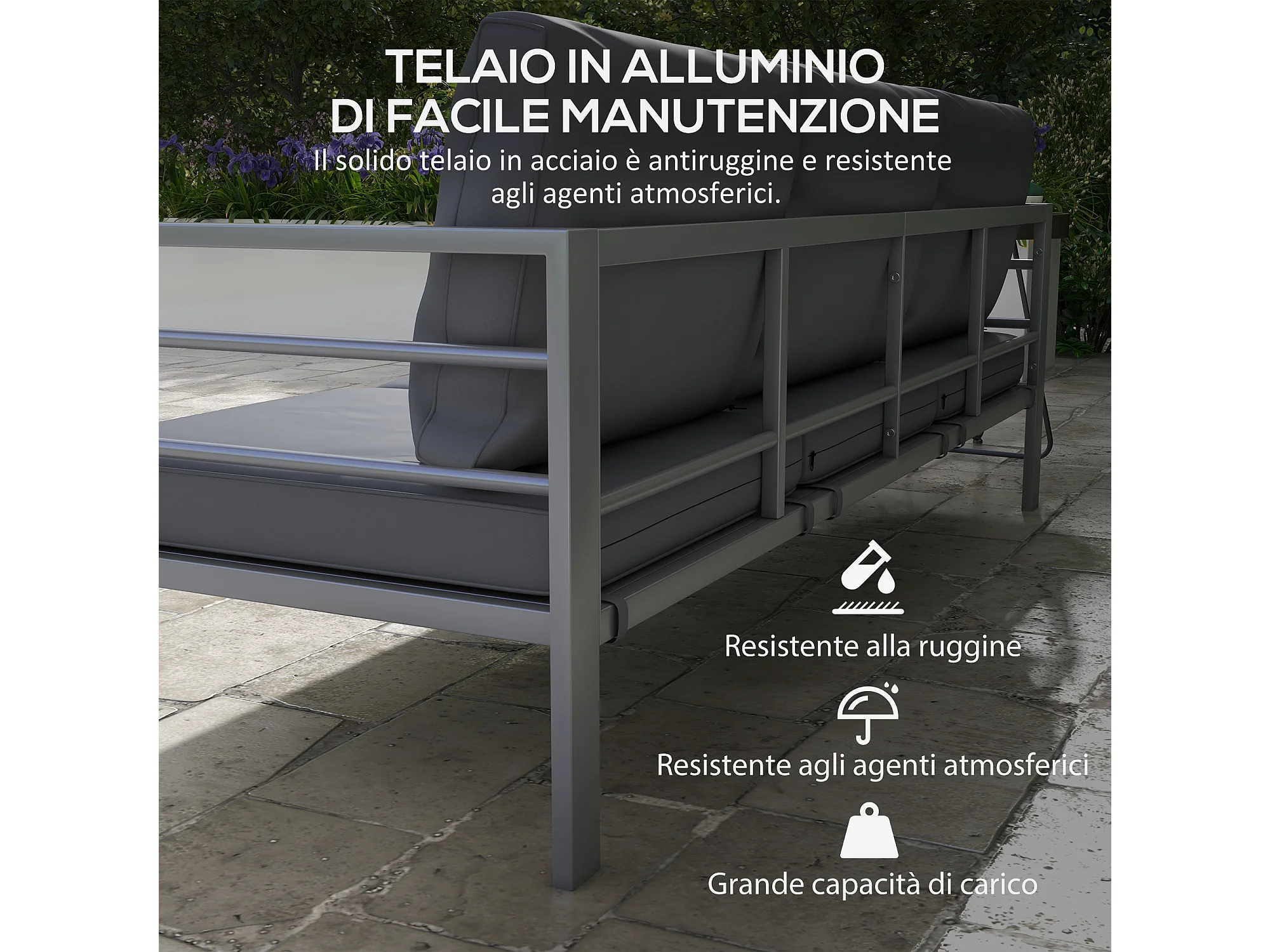 Divano da giardino 3 posti in alluminio grigio con cuscini