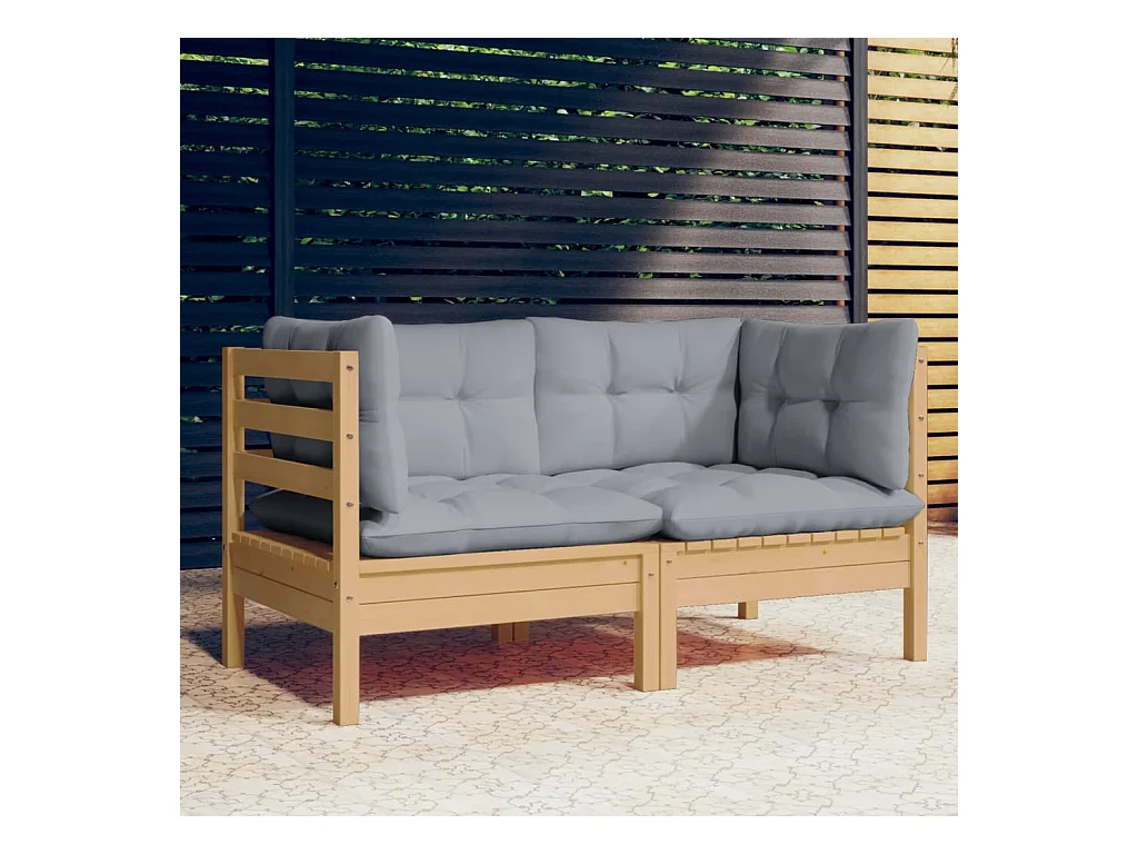 Divano da giardino a 2 posti e cuscini grigi. Legno di pino massiccio
