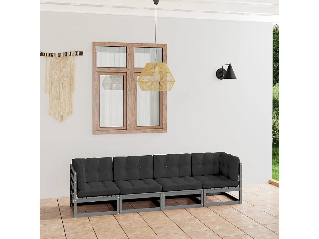 Divano da giardino a 4 posti e cuscini grigi. Legno di pino massiccio