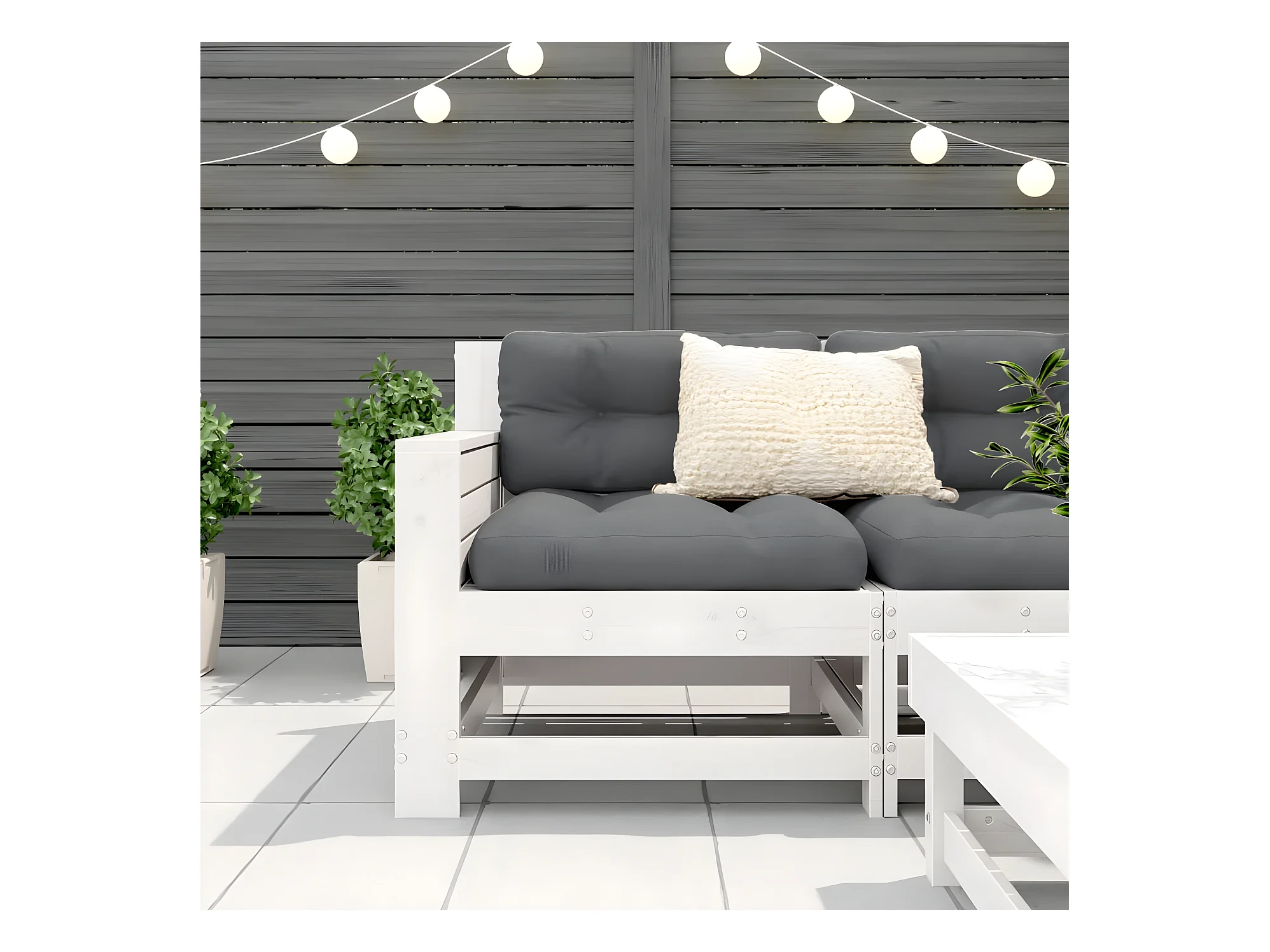 Divano da giardino con braccioli e cuscini bianchi in legno massello di pino