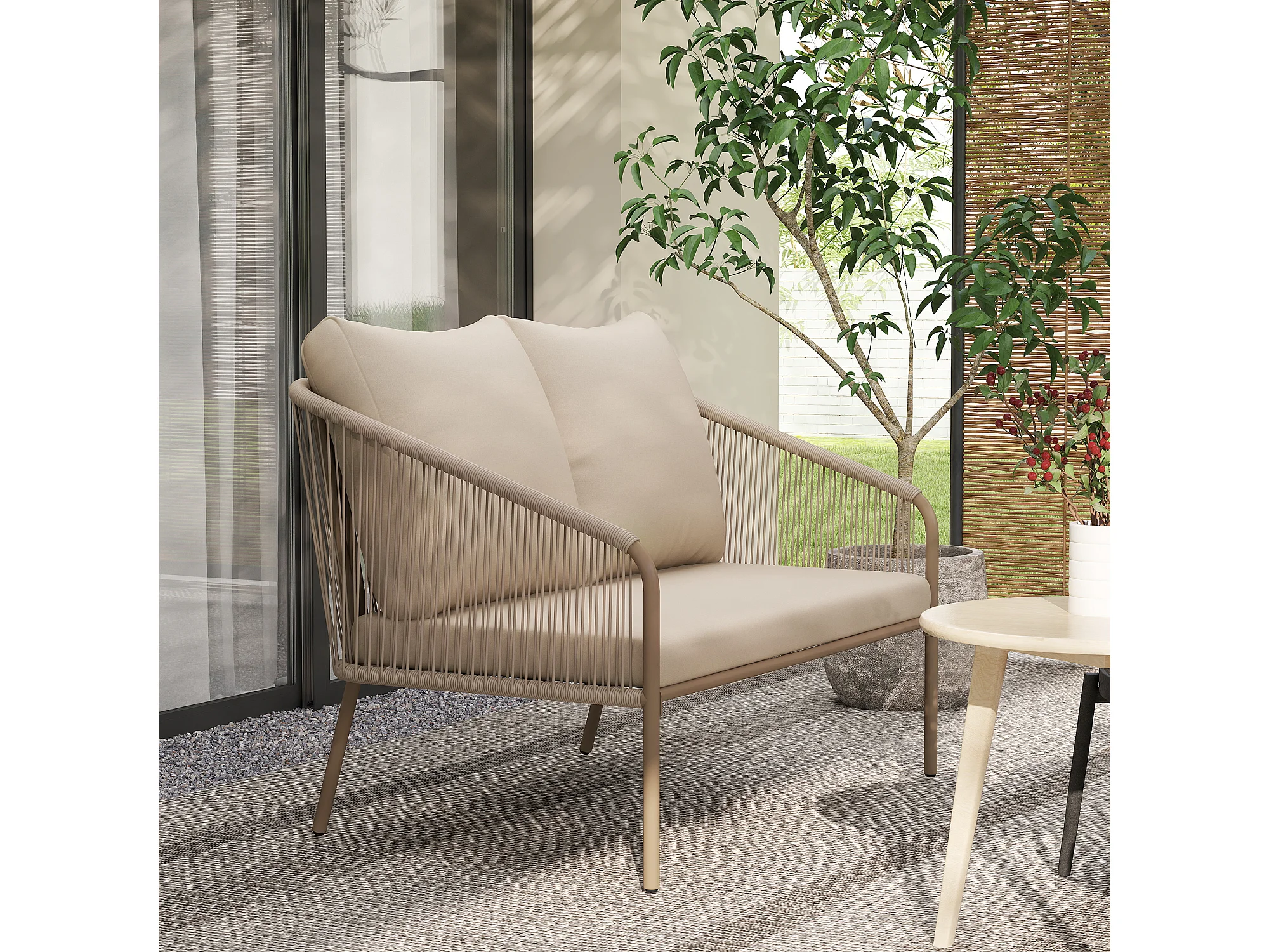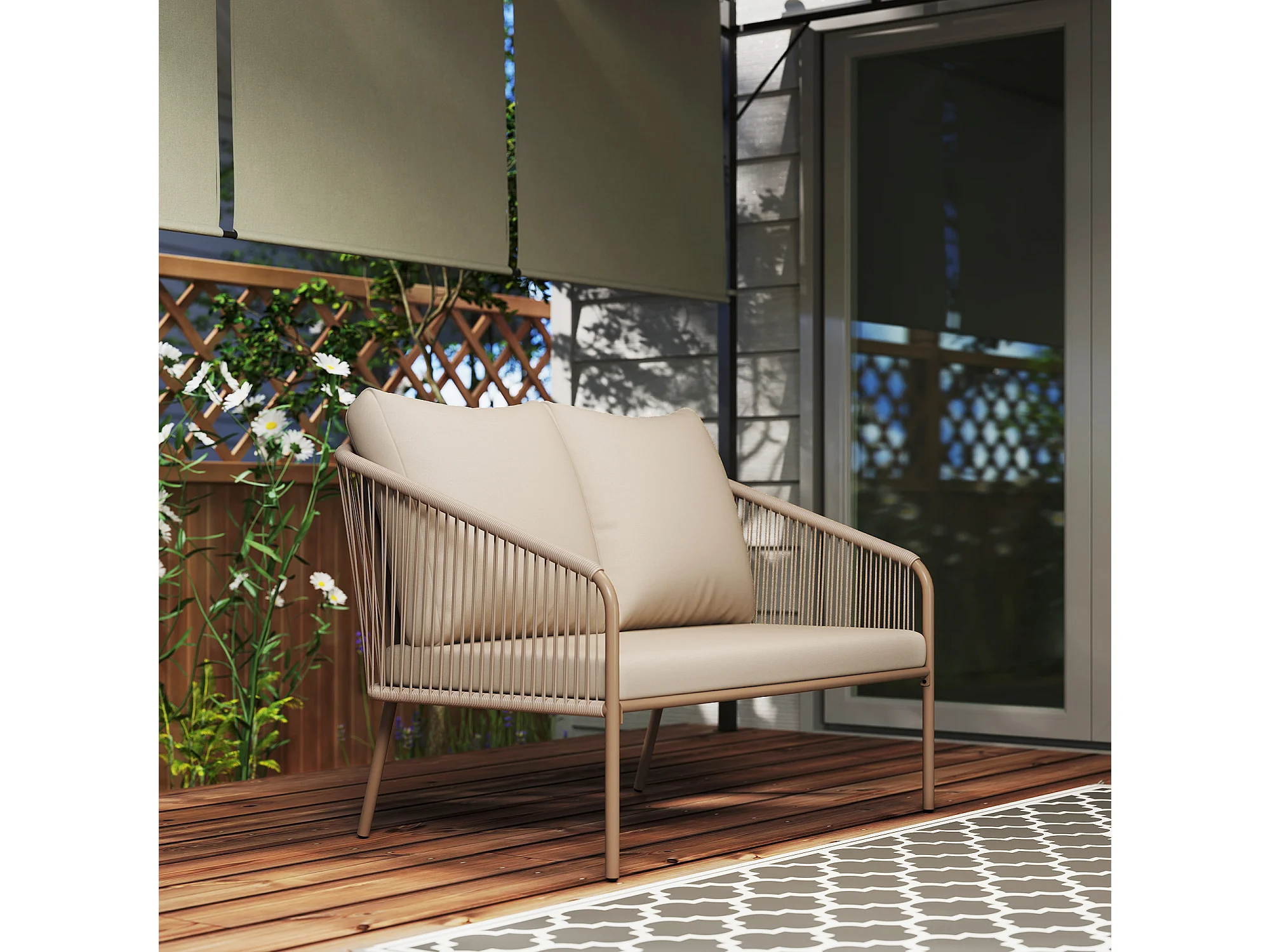 Divano da giardino boho in rattan pe e acciaio beige