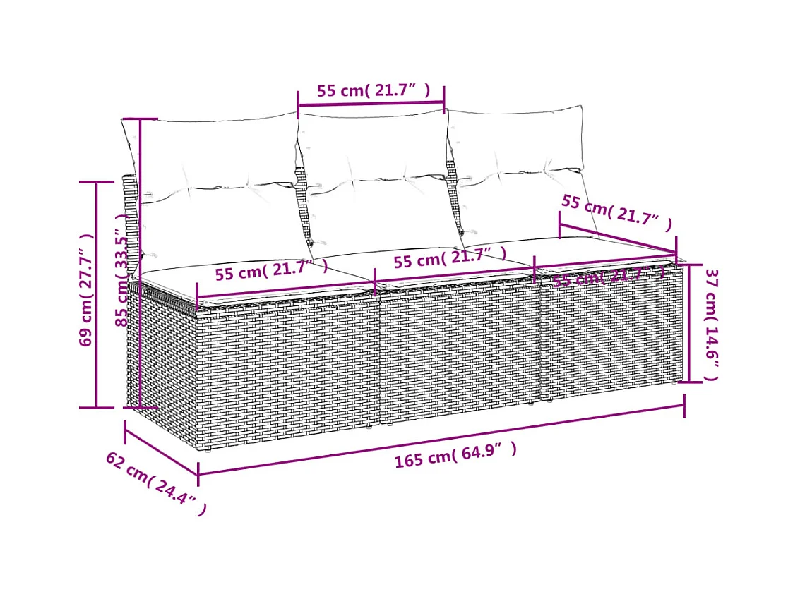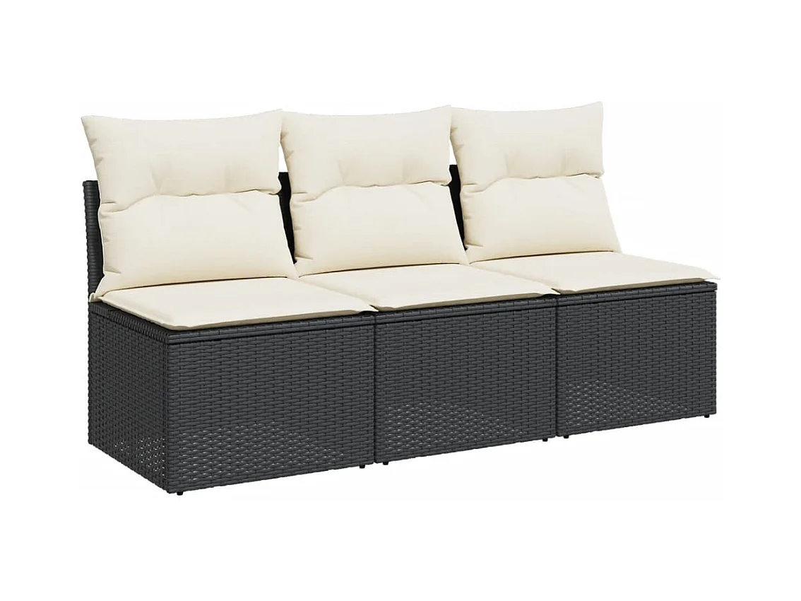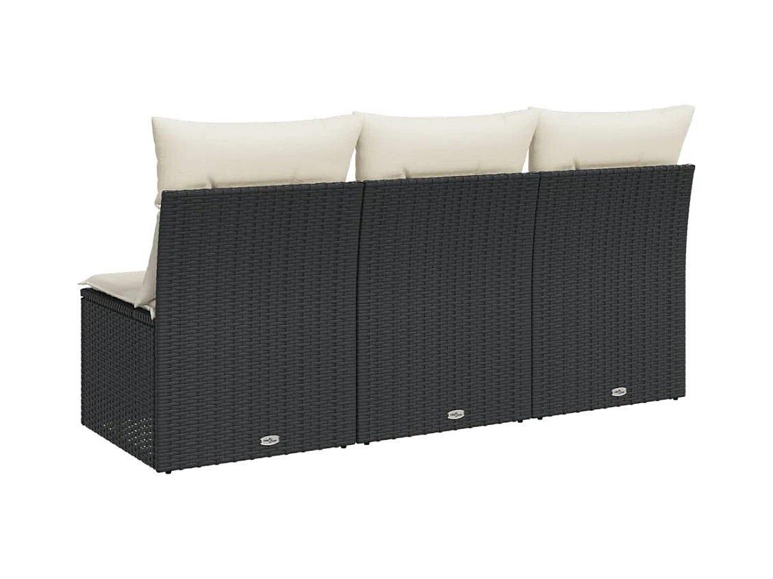Divano da giardino con cuscini a 3 posti, resina intrecciata nera
