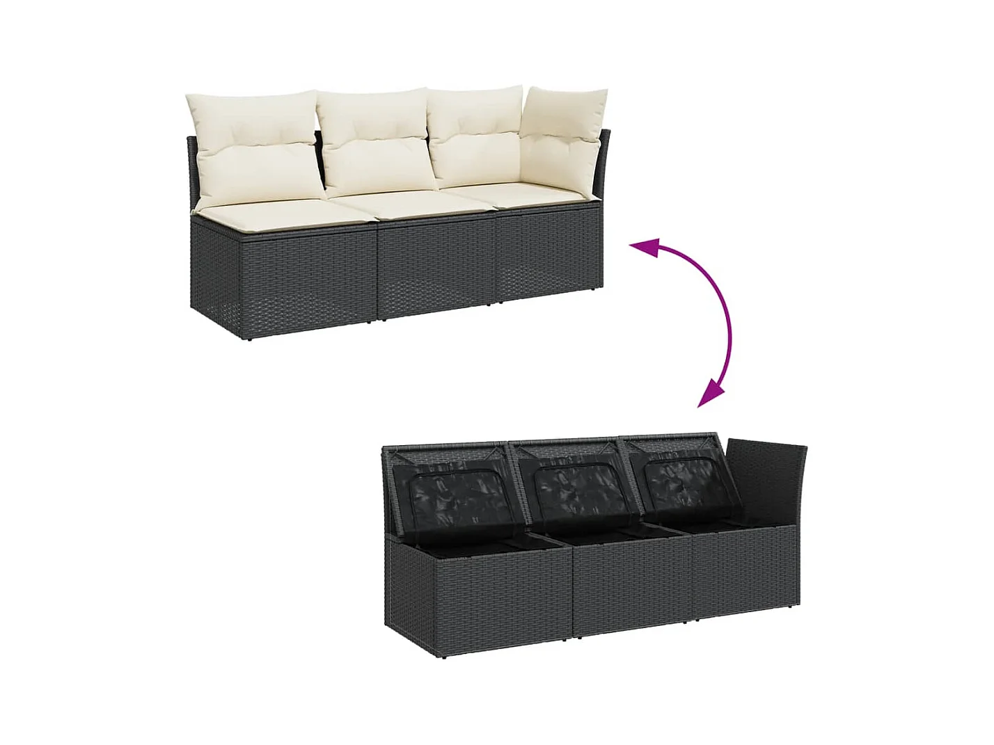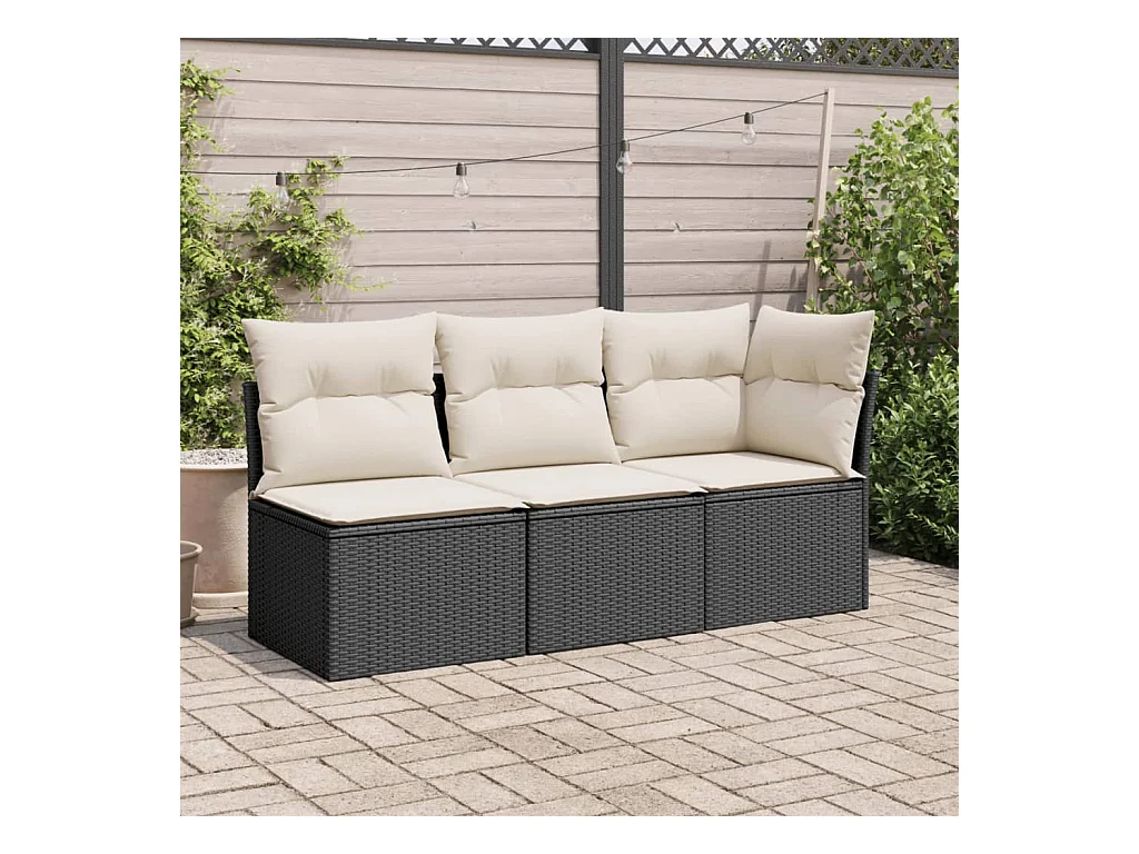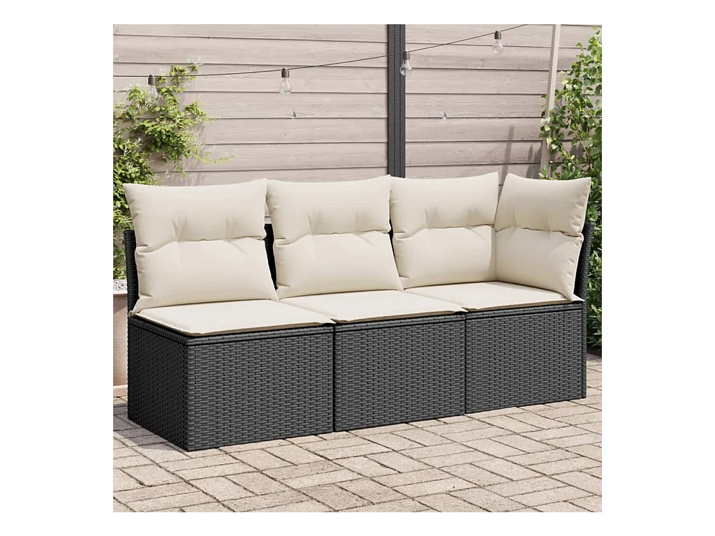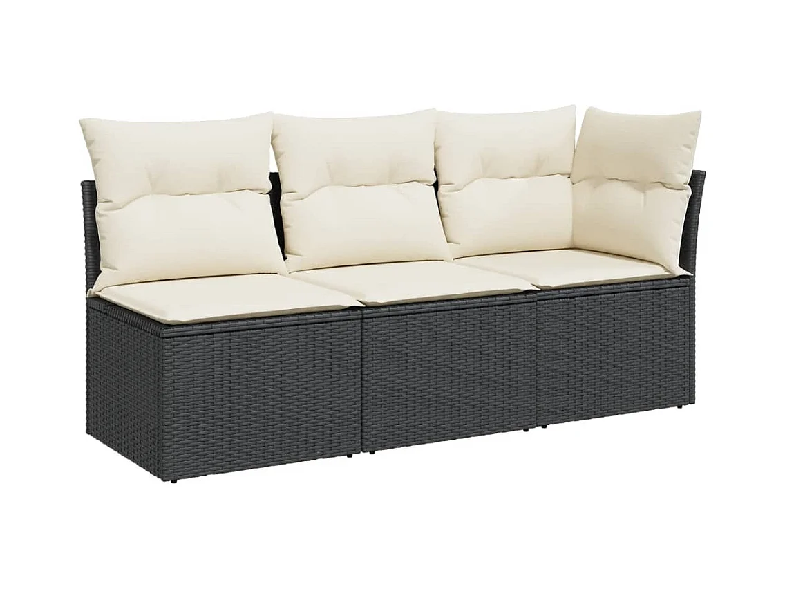 Divano da giardino con cuscini a 3 posti, resina intrecciata nera