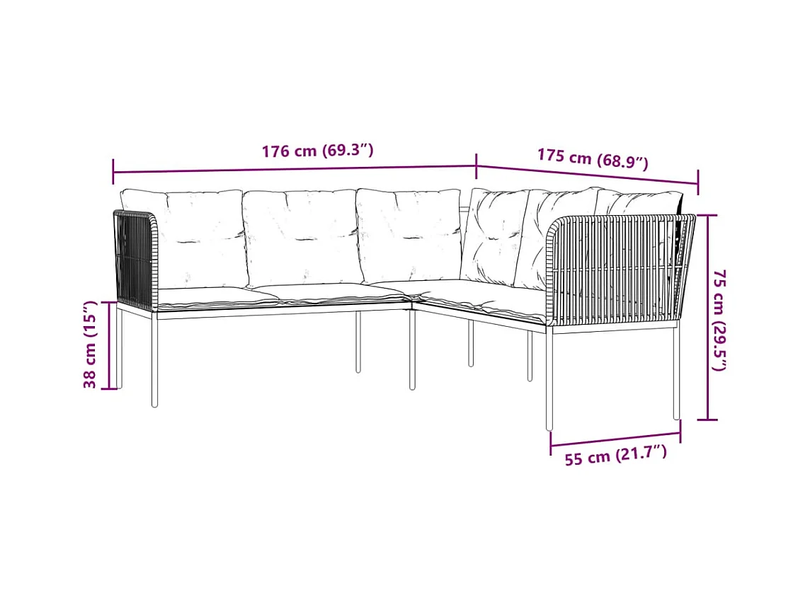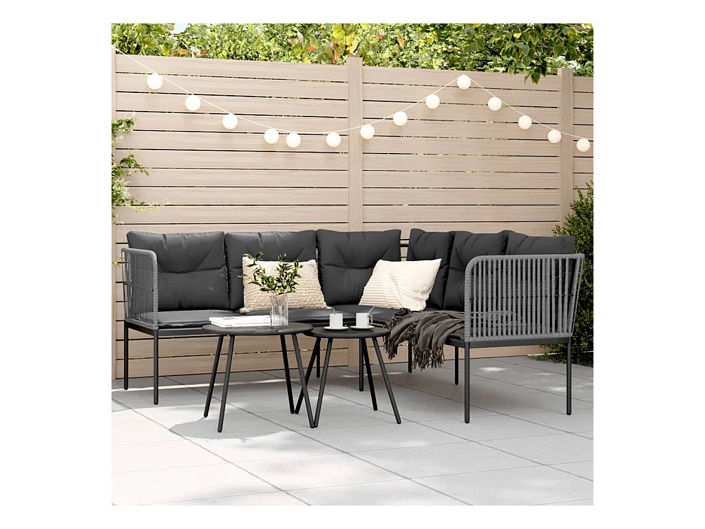Divano da giardino a forma di L in rattan, cuscini e poggiapiedi