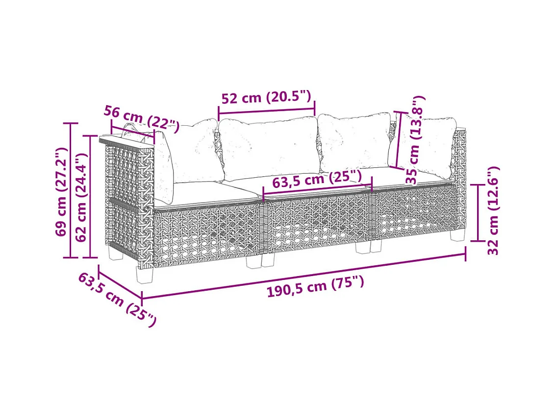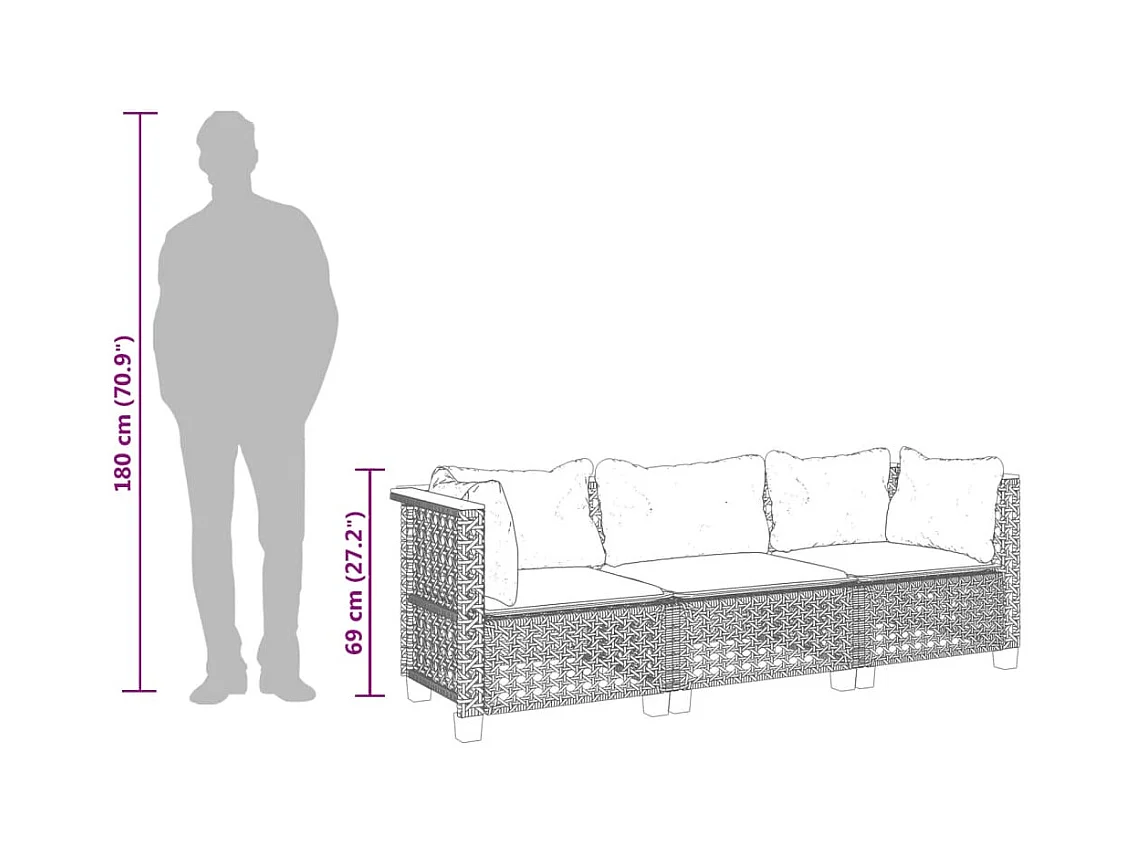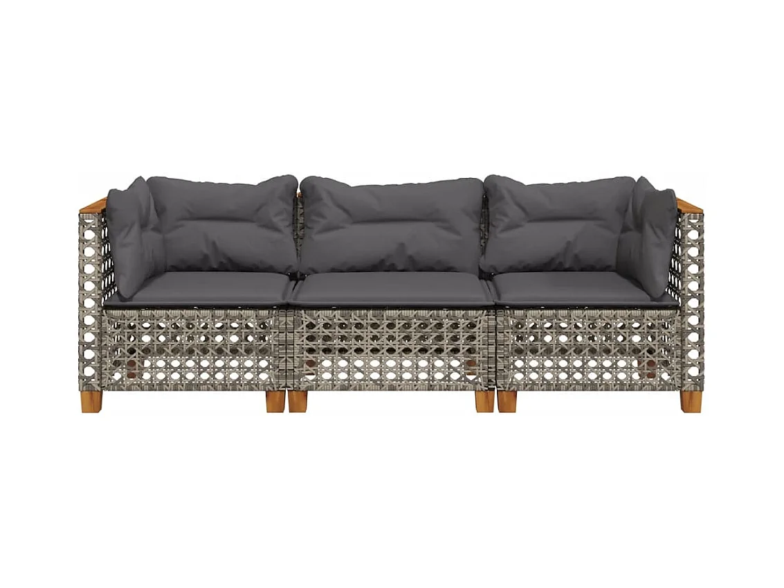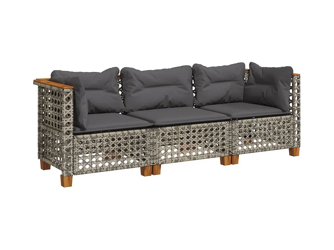 Divano da giardino con cuscini in resina intrecciata grigia a 3 posti