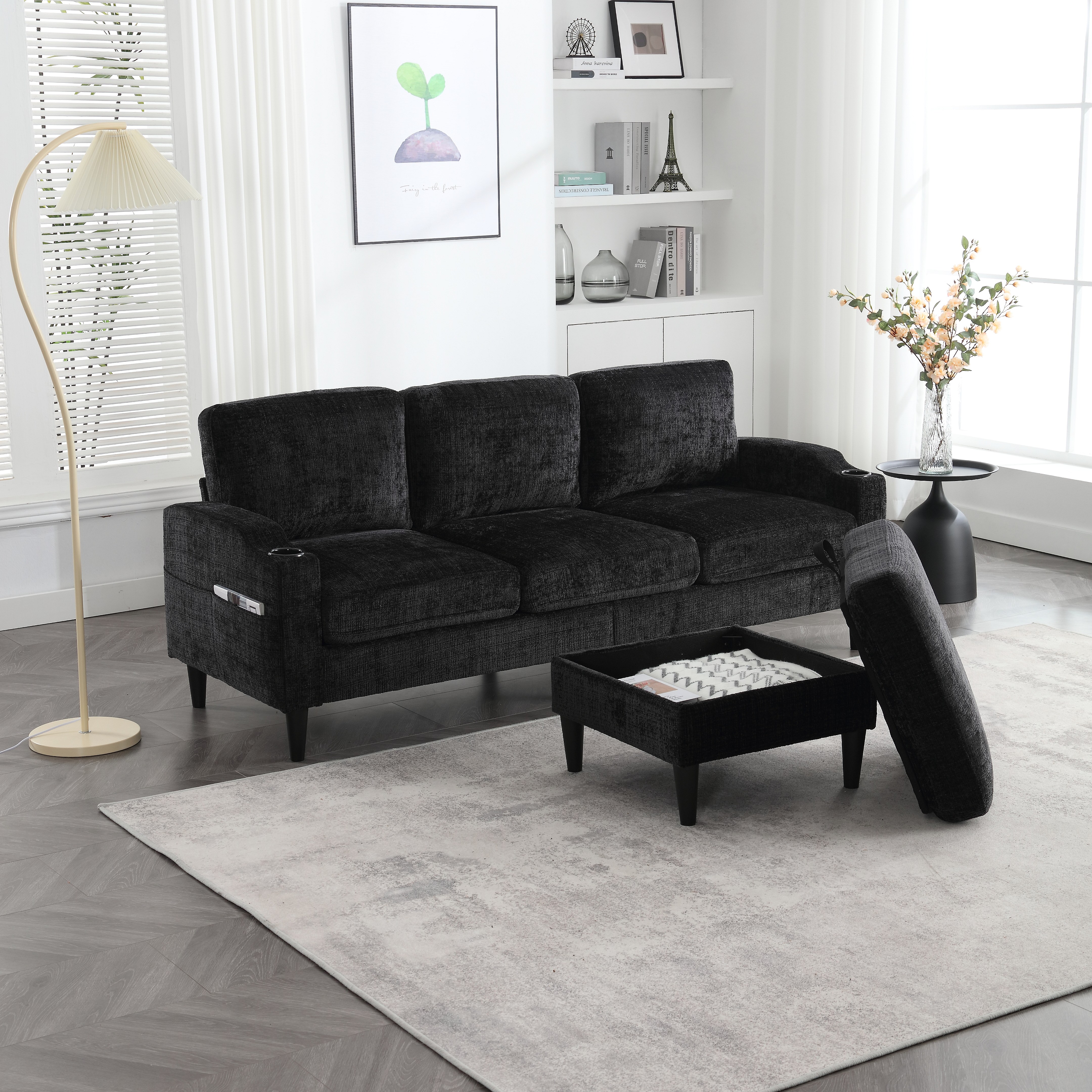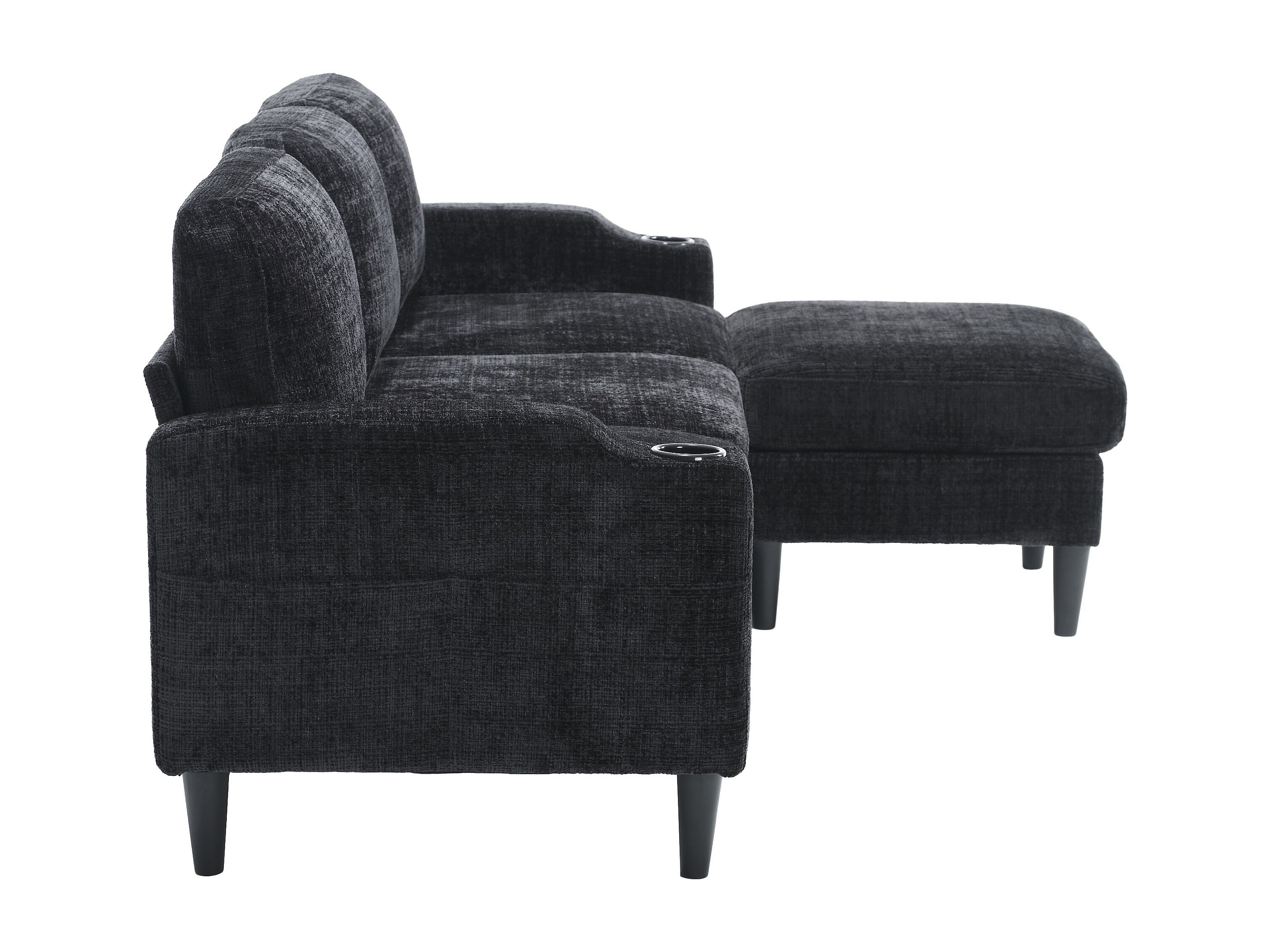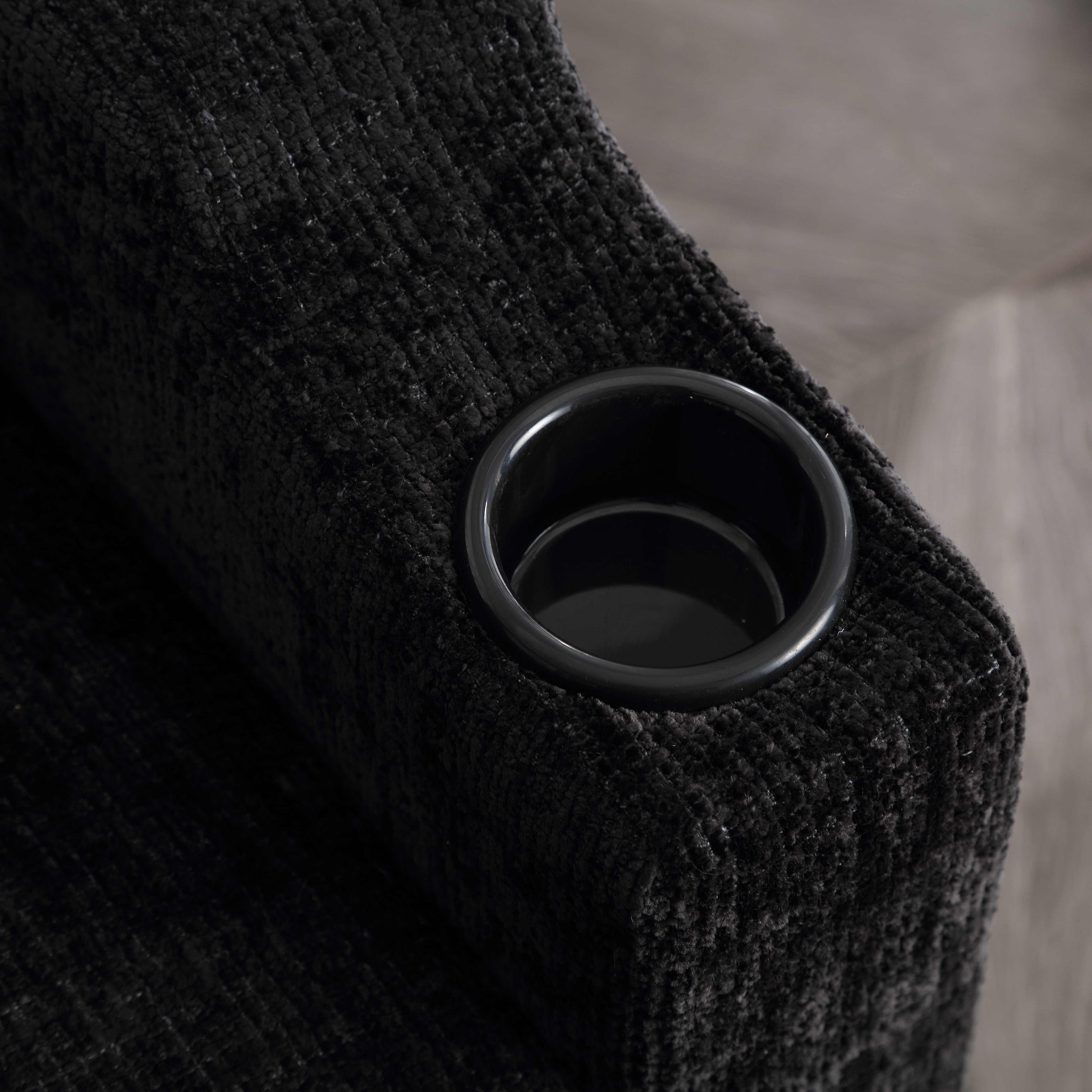 Divano dritto nero a 4 posti con poggiapiedi contenitore, tasche laterali e portabicchieri 196,5 x 75 x 77 cm