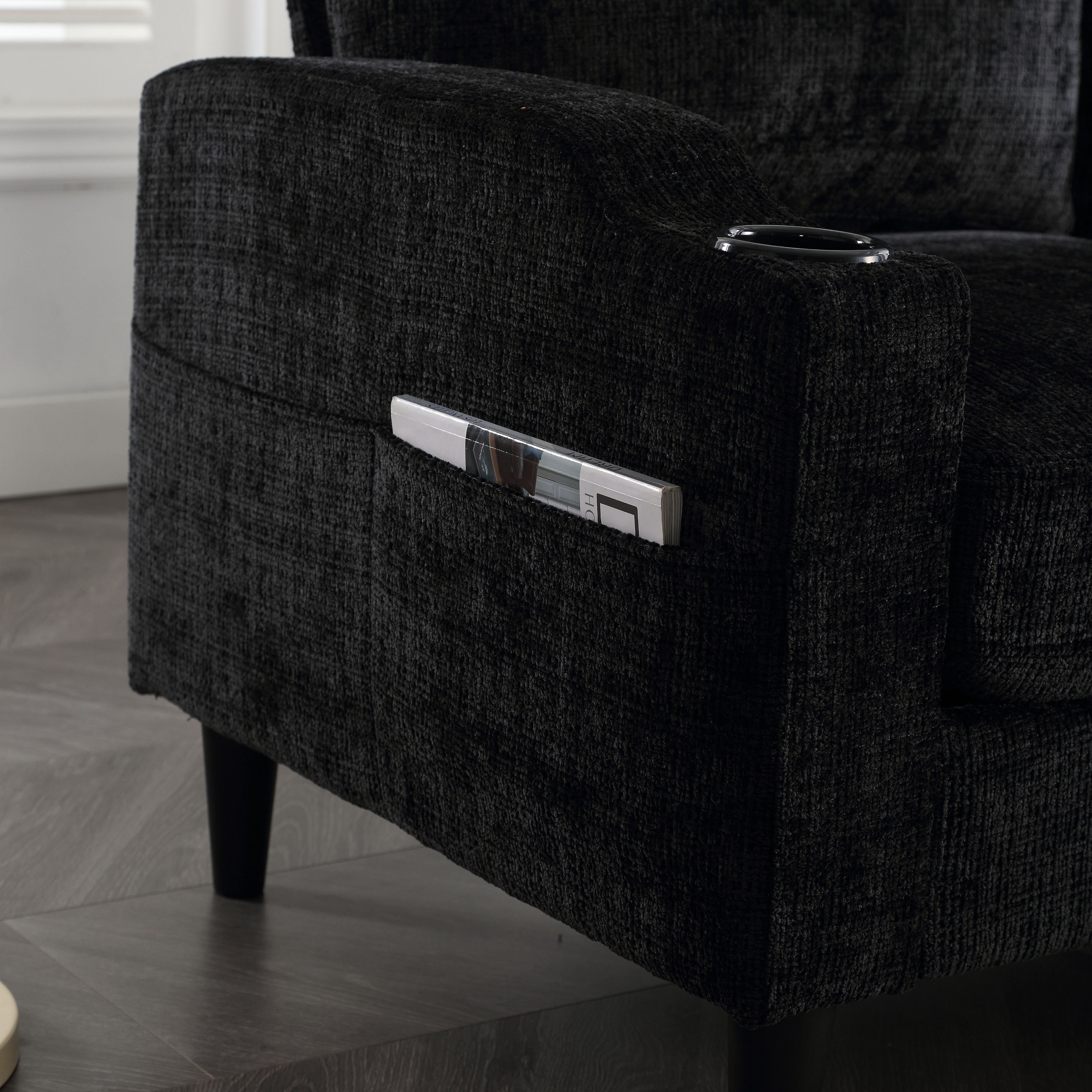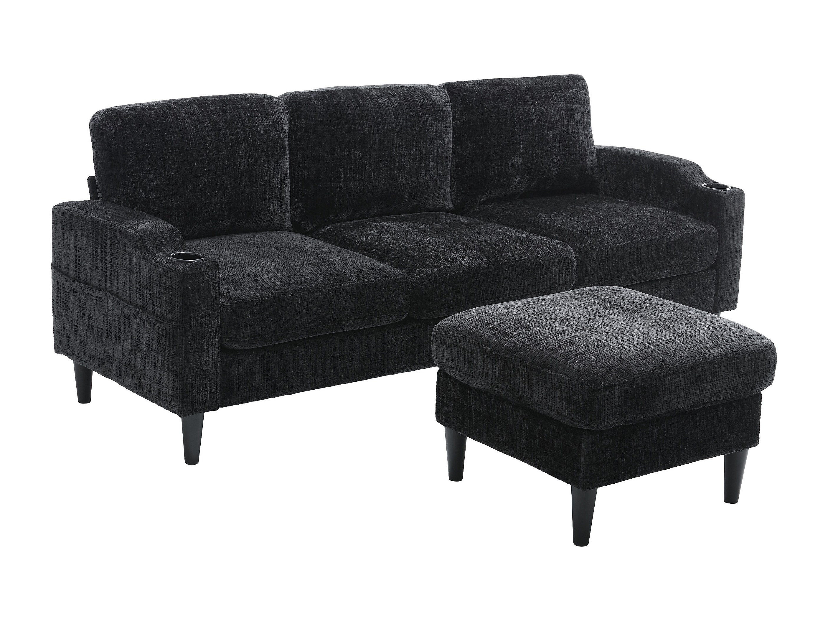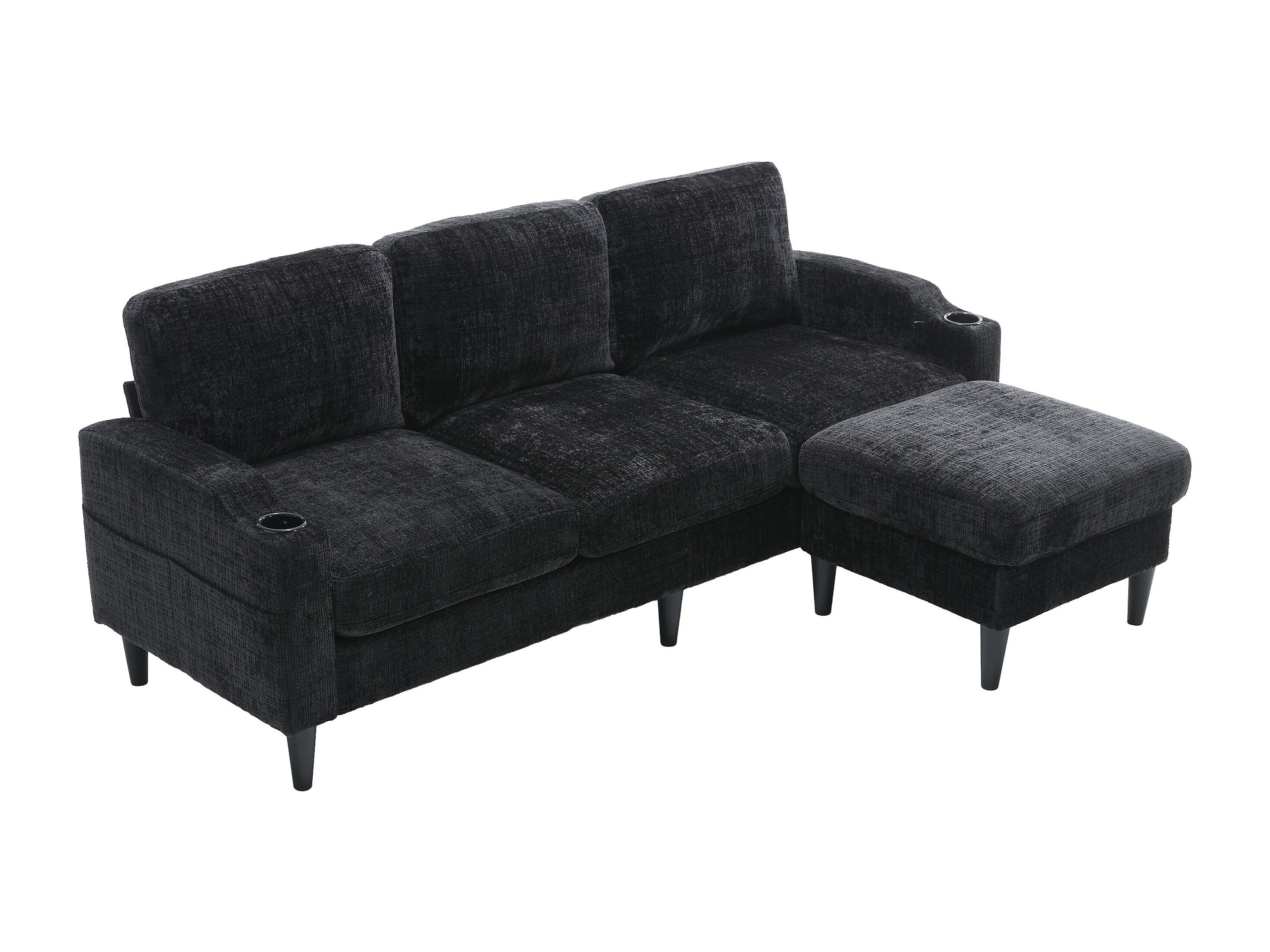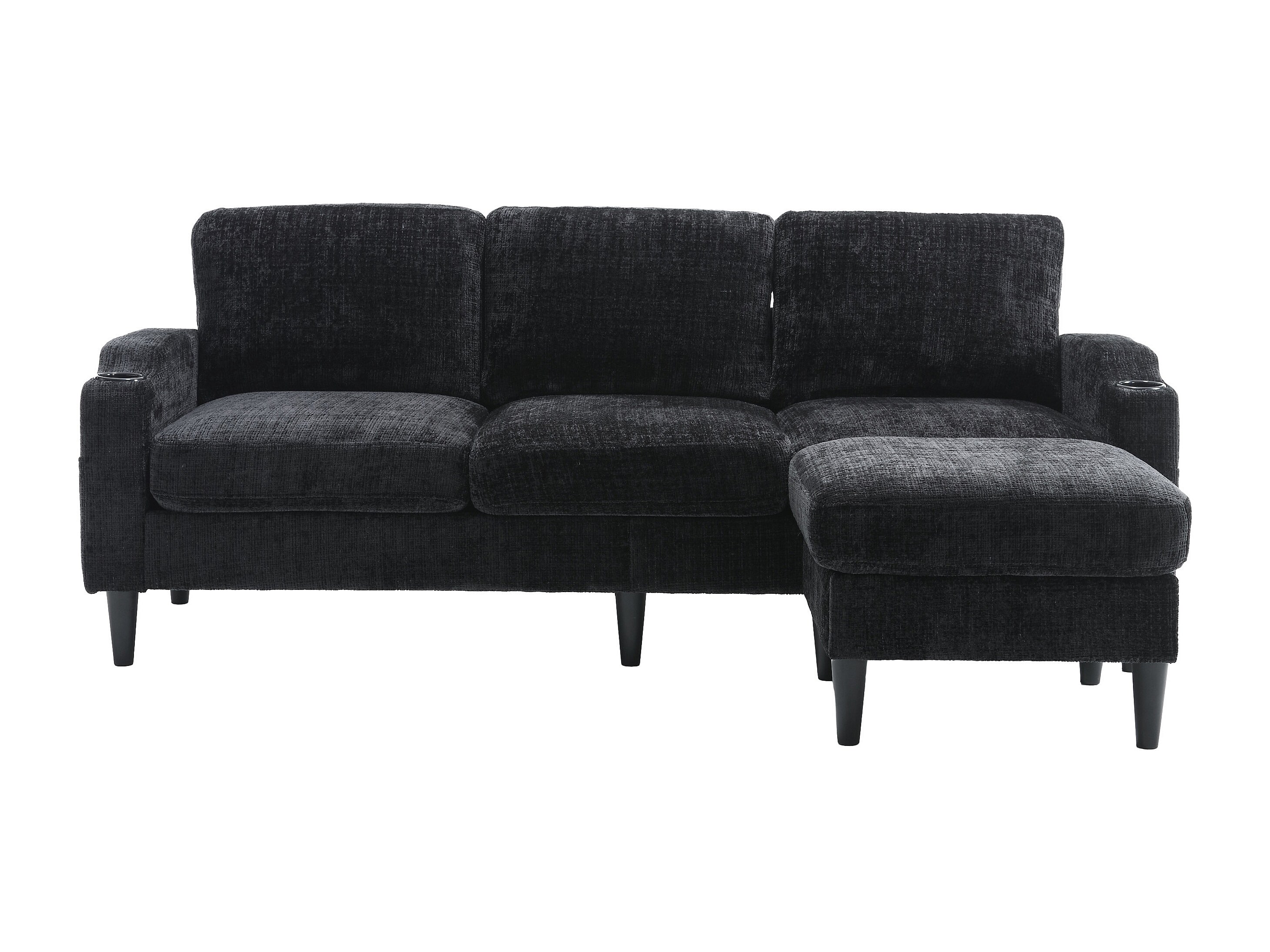 Divano dritto nero a 4 posti con poggiapiedi contenitore, tasche laterali e portabicchieri 196,5 x 75 x 77 cm