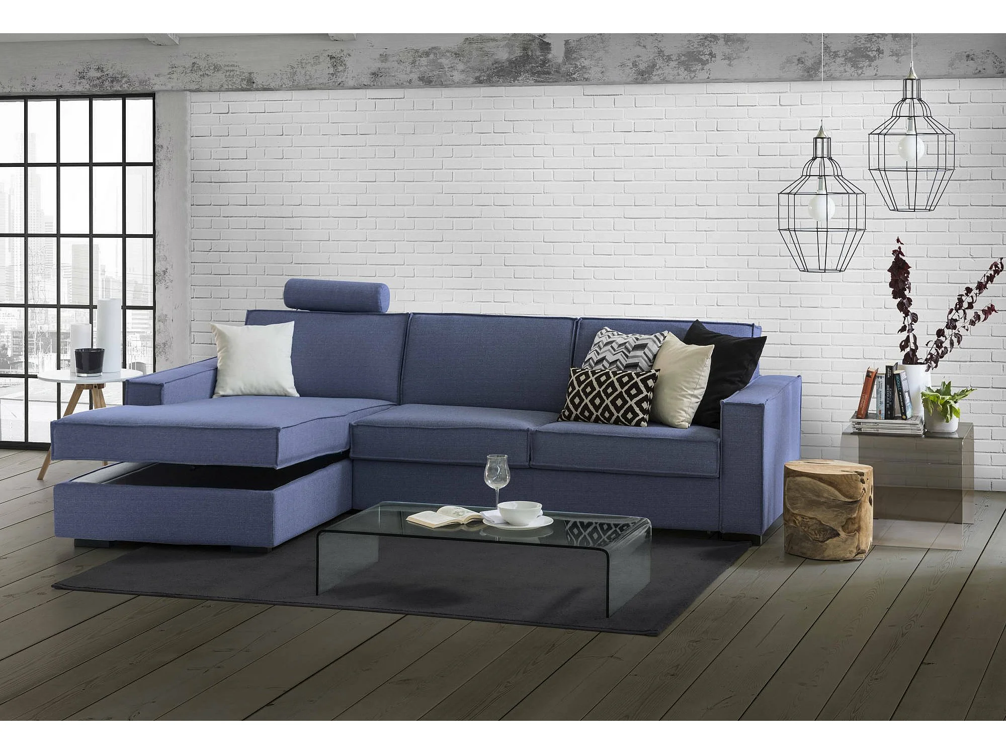 Divano fisso Perla, Divano ad angolo, 100% Made in Italy, Sofà Soggiorno con, penisola contenitore Sinistra, con Braccioli slim, Cm 260x95h90, Blu