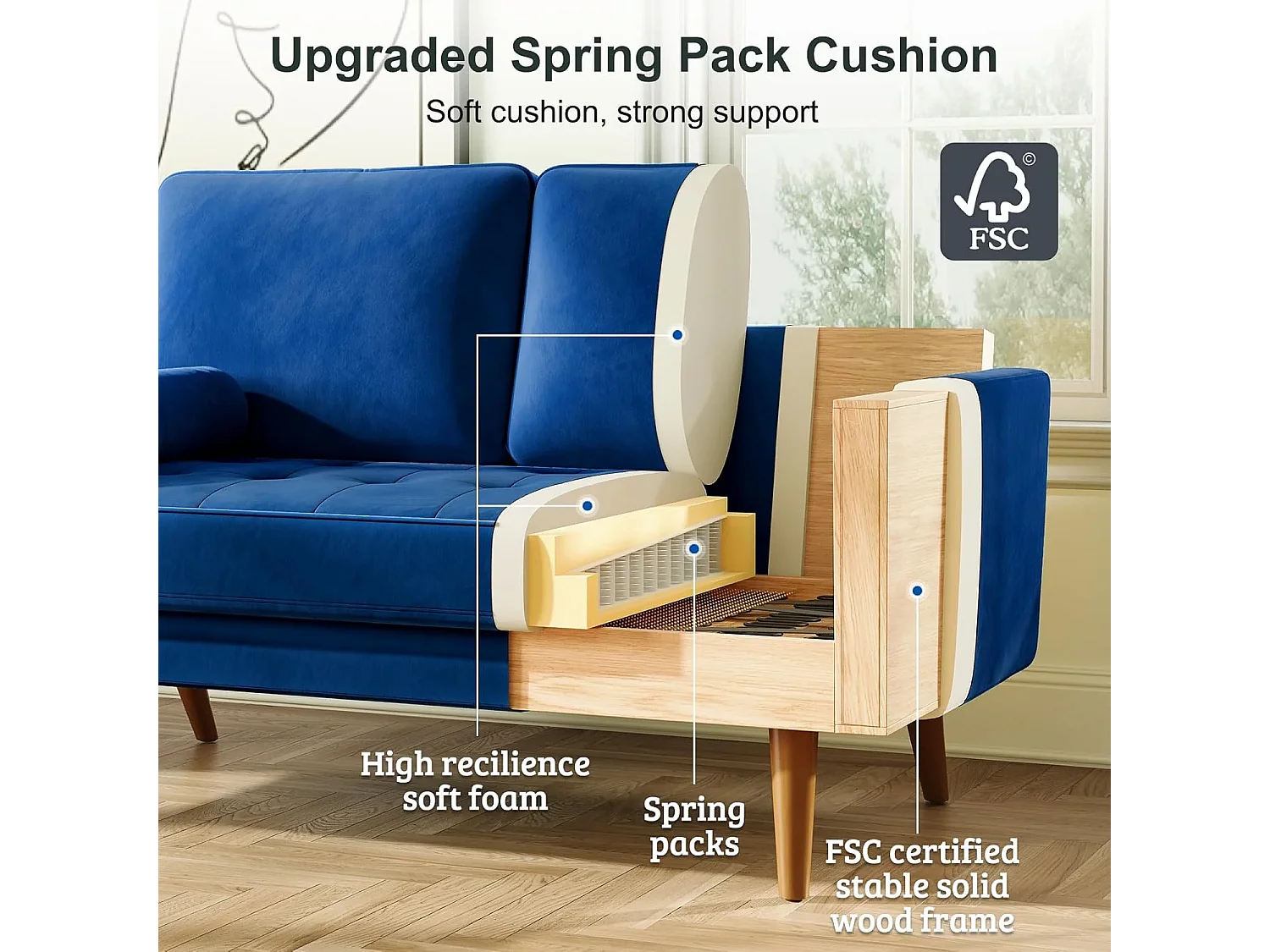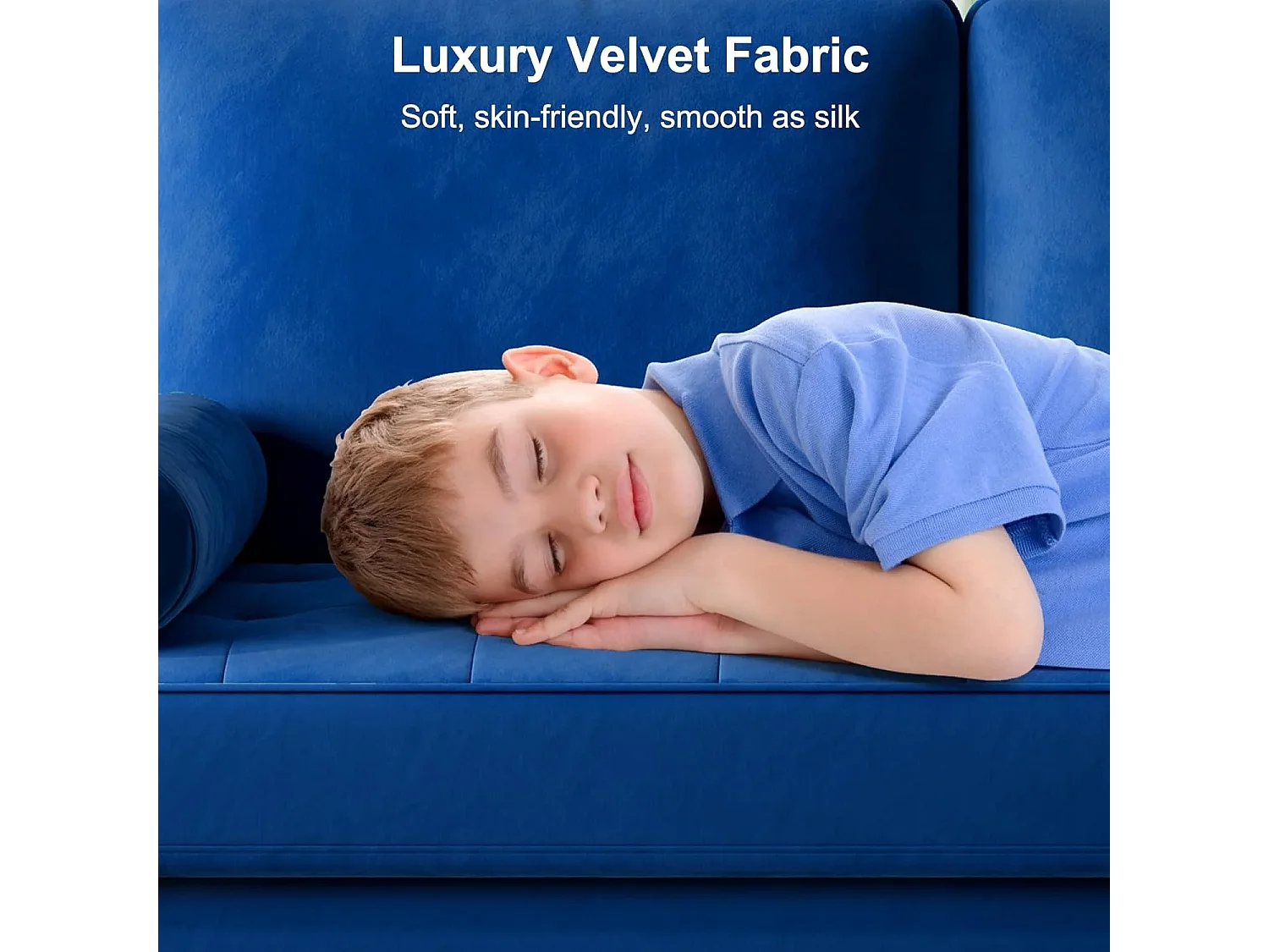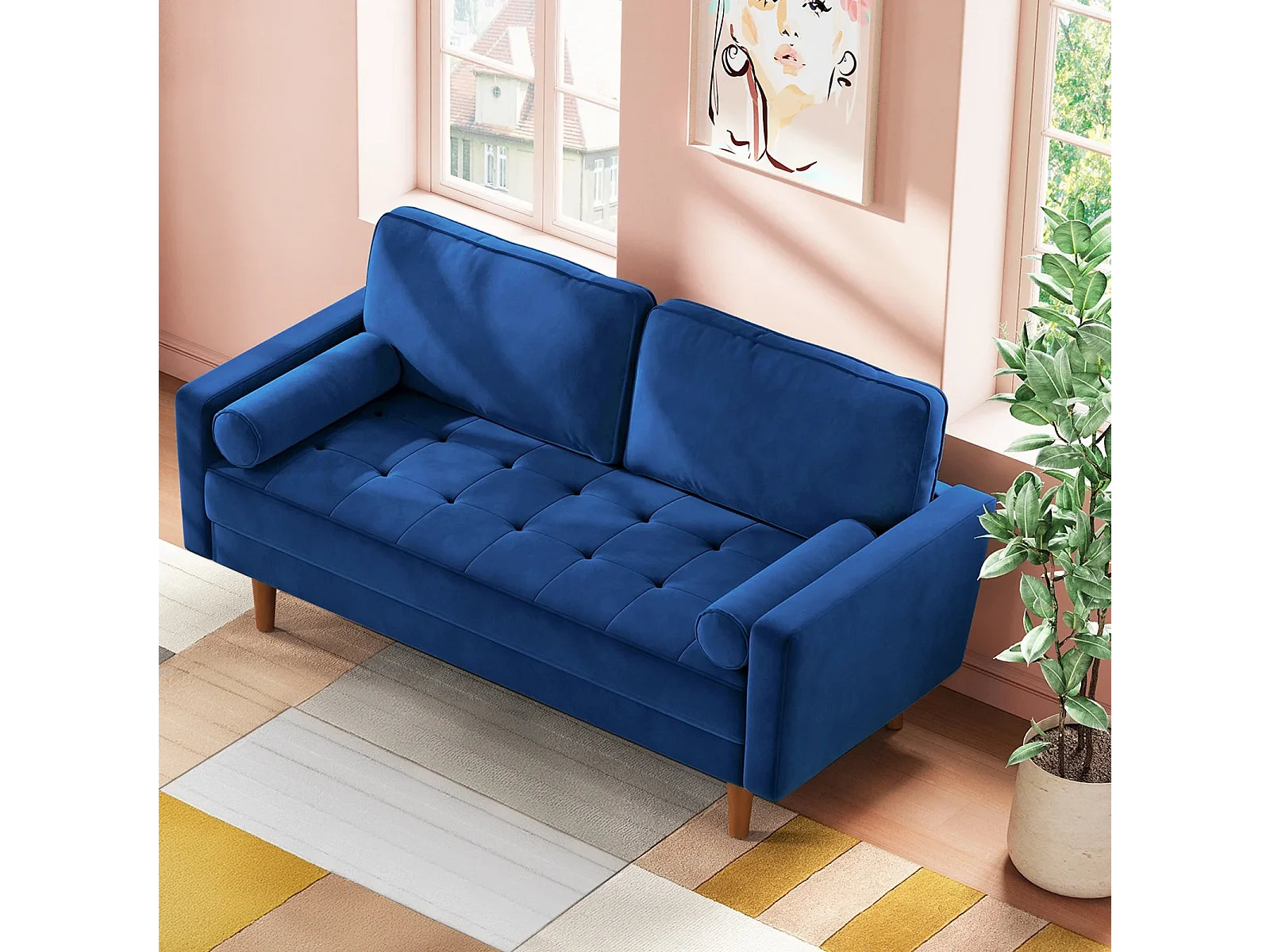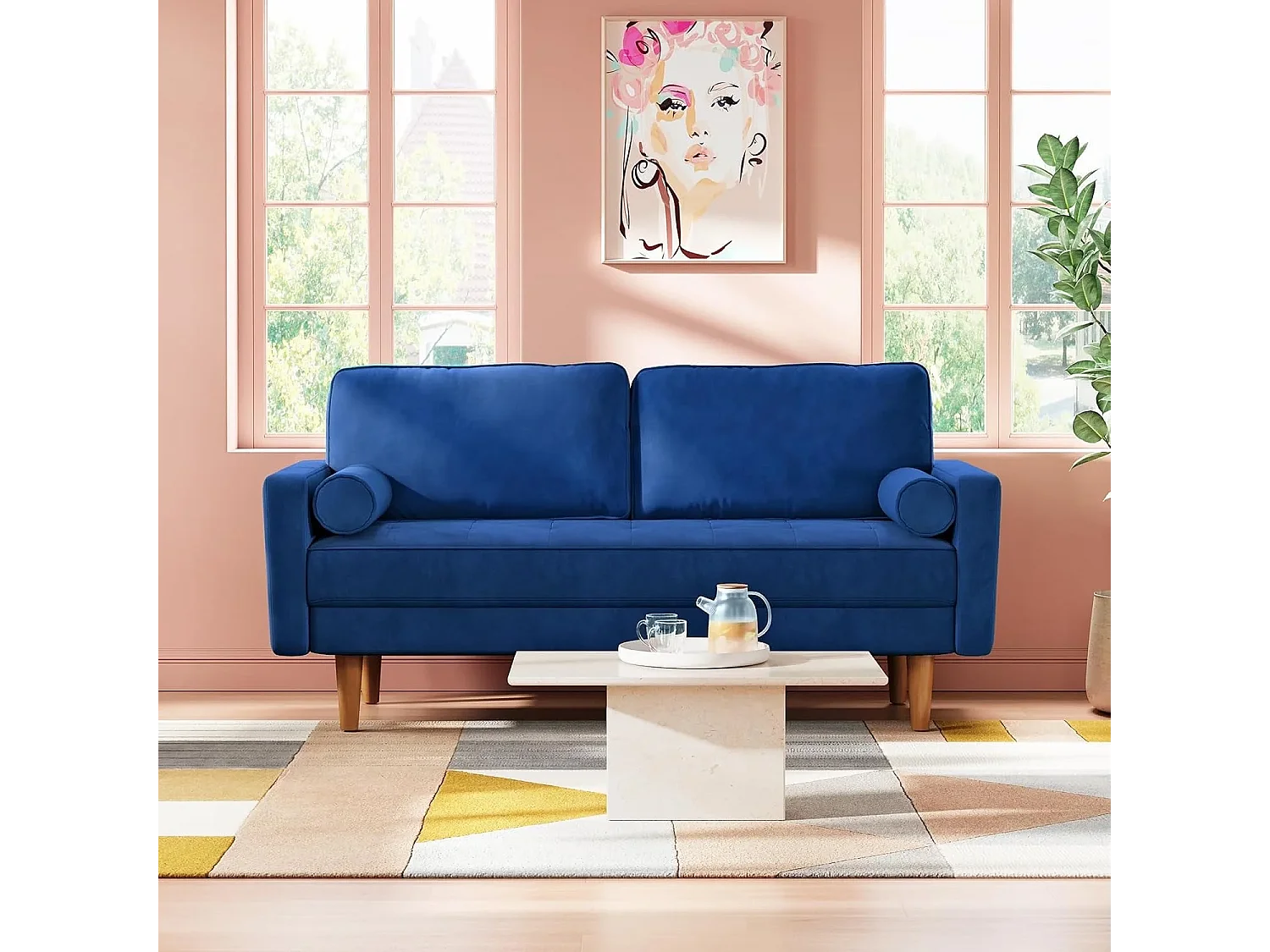 Divano in velluto blu moderno a 2 usatro, braccioli imbottiti, legno massiccio, legno morbido, 143x77x86cm