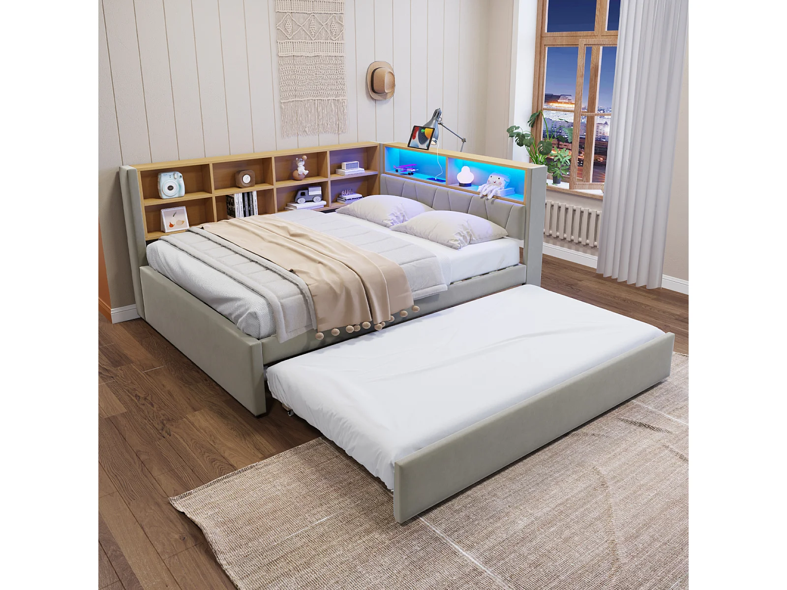 Divano letto imbottito estraibile - 140 x 200 cm + 90 x 190 cm - LED e prese - con contenitore - Tessuto flanella - Grigio chiaro