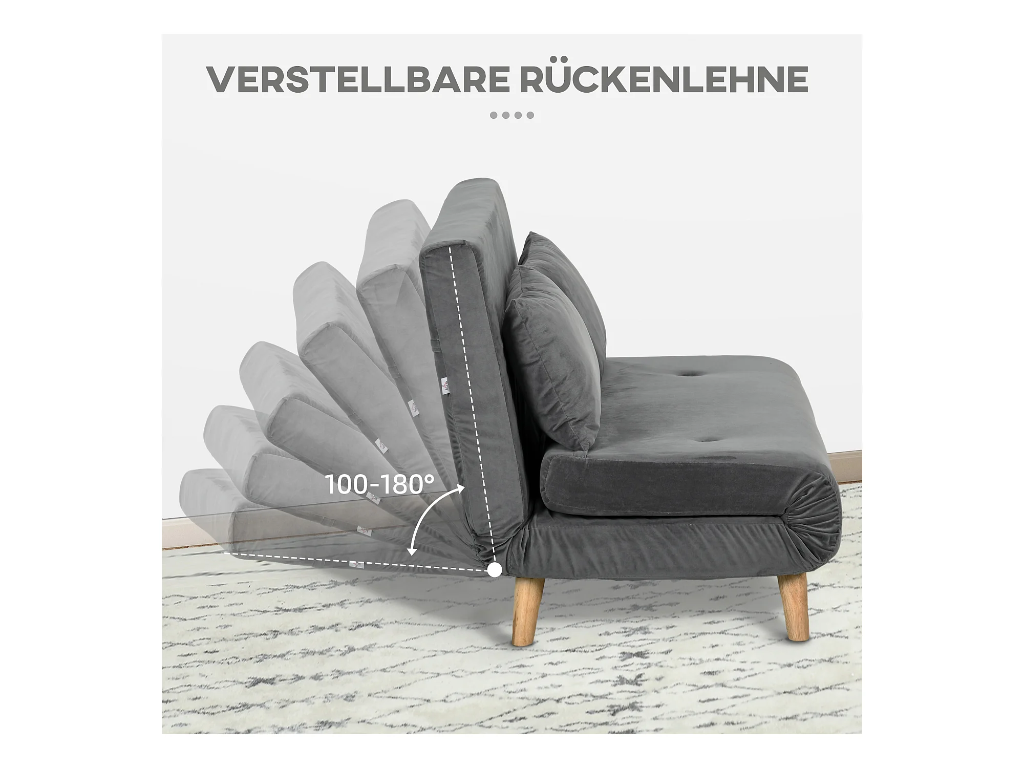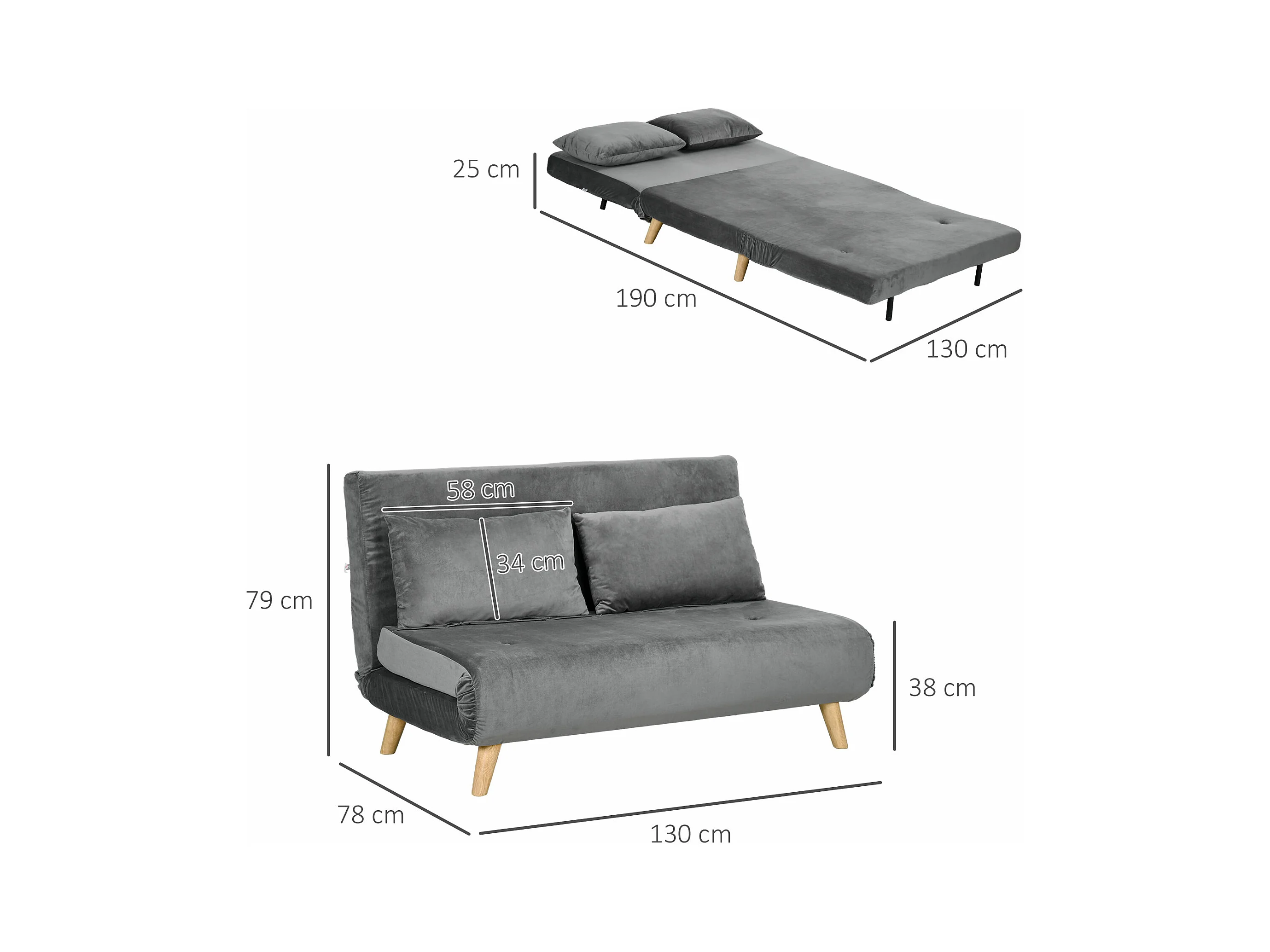 Divano letto 2 posti in velluto grigio, schienale regolabile in 6 posizioni, trasformabile in letto 72x190 cm, compatto e confortevole – 130x78x79 cm