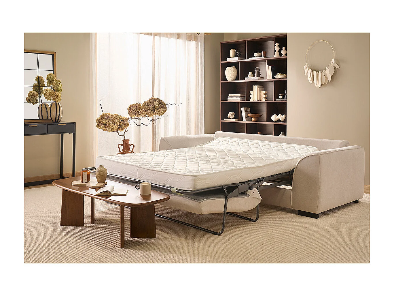 Divano letto 3 posti in tessuto effetto velluto beige con materasso 12 cm ARMAND