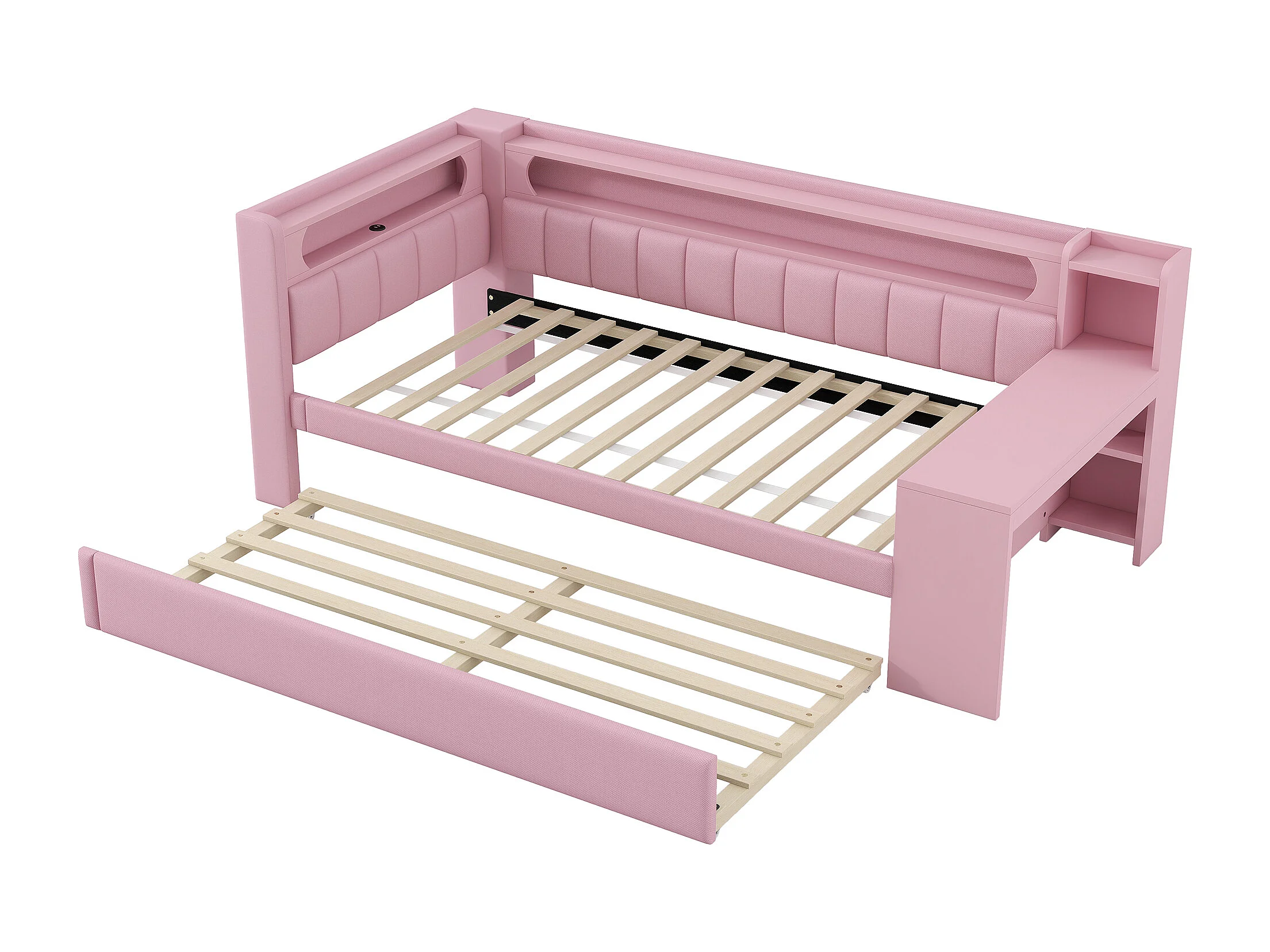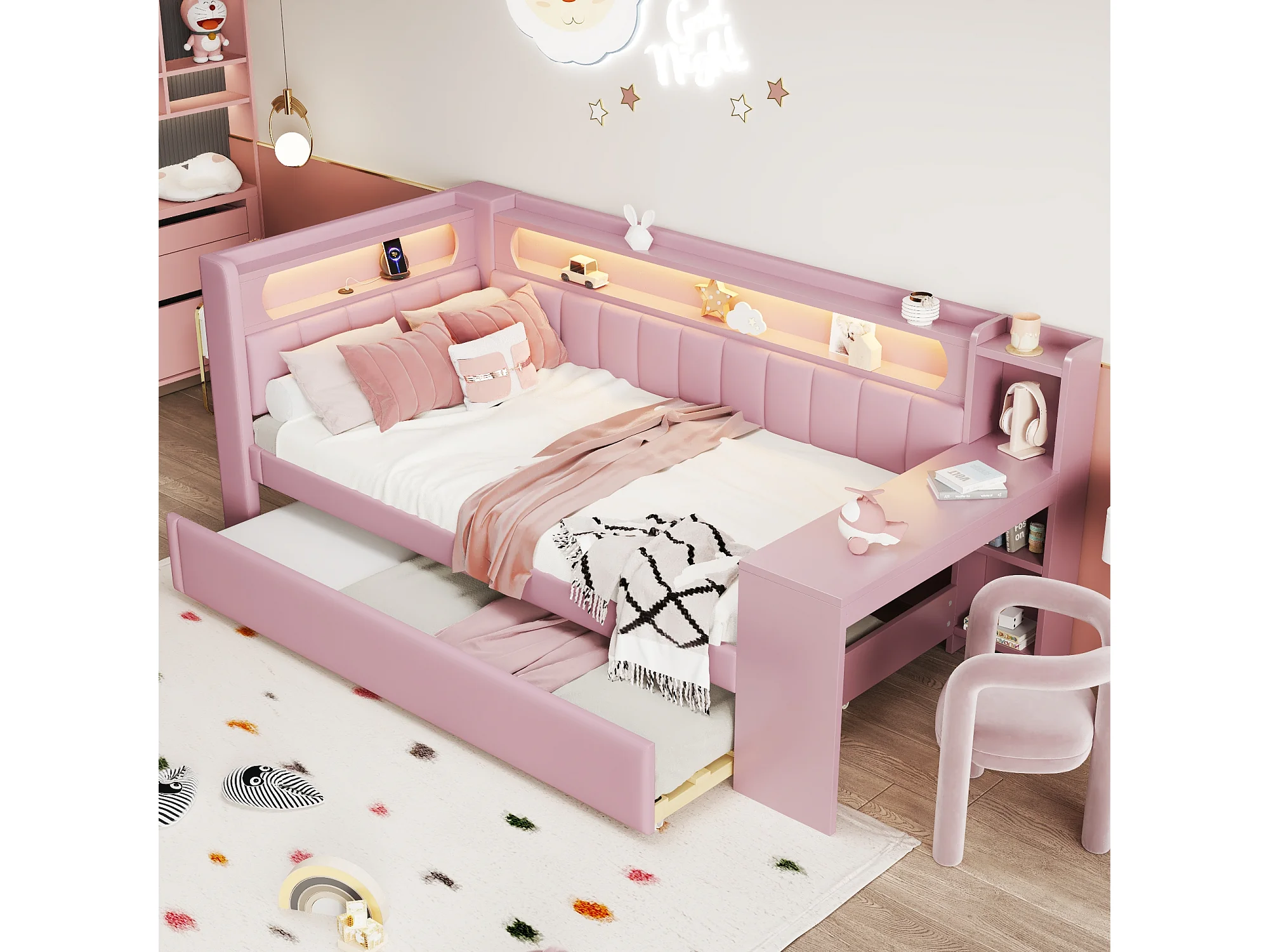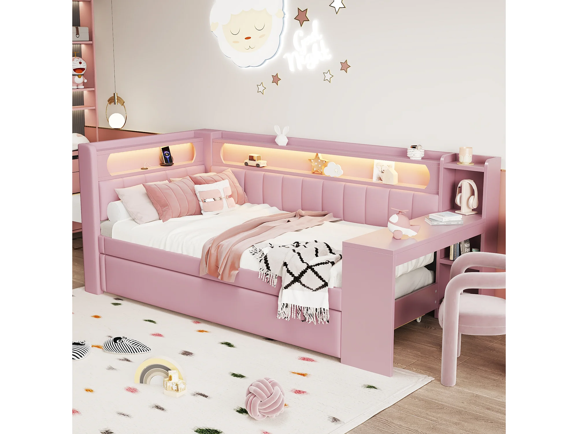 Divano letto - 90 x 200 + 90 x 190 cm - con LED + letto estraibile + scrivania + contenitore - MDF + lino - rosa