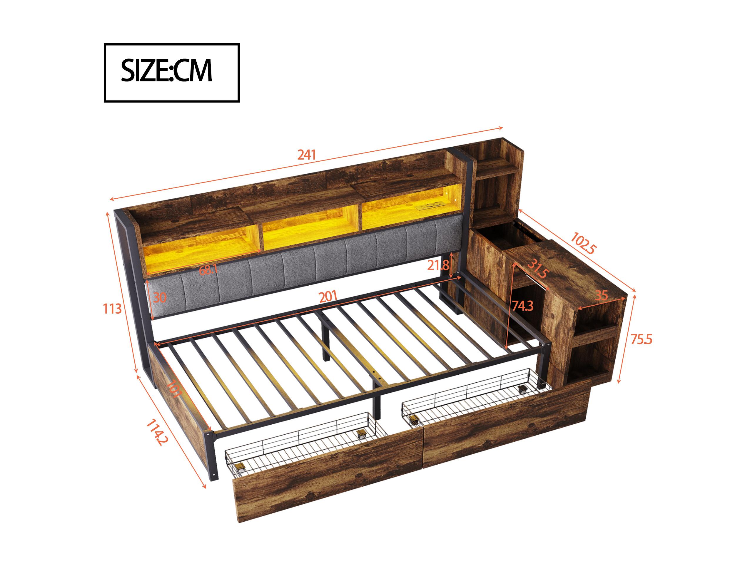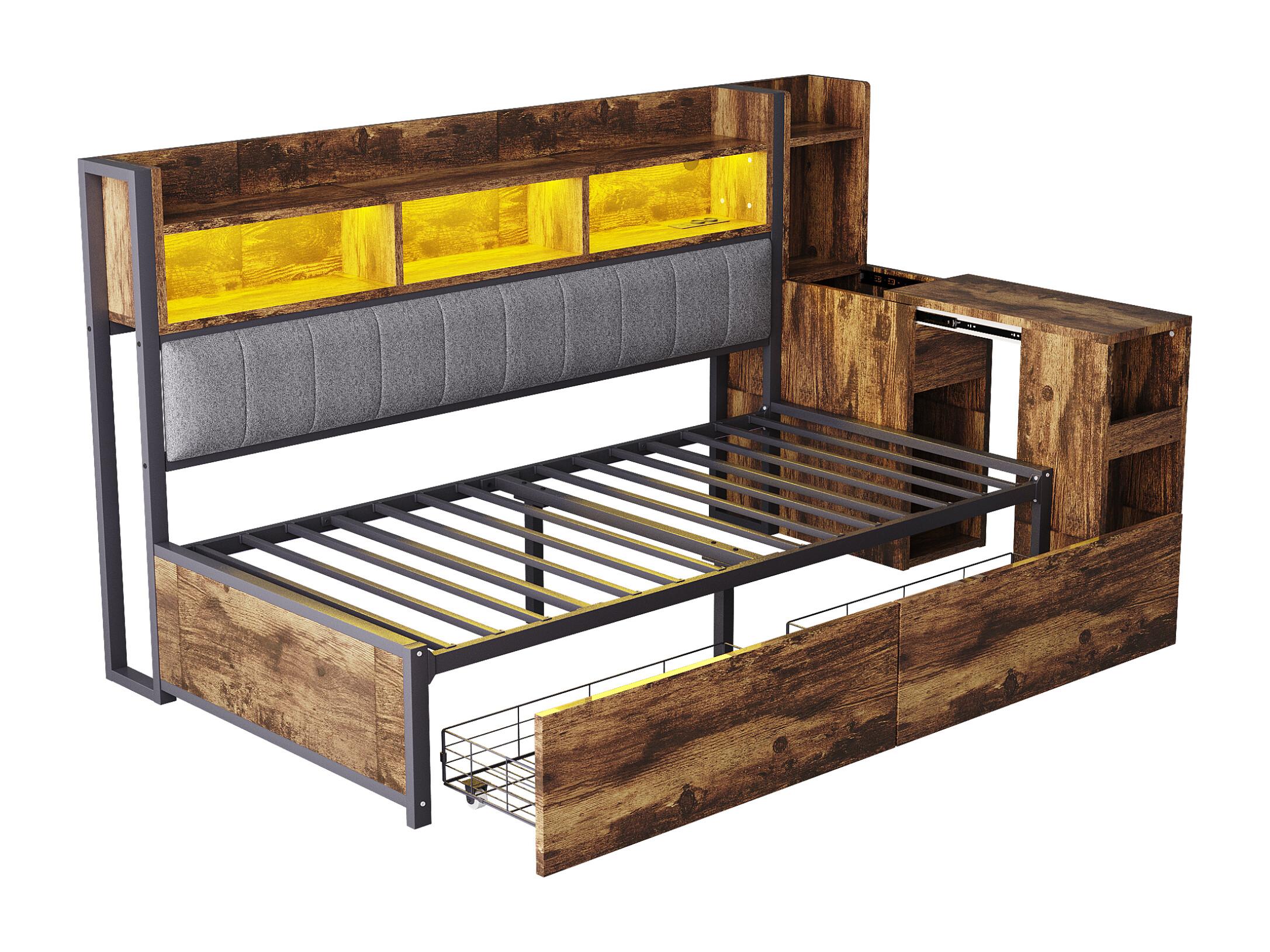 Divano letto 90x200 cm - con illuminazione LED e prese - con 2 cassetti - con scrivania scorrevole - con compartimenti di archiviazione - colore naturale