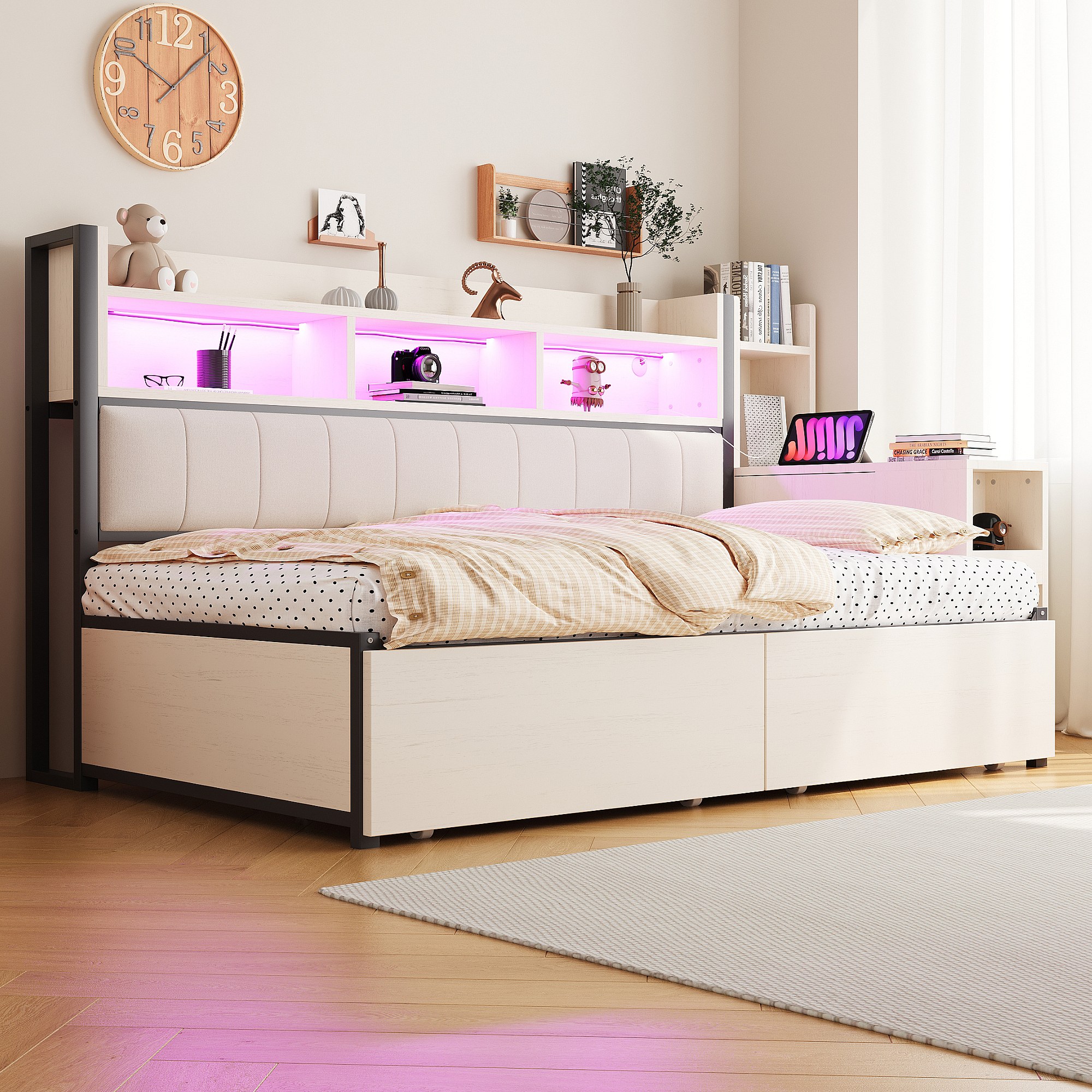 Questo letto singolo dispone di diversi scomparti per riporre giocattoli, libri, oggetti decorativi e altri effetti personali. Inoltre, due ampi cassetti sotto il letto offrono spazio per biancheria, vestiti e altri elementi essenziali.