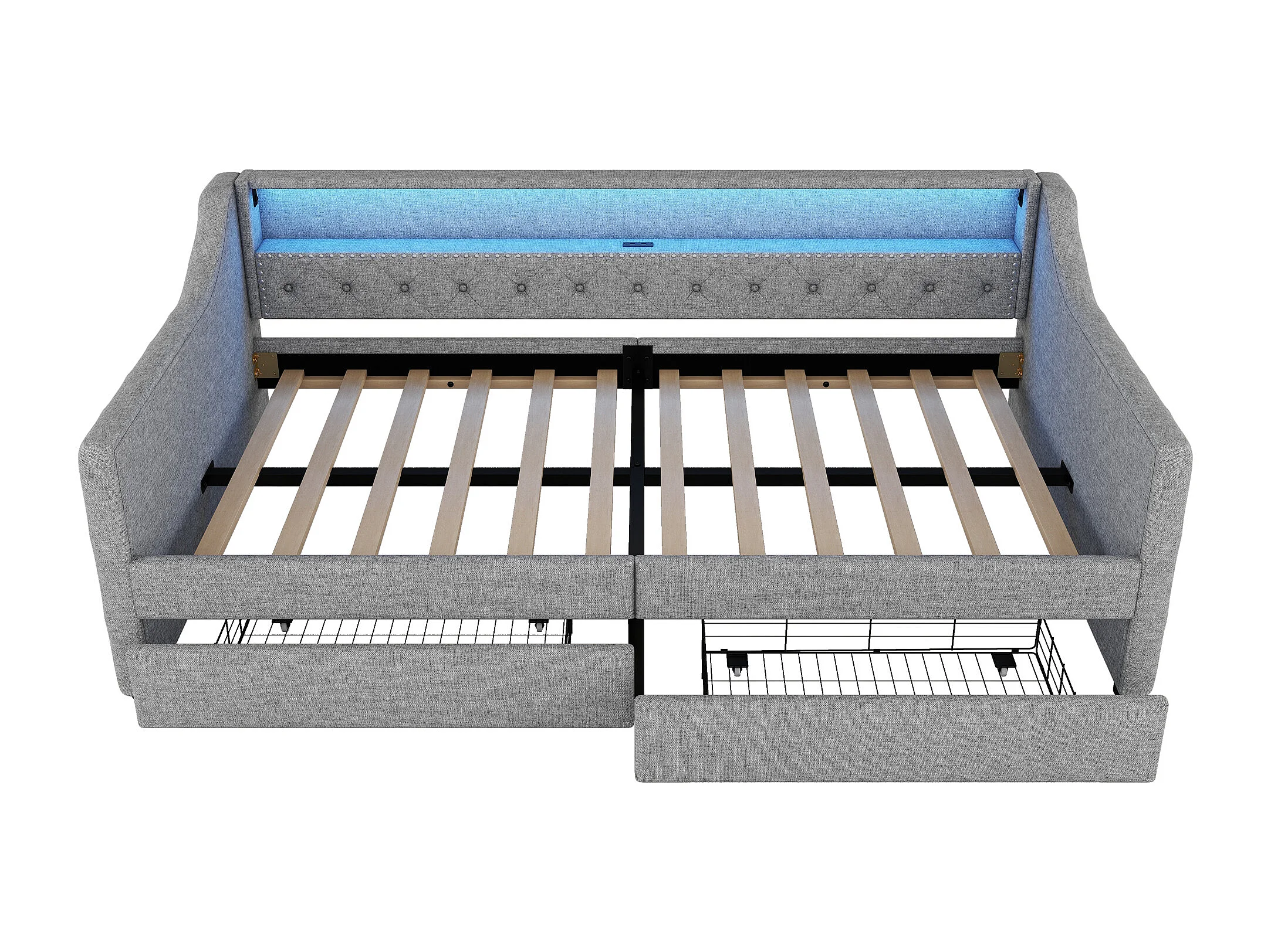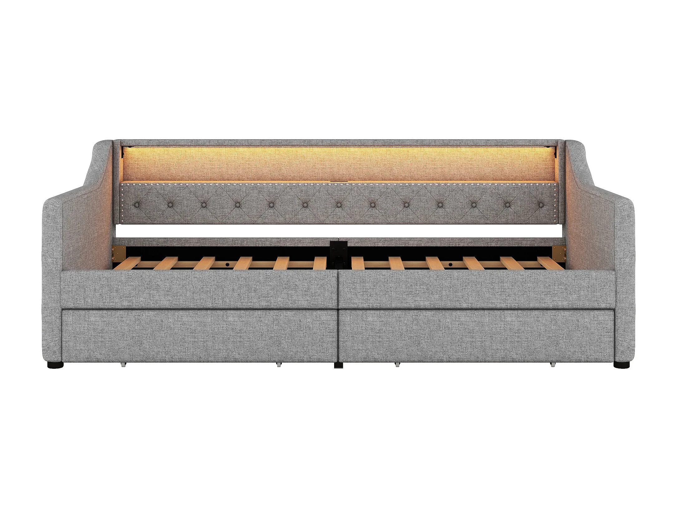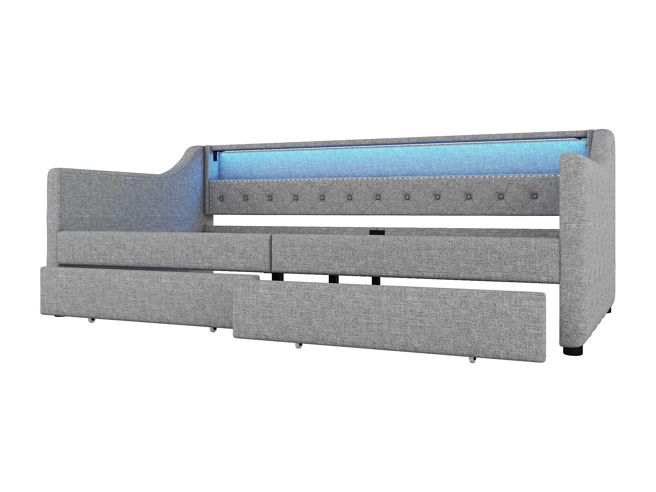 Divano letto 90x200 cm, lino grigio, letto per adulti con ricarica USB e illuminazione, 2 cassetti, senza materasso