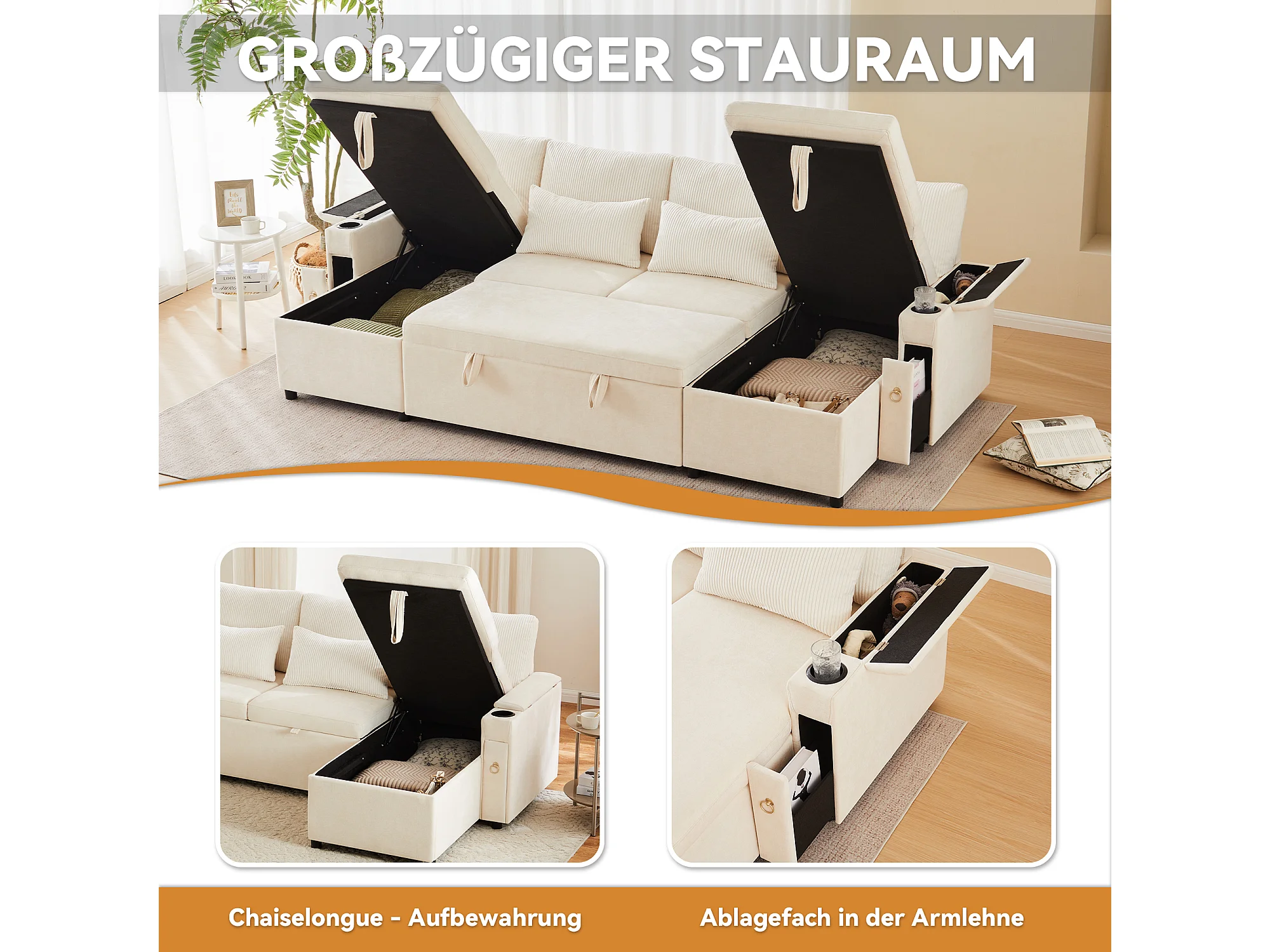 Divano letto estraibile 4 posti - 272 x 131 x 84 cm - con portabicchieri + contenitore + cuscini - velluto - beige