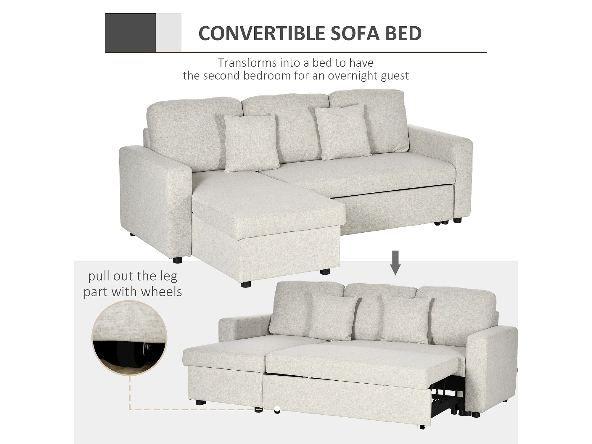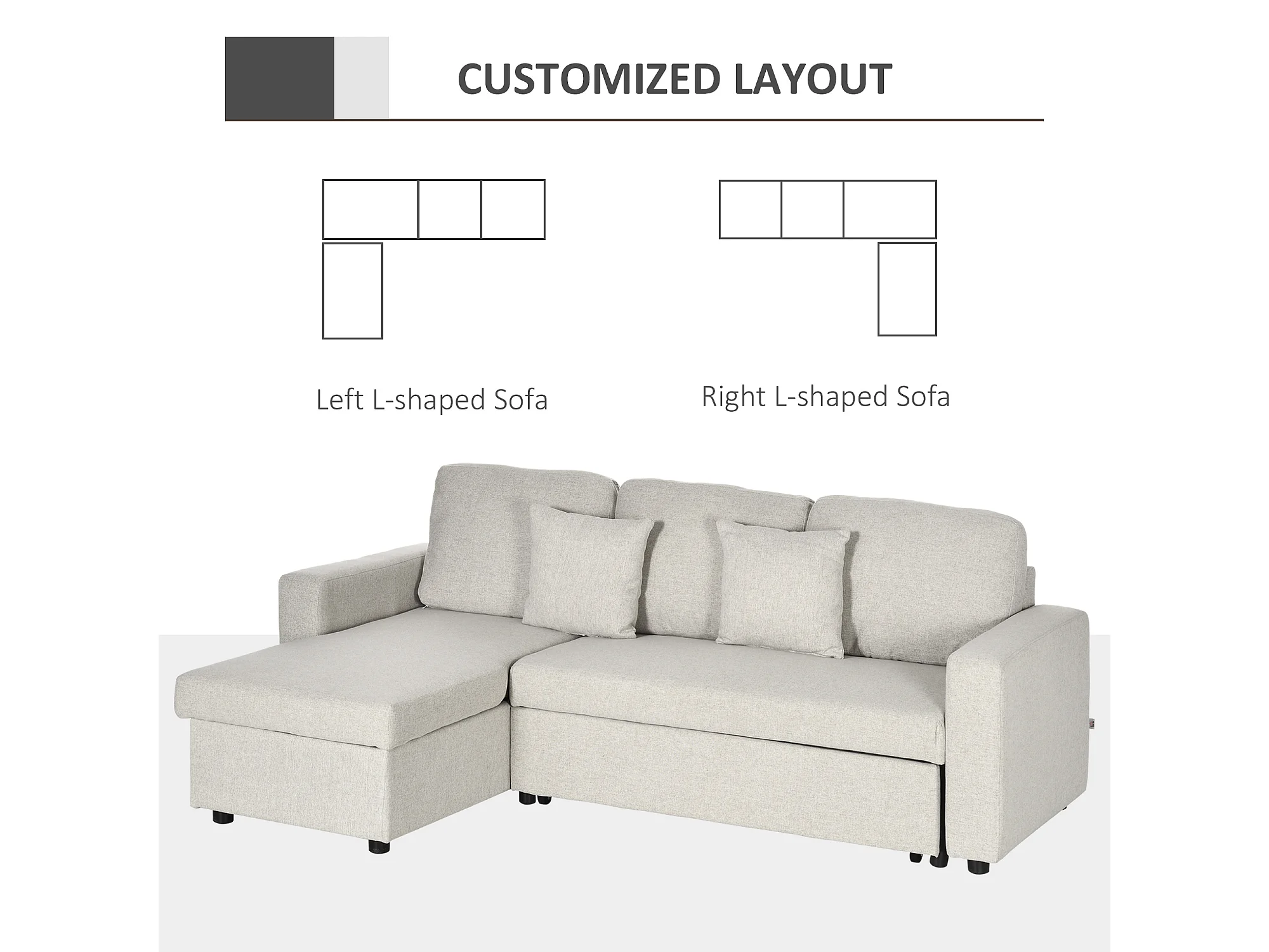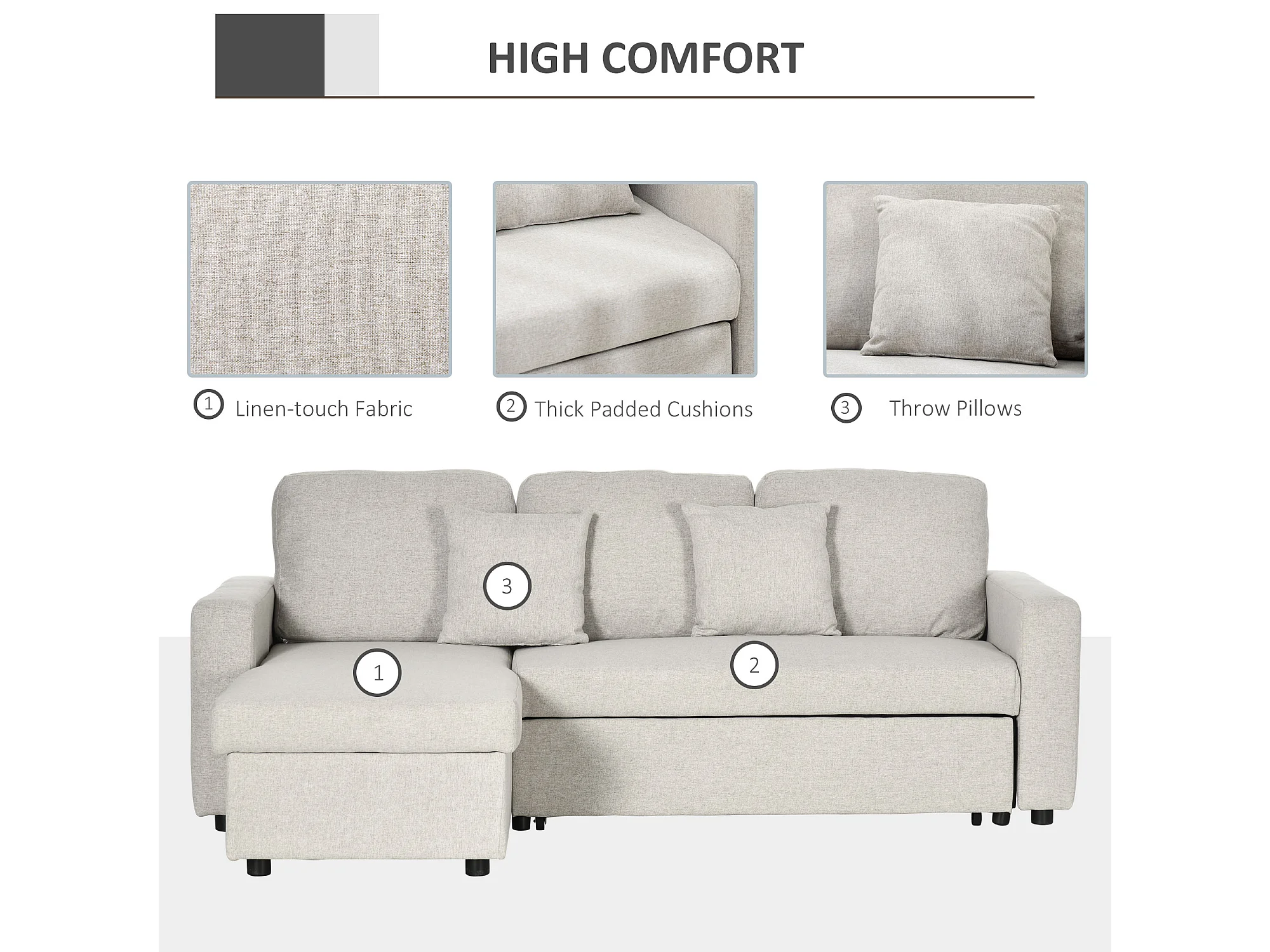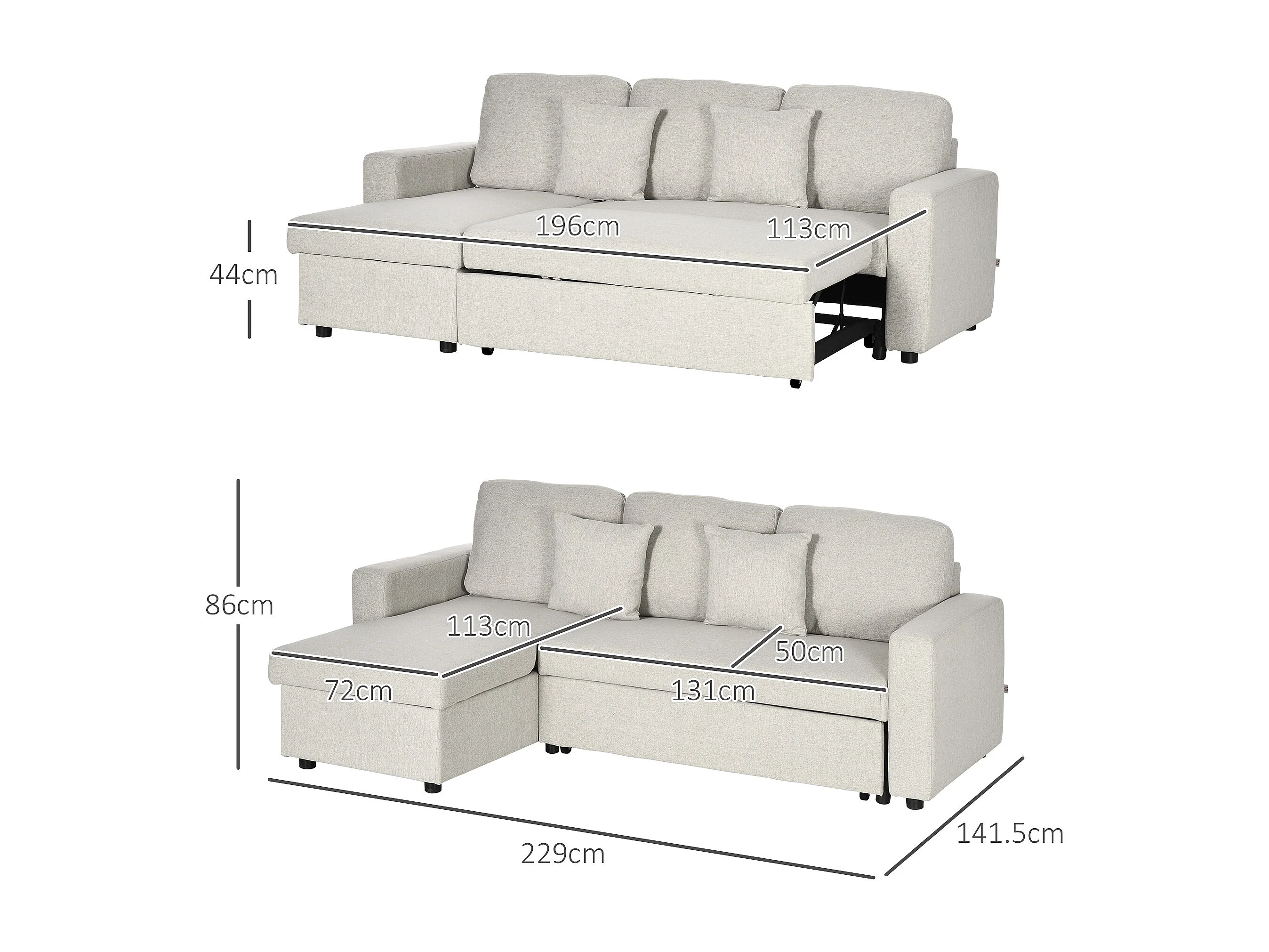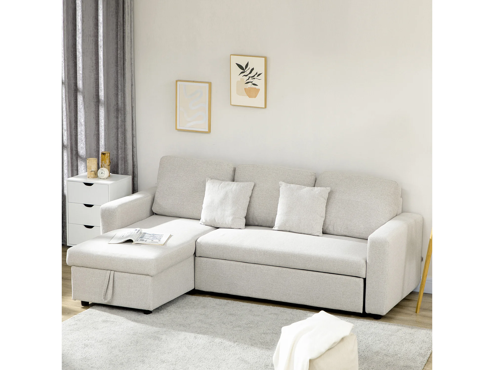 Divano letto angolare con penisola contenitore in tessuto crema