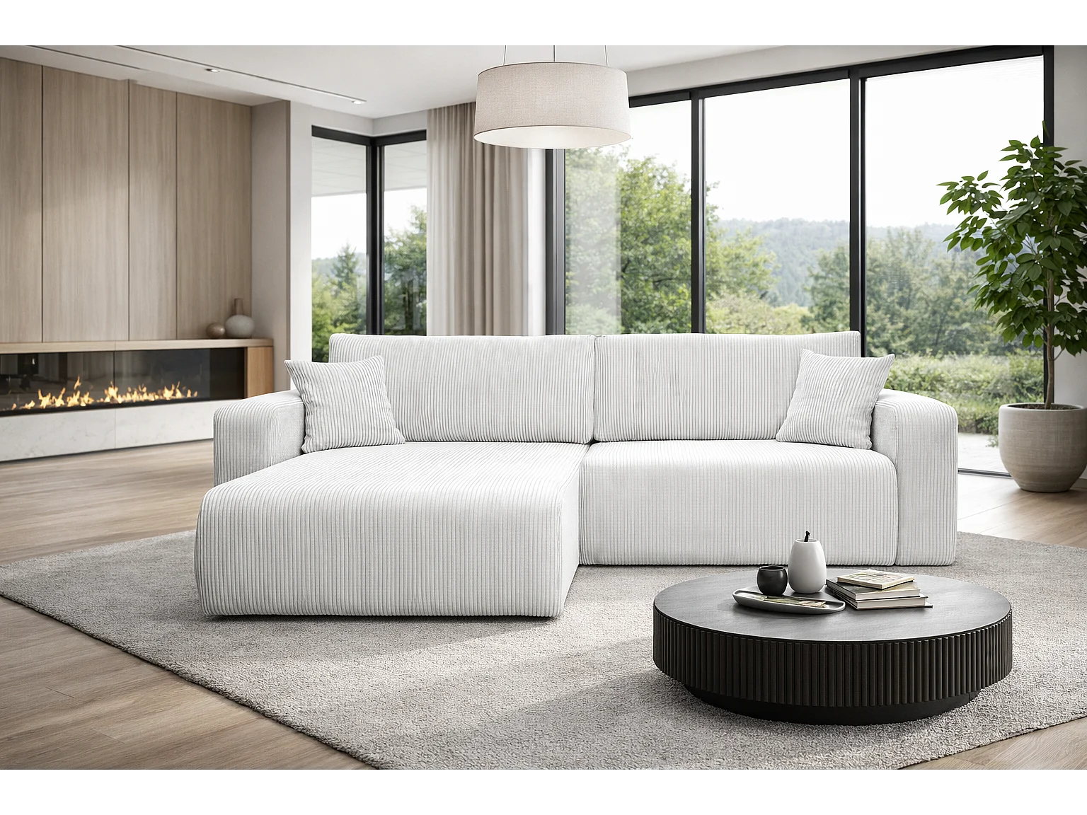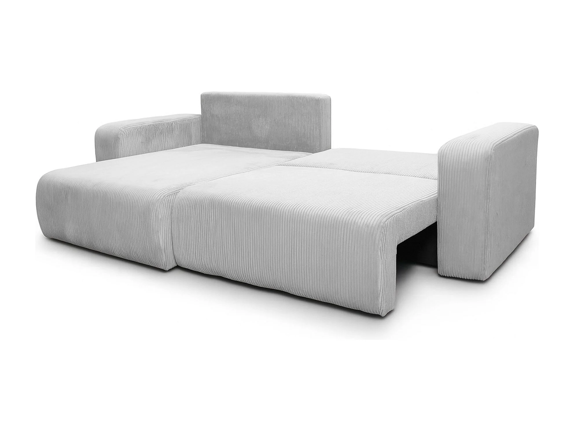 Divano letto angolare reversibile con vano contenitore universale in velluto a coste bianco Flora L