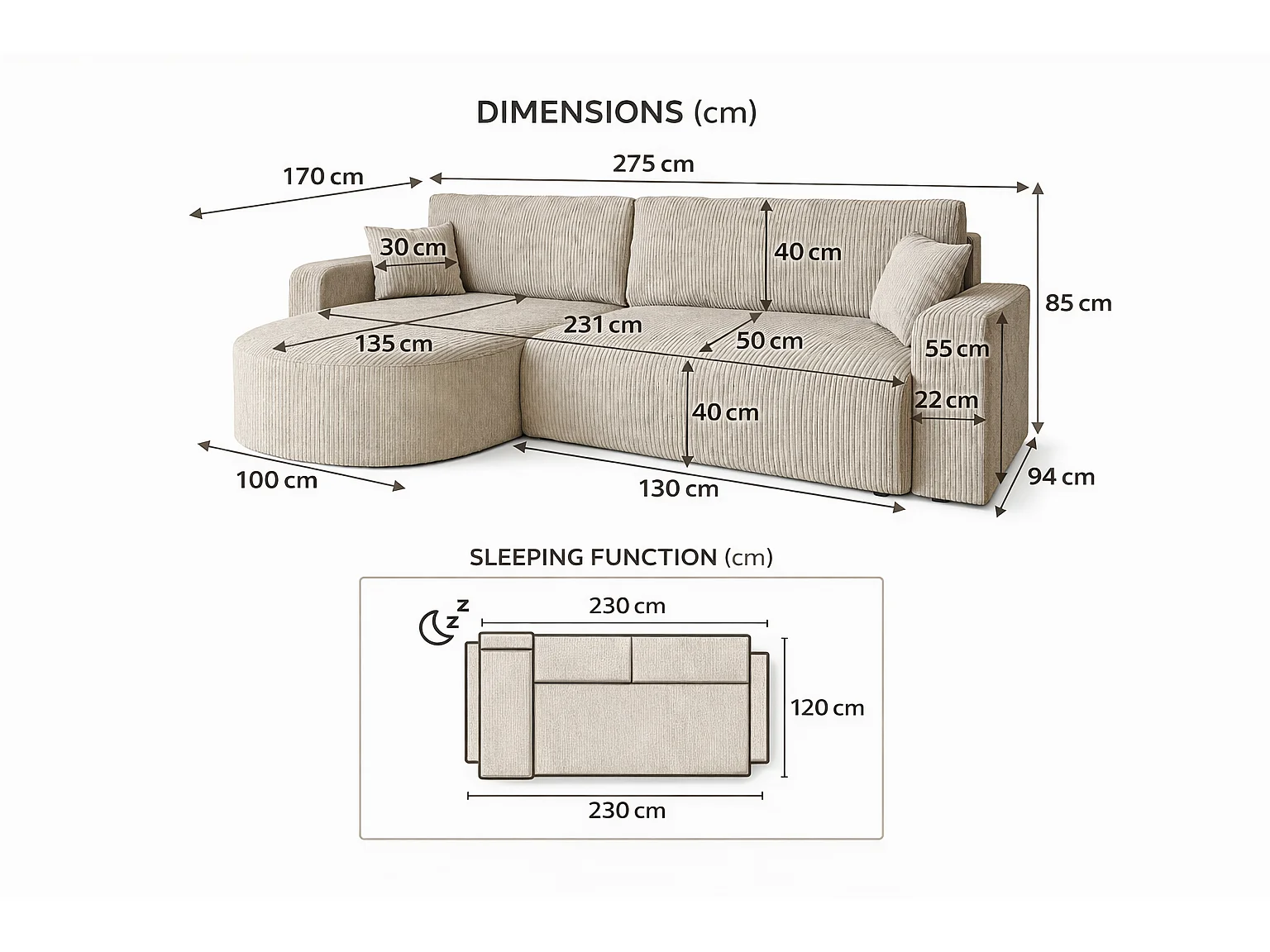 Divano letto angolare reversibile con vano contenitore universale in velluto a coste bianco Kimo XL
