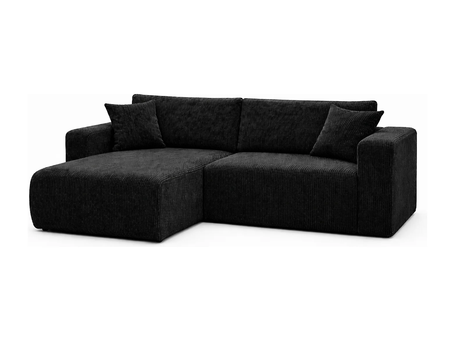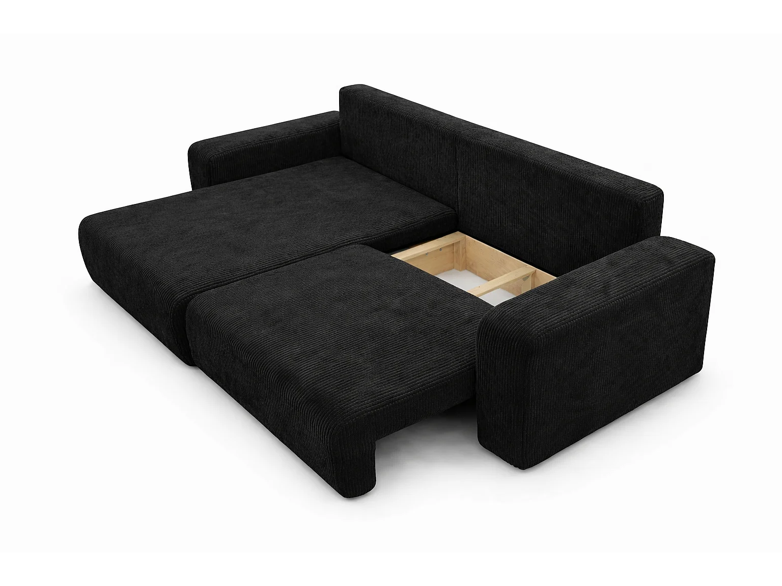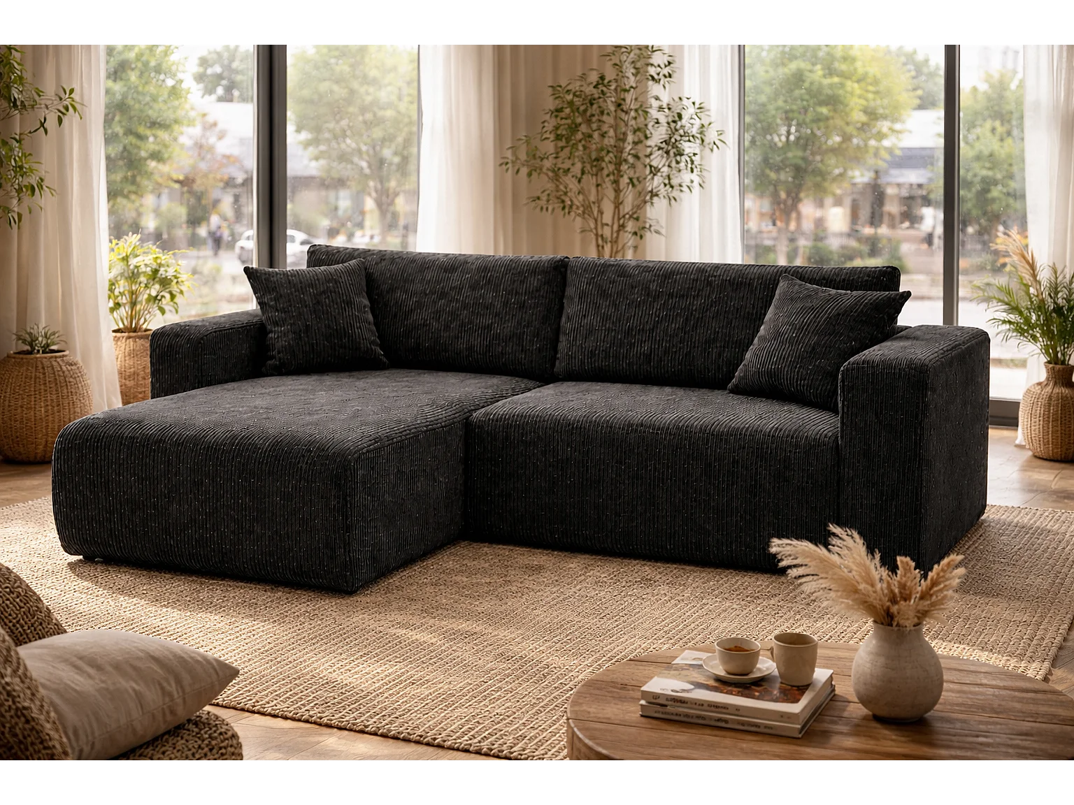 Divano letto angolare reversibile con vano contenitore universale in velluto a coste nero Flora L