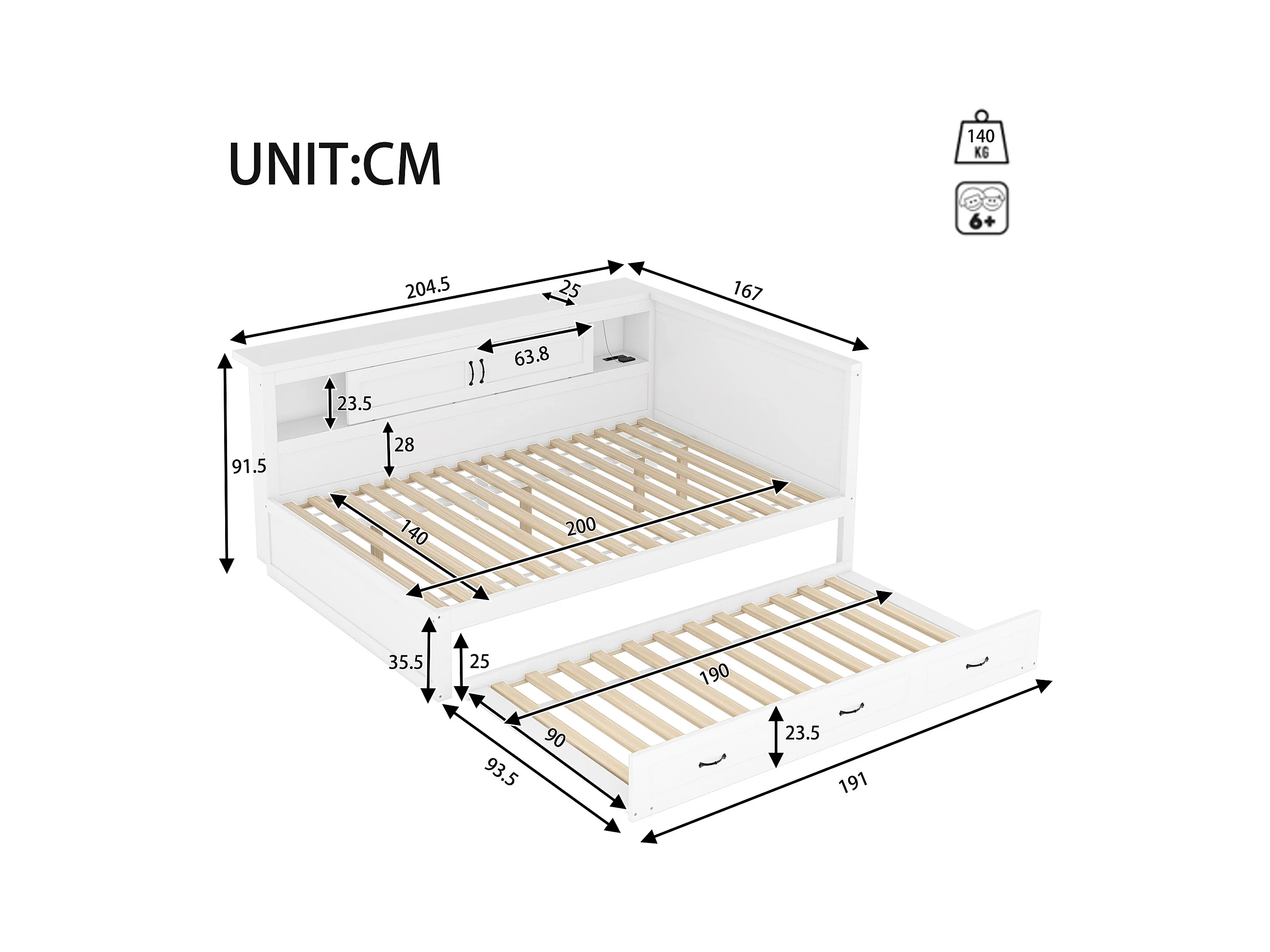 Letto estraibile 140x200cm+90x190cm, con 3 cassetti, con rete a doghe e testiera con diversi vani contenitore, bianco