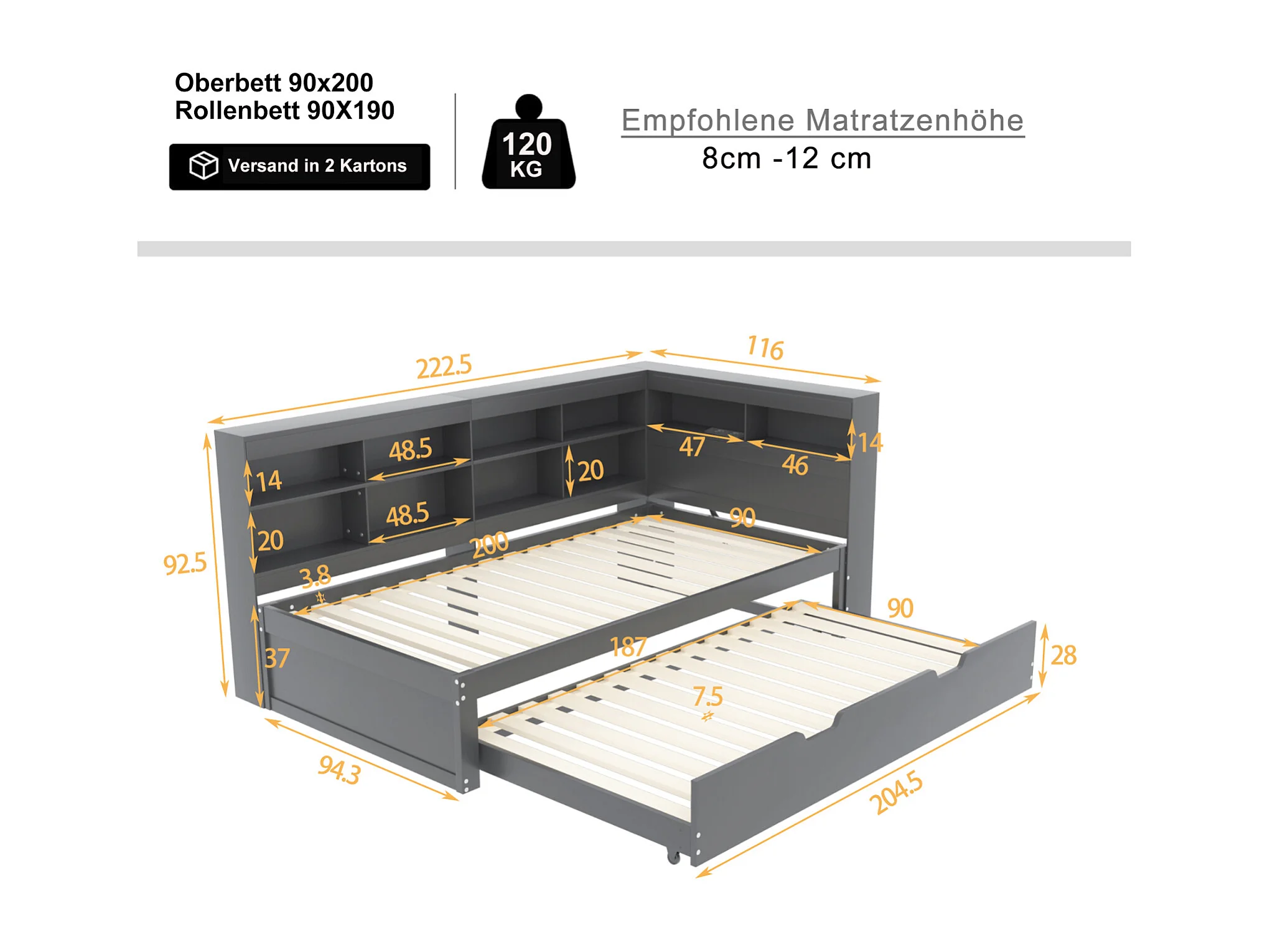 Divano letto estensibile 90/200cm e letto 90x190cm grigio con porta USB e vani portaoggetti – Letto multifunzionale pratico e robusto