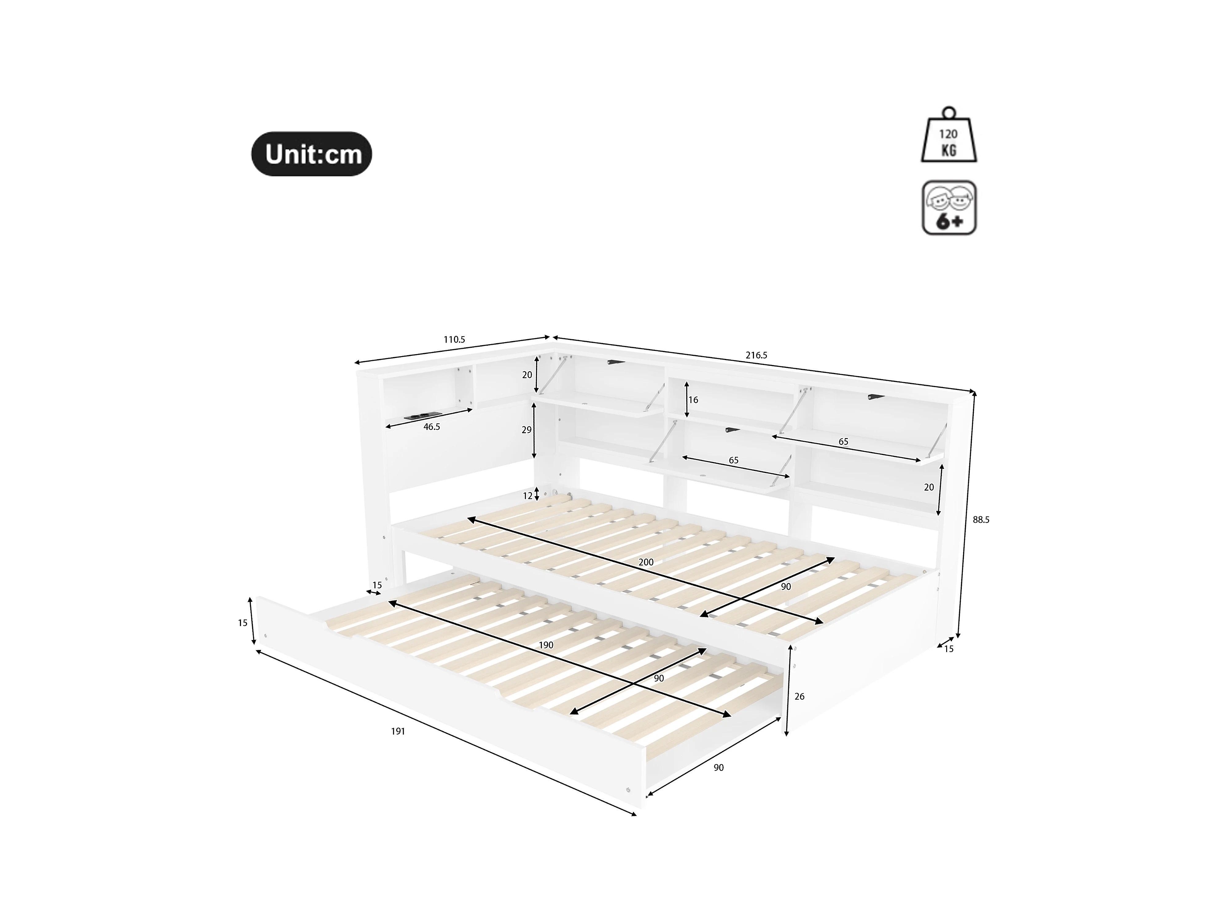 Letto estraibile in legno massello 90x200 cm con porte di ricarica USB - circondato da un cerchio di contenitori - Bianco