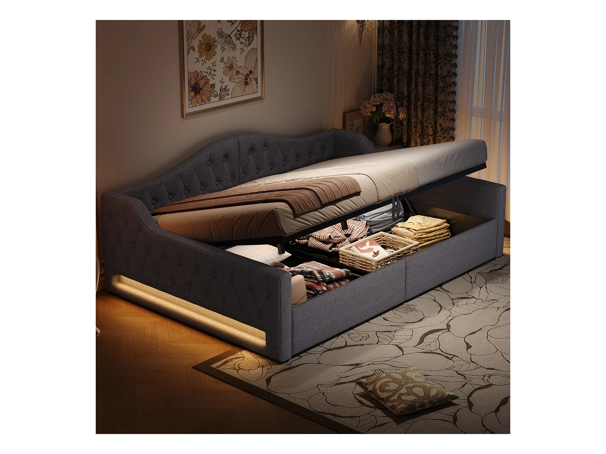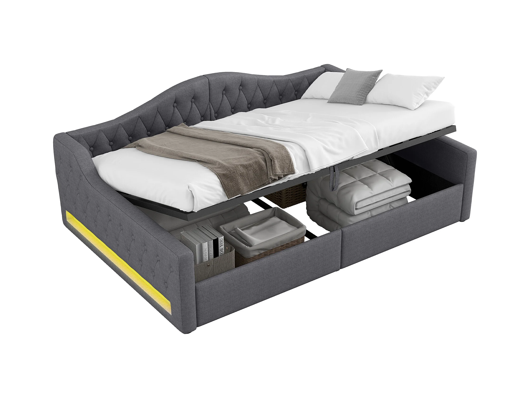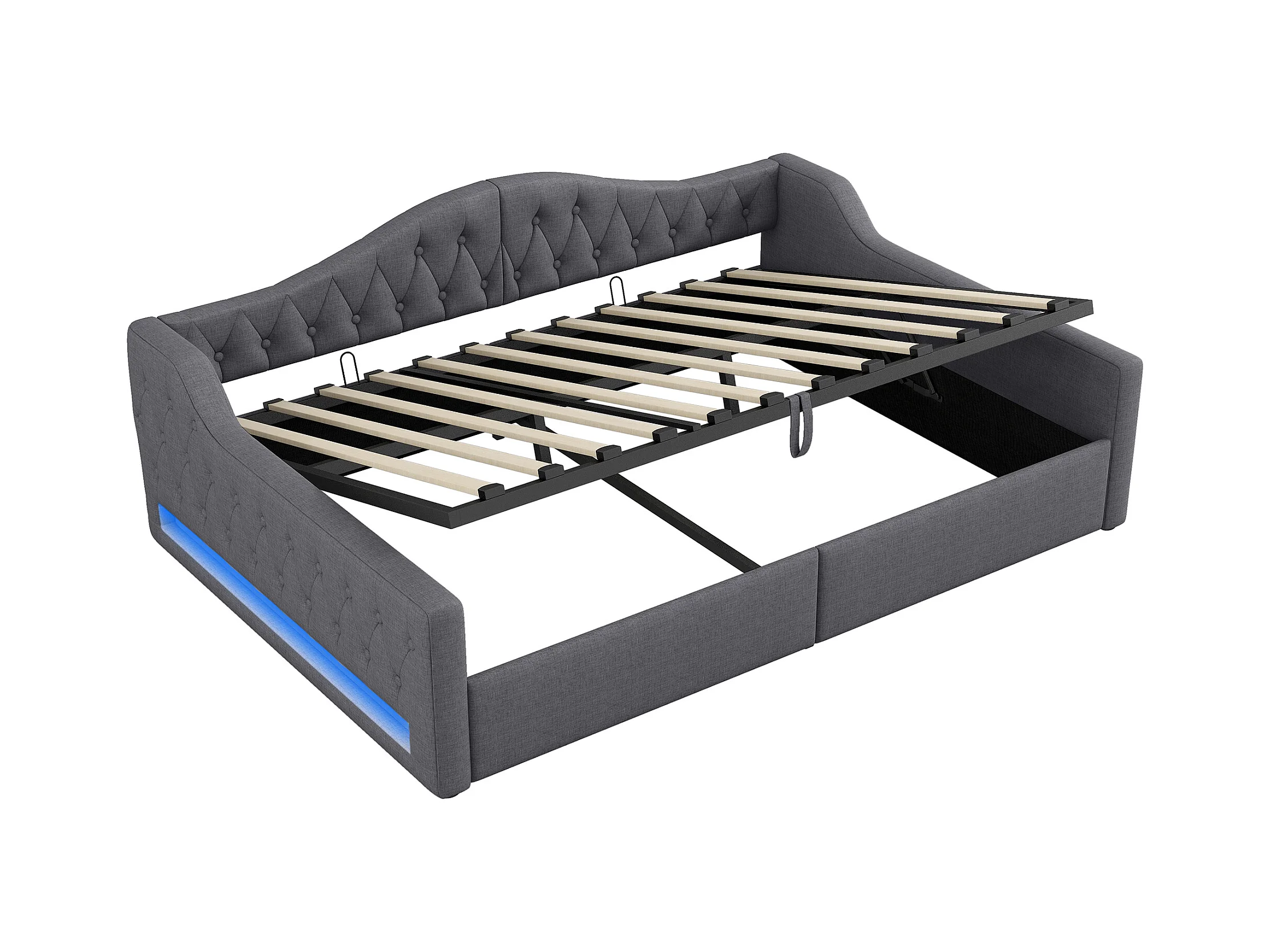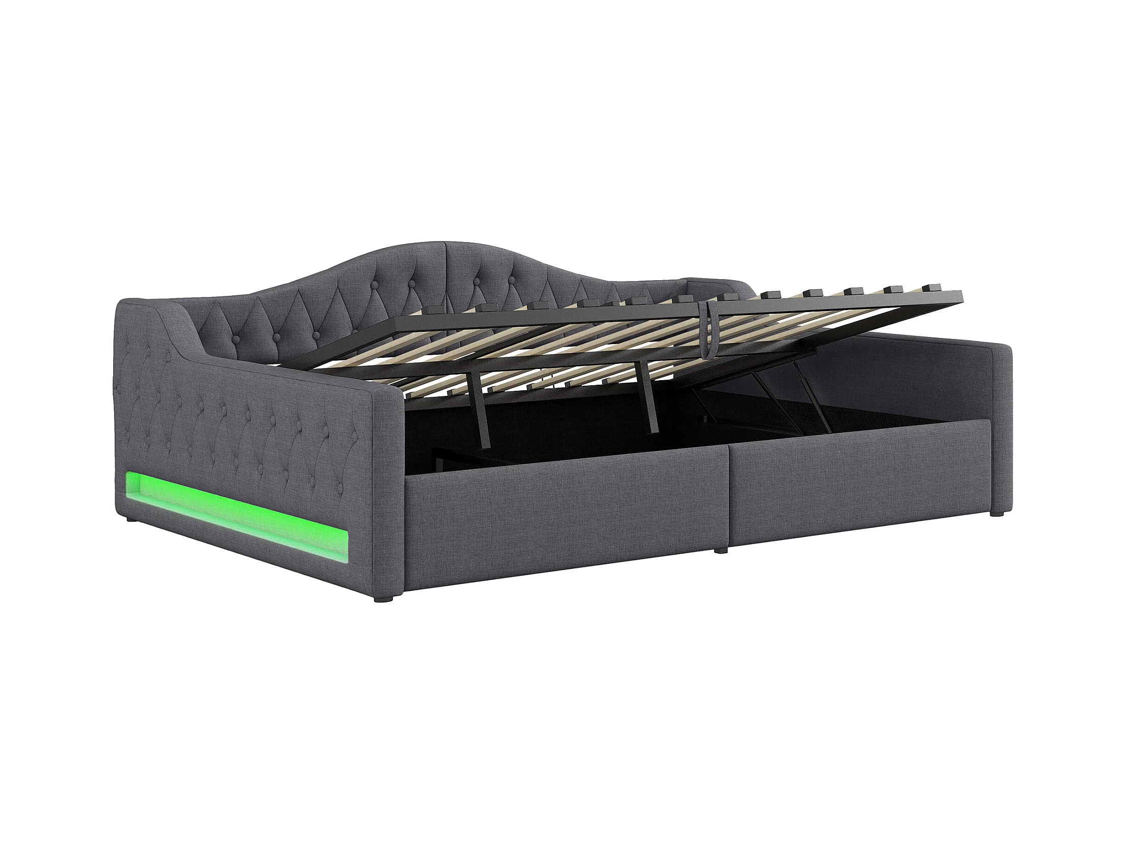 Divano letto imbottito 140×200 cm - con striscia luminosa LED - contenitore - con rete a doghe - grigio